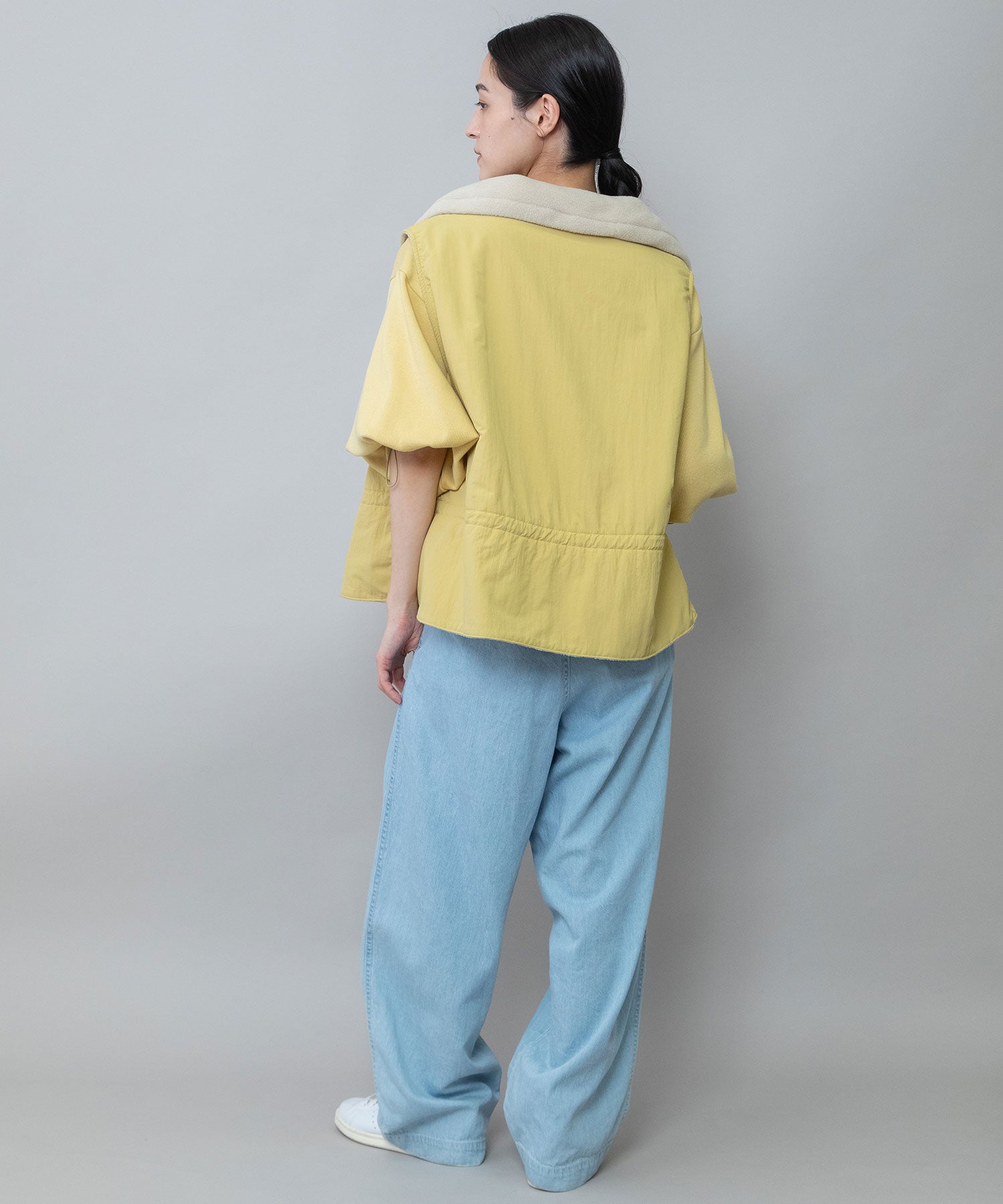 ウエストコードをしっかりブラウジングさせるとペプラムなヘムになるので、より女性的なシルエットに変化します。あらかじめブラウジングして着用することを想定して、衿廻りを大きく展開したスタンドカラーは大き目の配色衿にしたり、くしゅくしゅブラウジングさせたニュアンスのあるスタンドカラーにしたり自在にアレンジして着ることができます。コーデに合わせて表裏どちらでも使えて、少し肌寒さを感じるころから長く活躍するアイテムです。