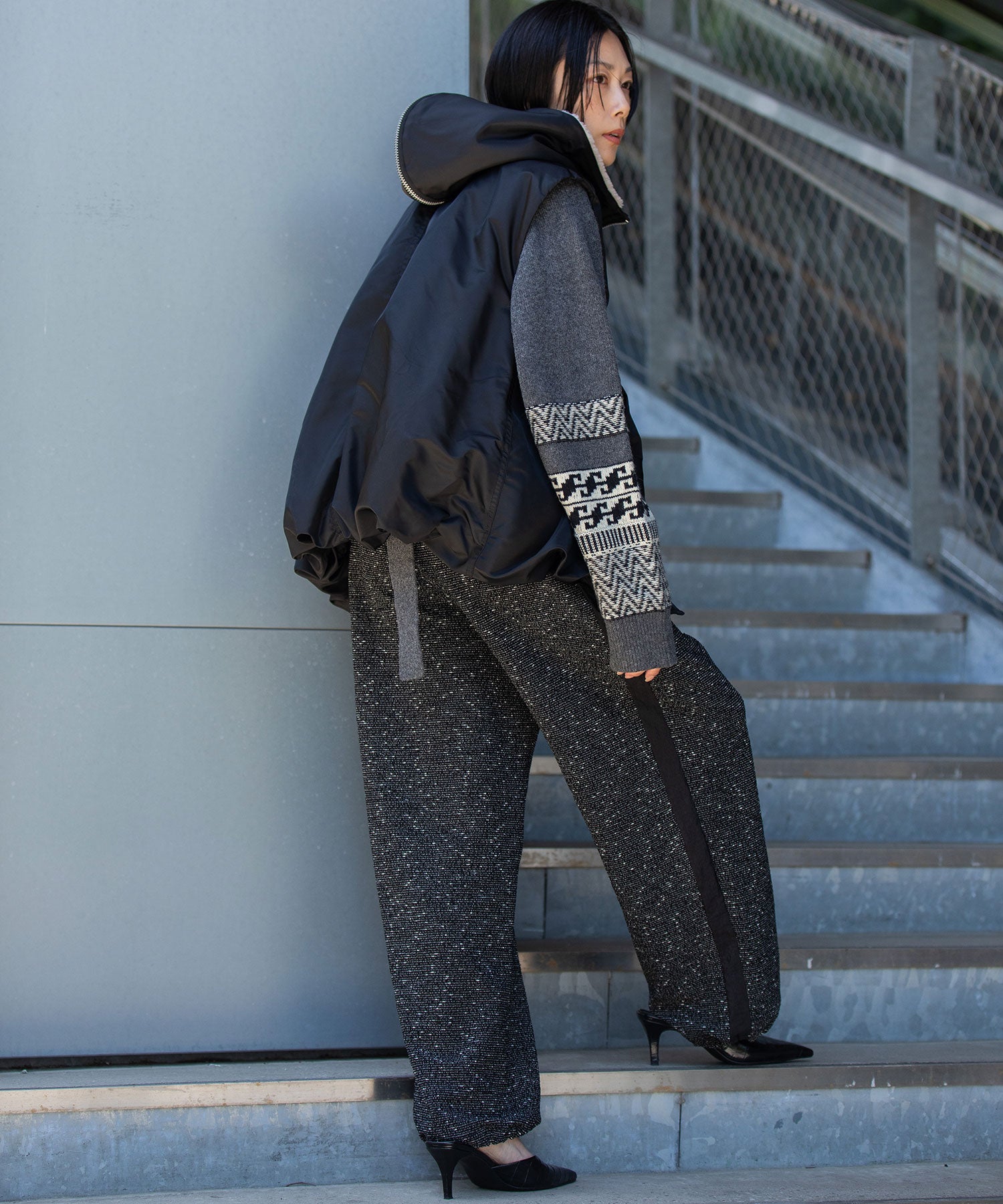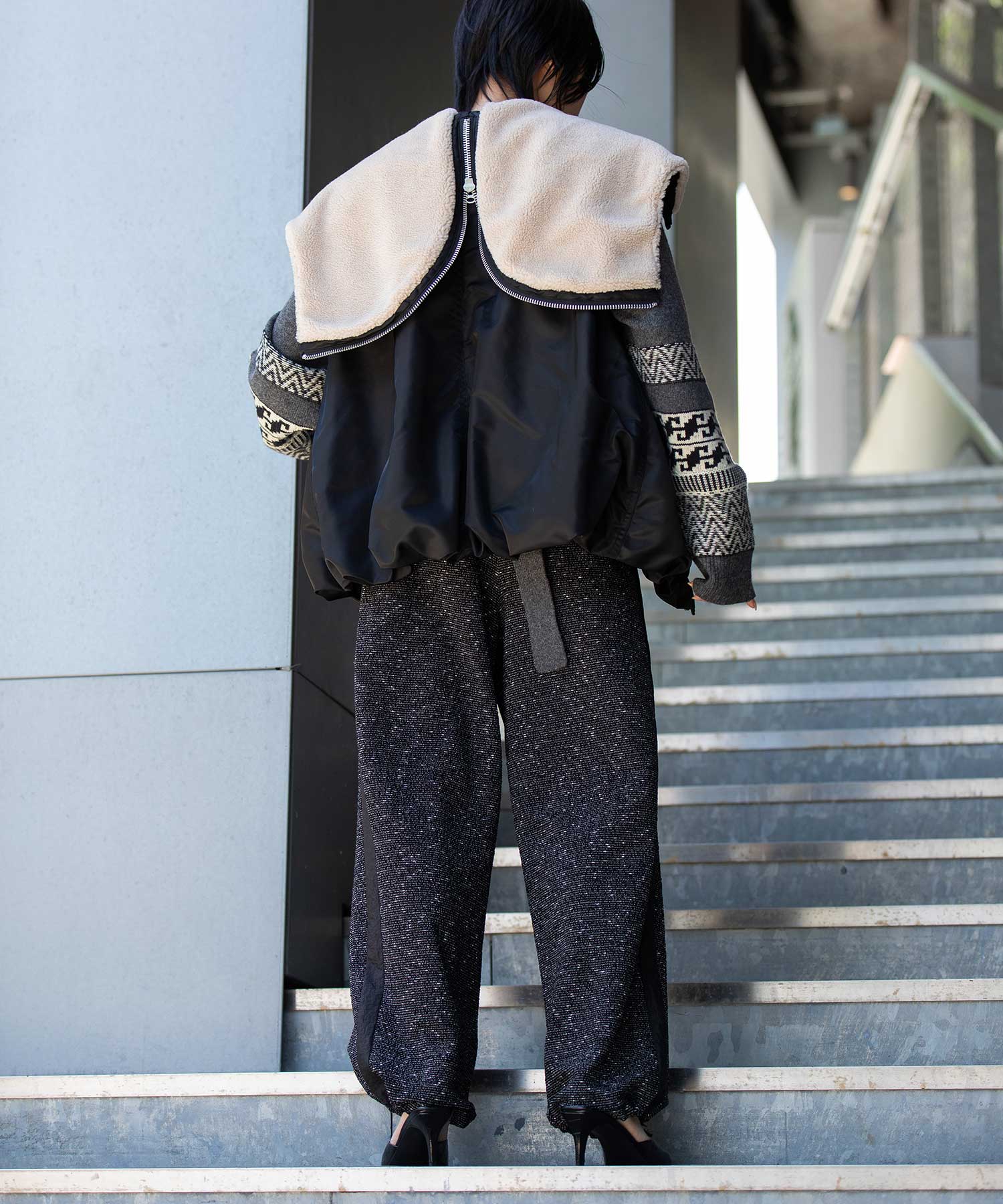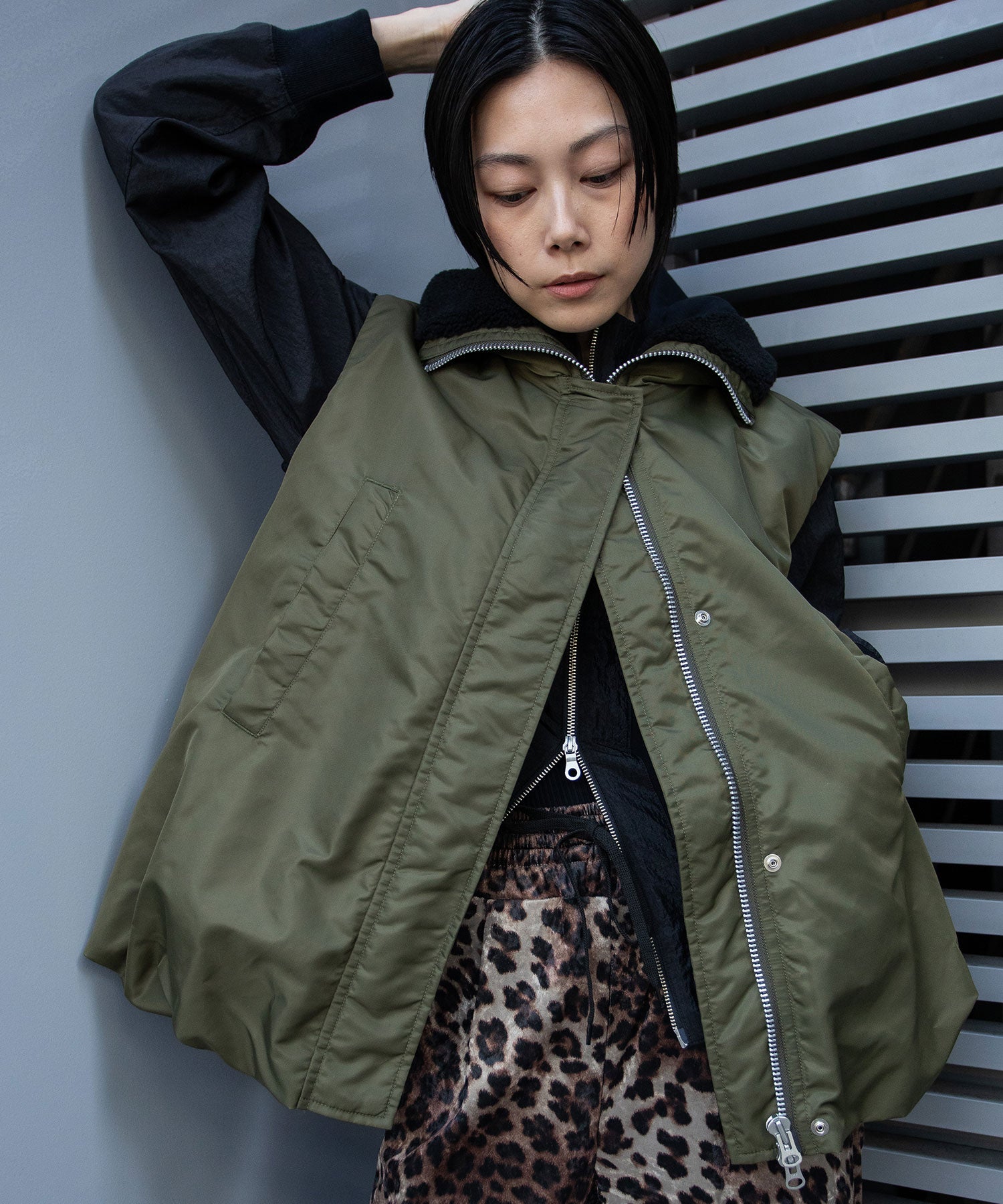 N-2BやN-3Bなどのフライトジャケットをデザインのベースにしたベストで、コールゴムギャザーとタックによるバルーンヘムでシルエットにアクセントを加えました。
