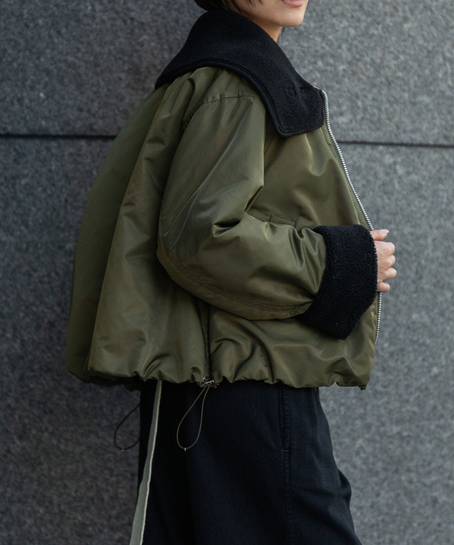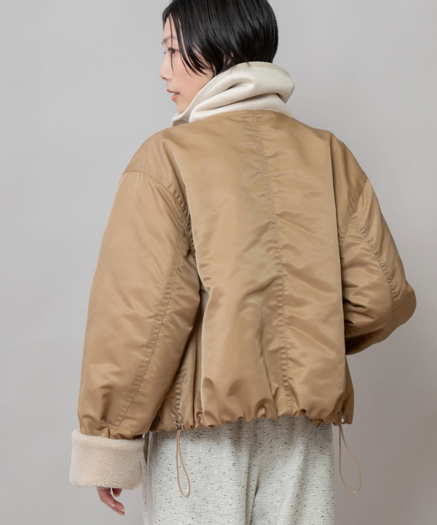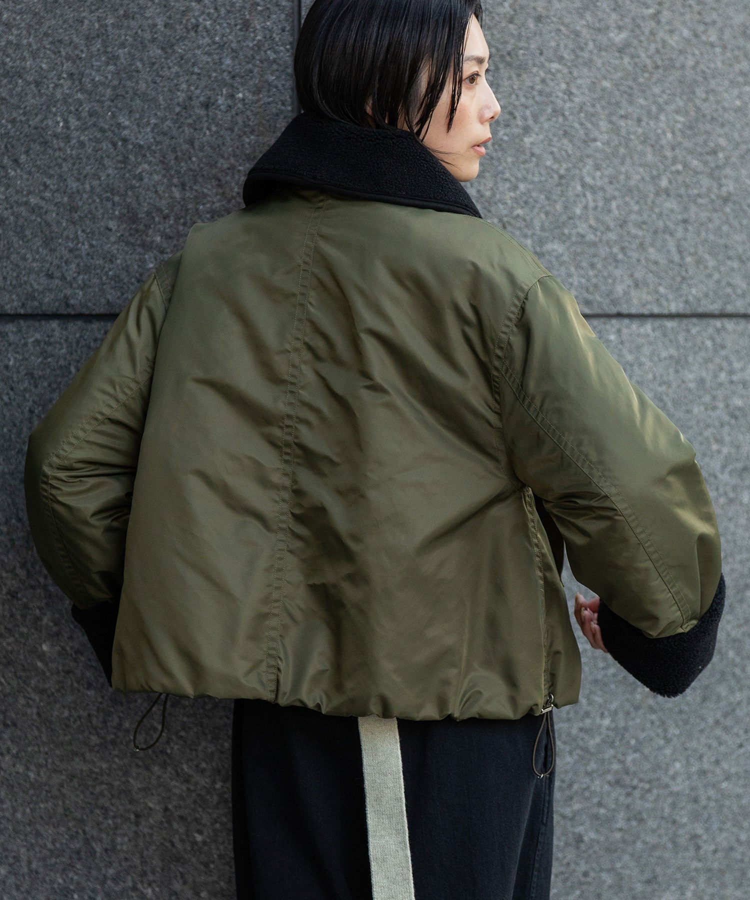 裾にドローコードを通す事で丸みのあるフォルムを作り、抜けのあるシルエットを短すぎないショート丈で好バランスに仕上げることで、大人の女性が着用しやすいデザインに仕上げました。