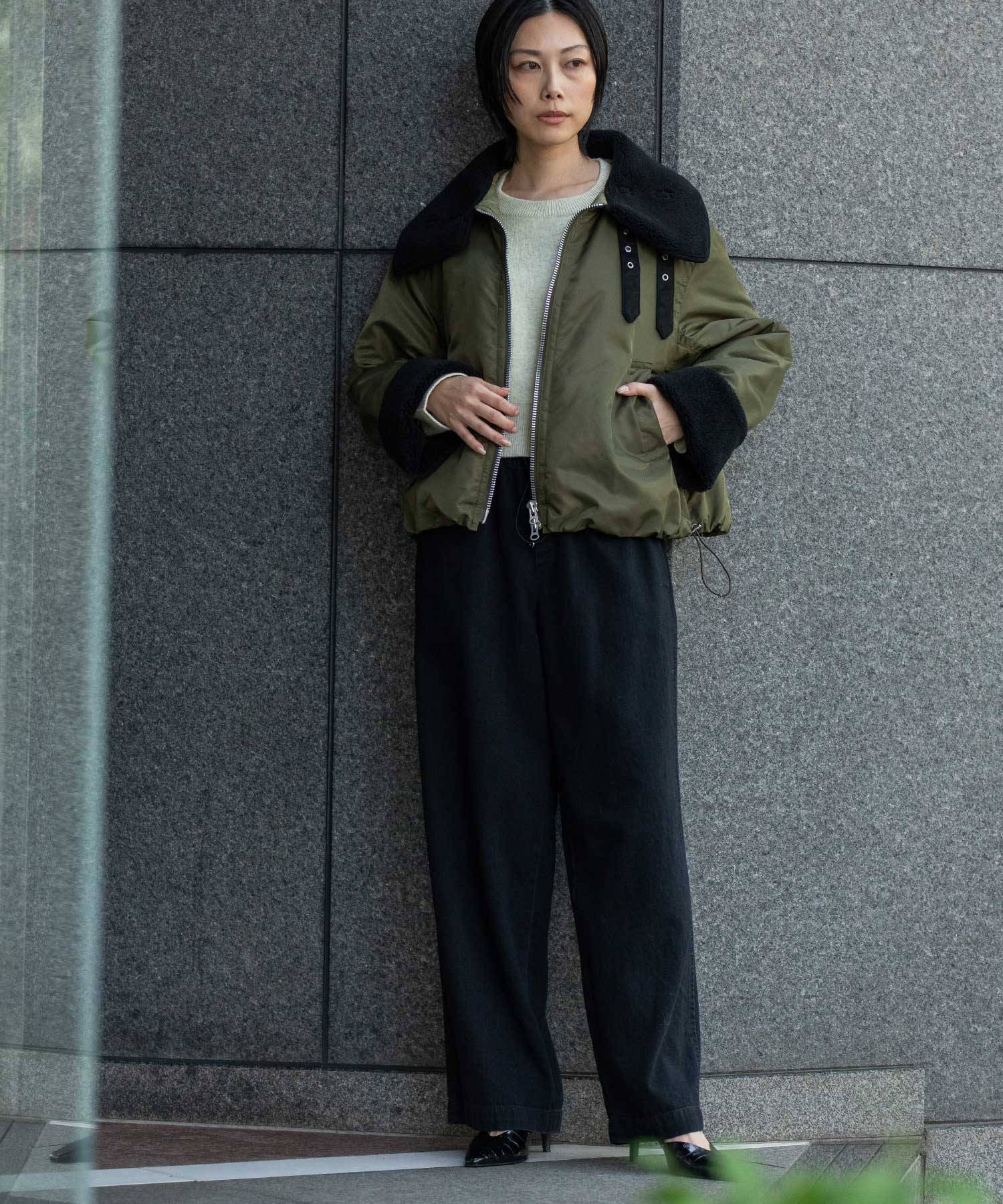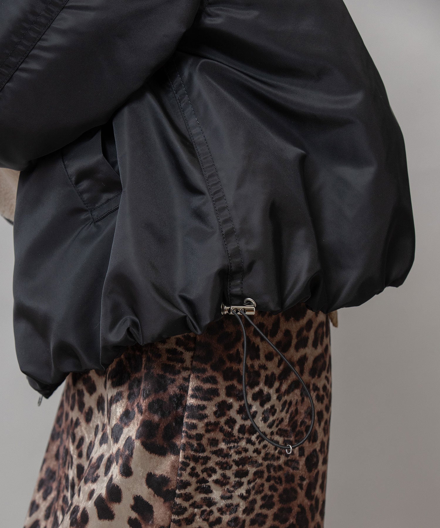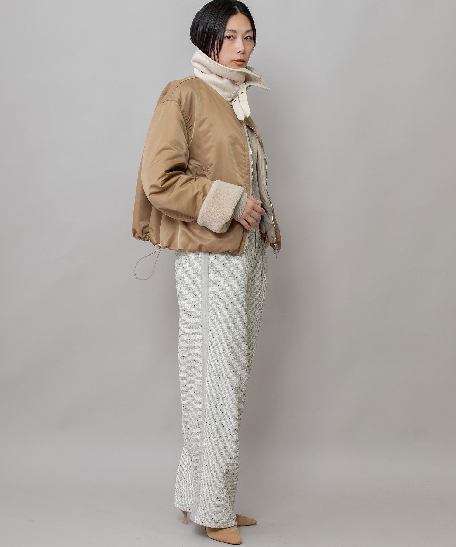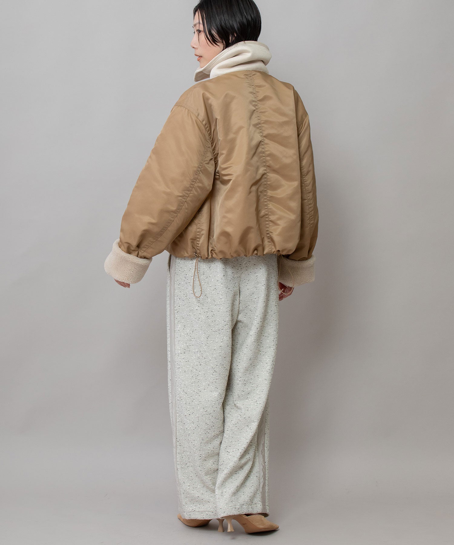 裾にドローコードを通す事で丸みのあるフォルムを作り、抜けのあるシルエットを短すぎないショート丈で好バランスに仕上げることで、大人の女性が着用しやすいデザインに仕上げました。