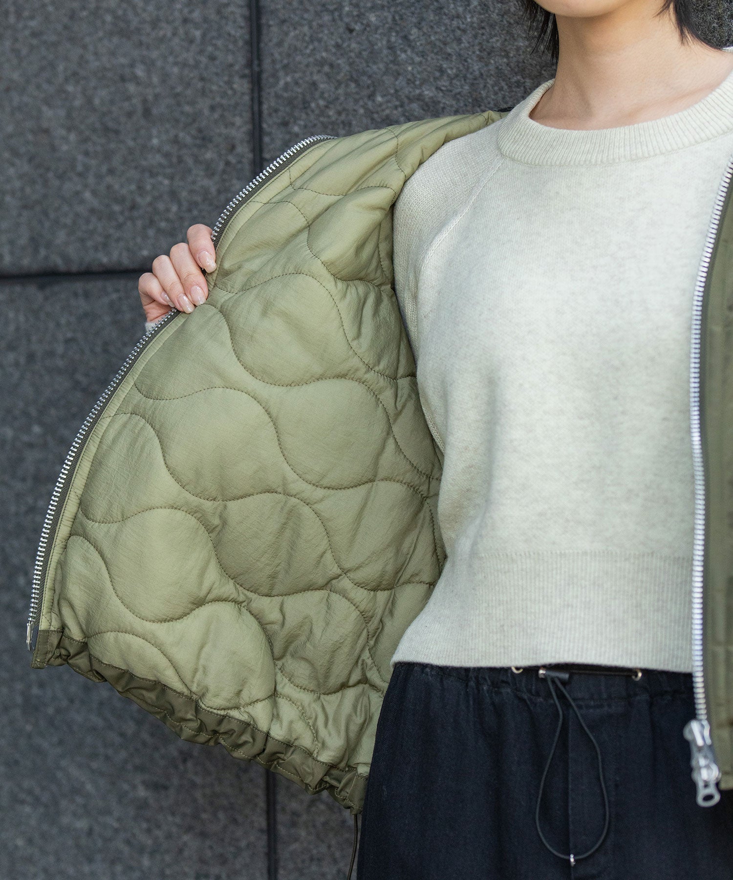 キルティング裏地の中綿はデュポン社の〈sonora AURA〉の100g/㎡を使っています。