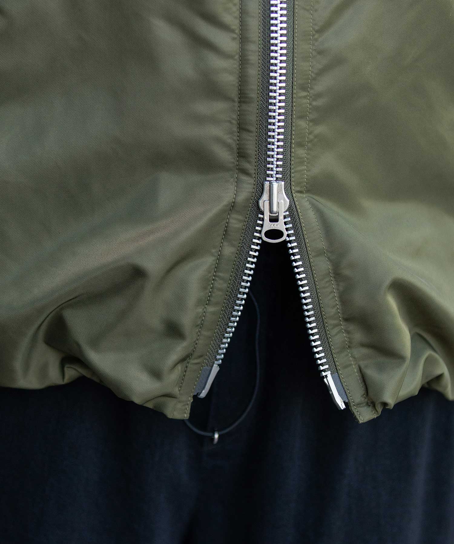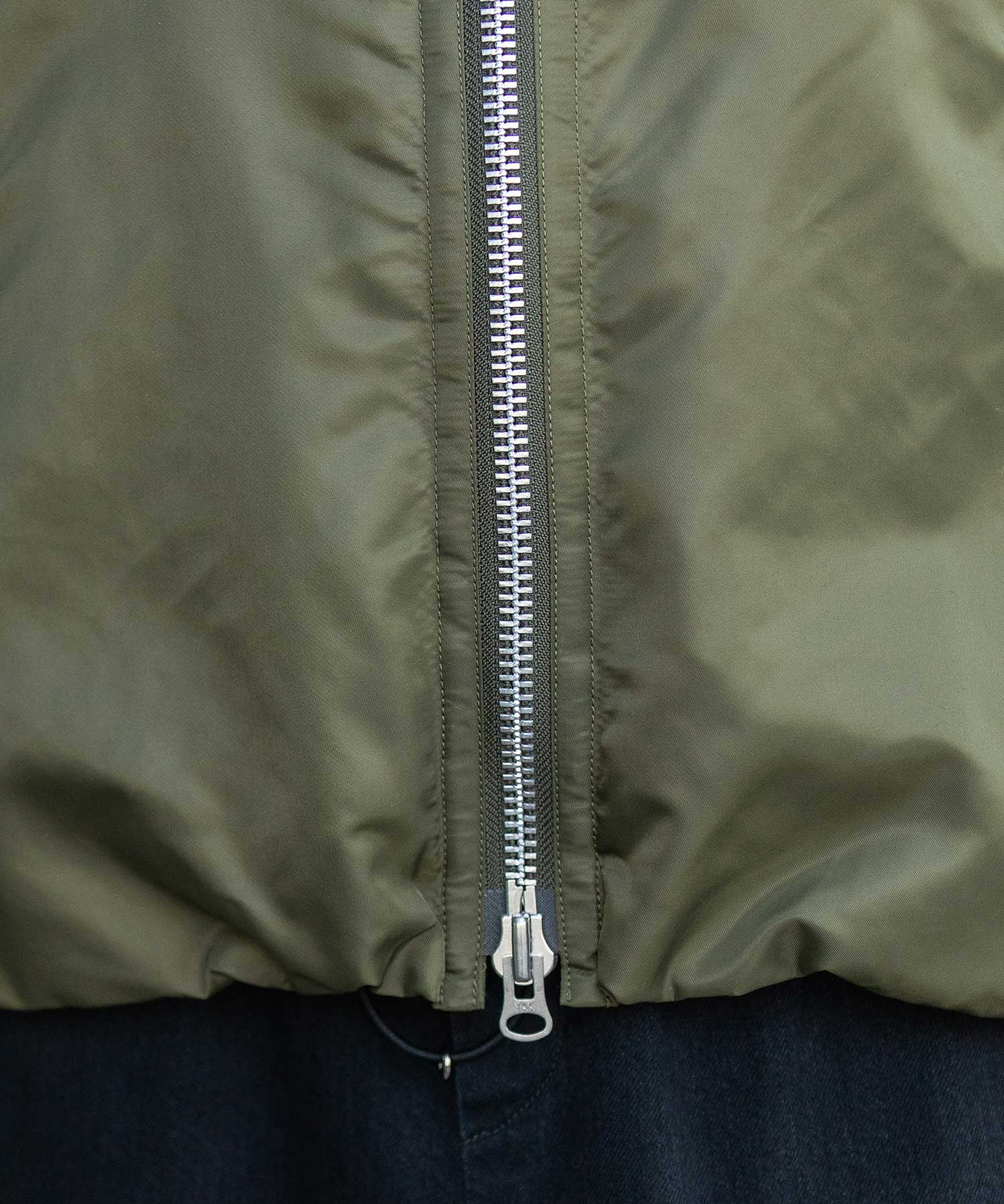 フライトジャケットなどに用いられるブライトナイロンツイルの表地にsonora AURA中綿をひょうたんキルトしたペーパーライクな軽量タフタ裏との組み合わせです。