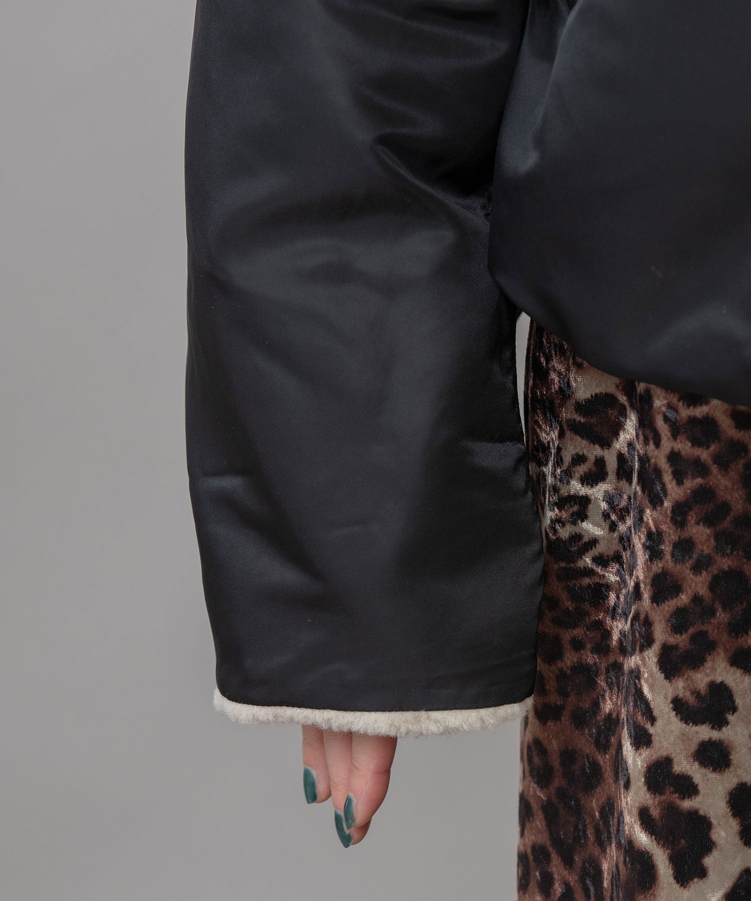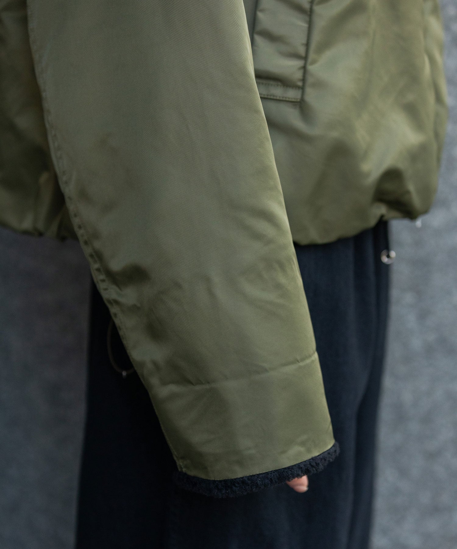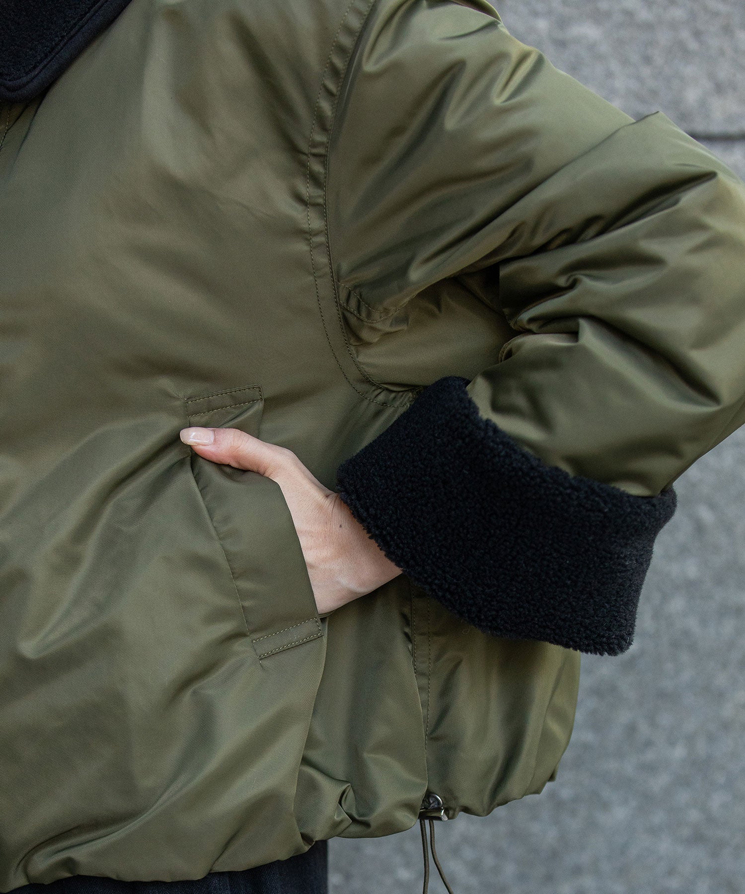 袖丈は長めに作られていて、袖口裏側にボアを施しているので、自分好みにロールアップしてボアの分量感の変化もお楽しみ頂けます。