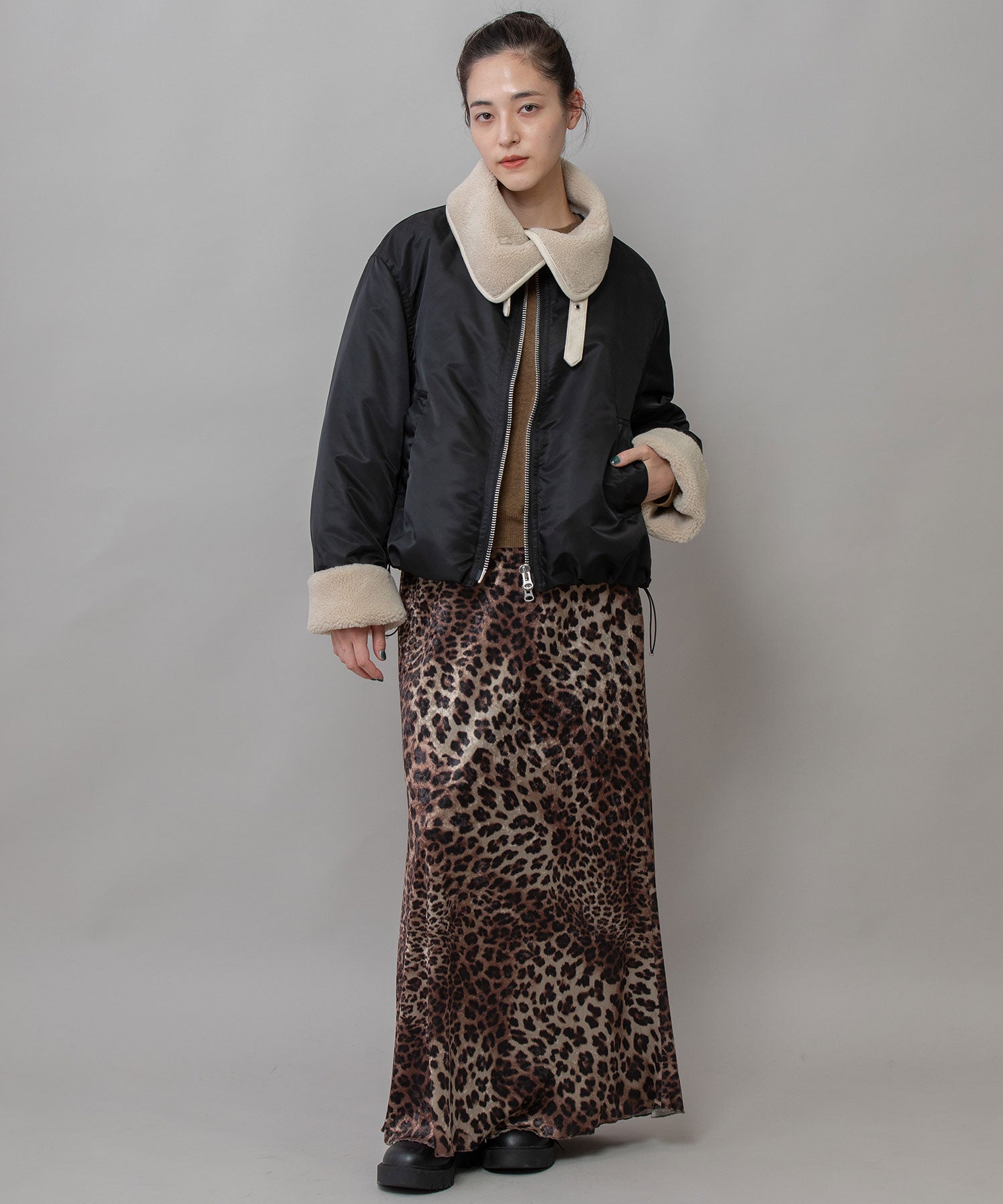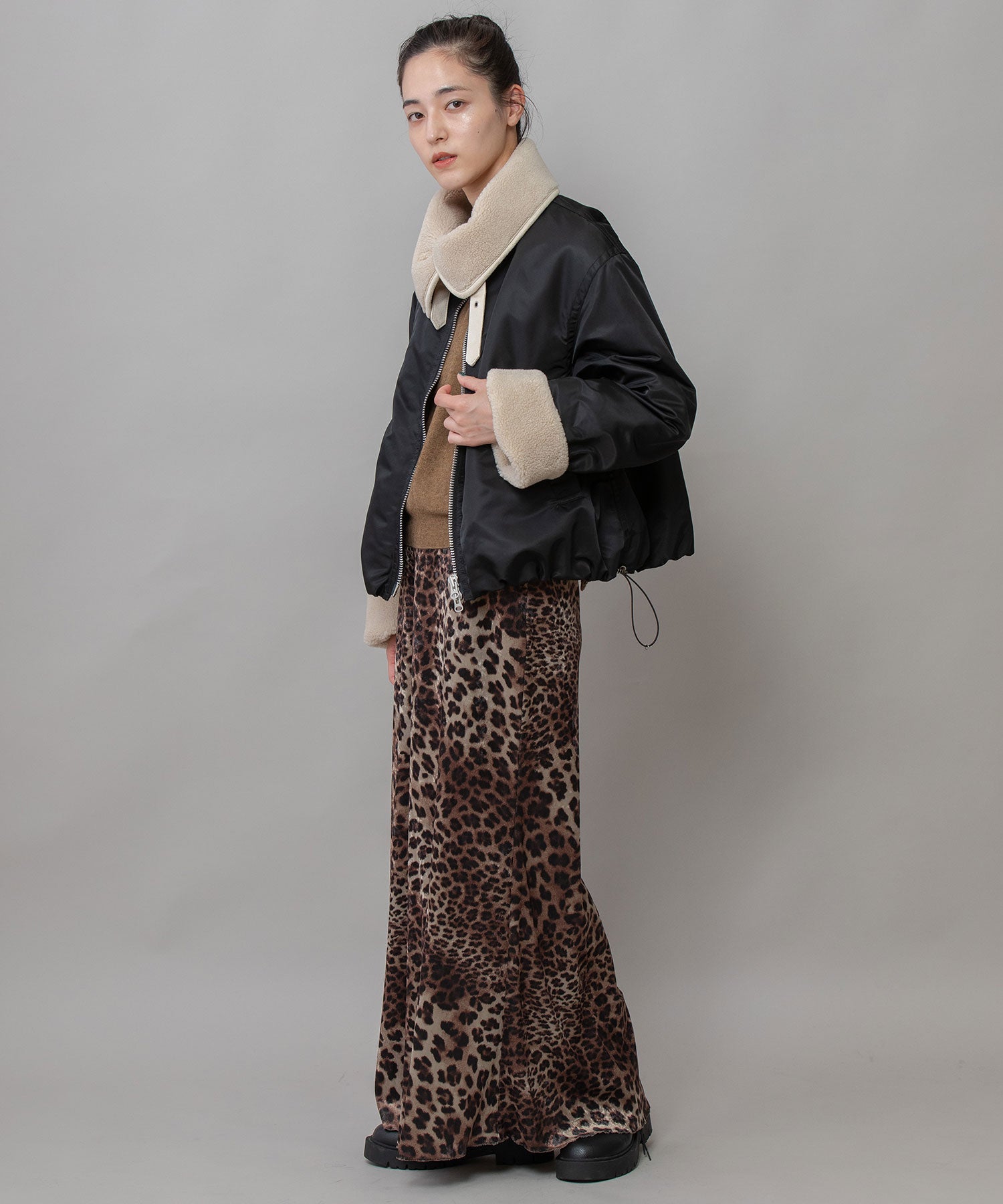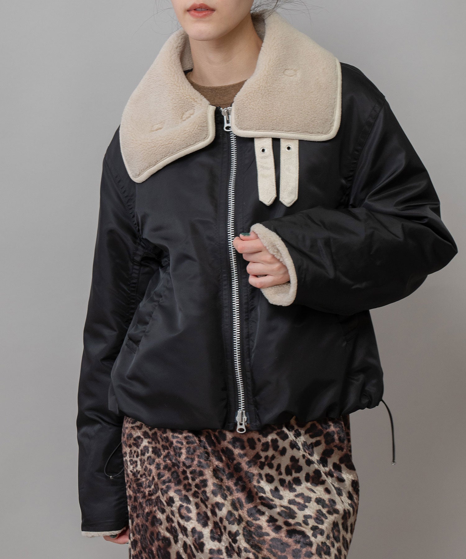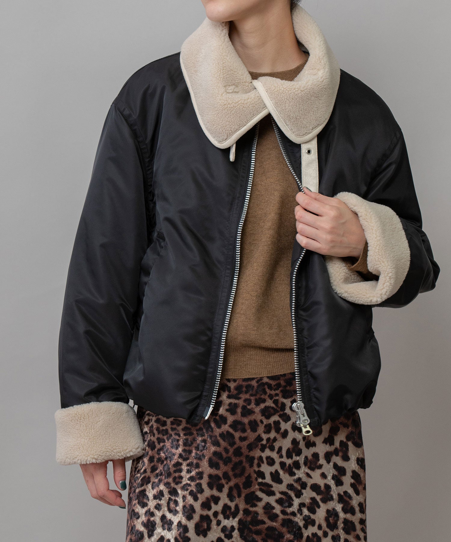 B-3などムートン/レザーのボマー/フライトジャケットをデザインソースにしたドッキングボアジャケット。
