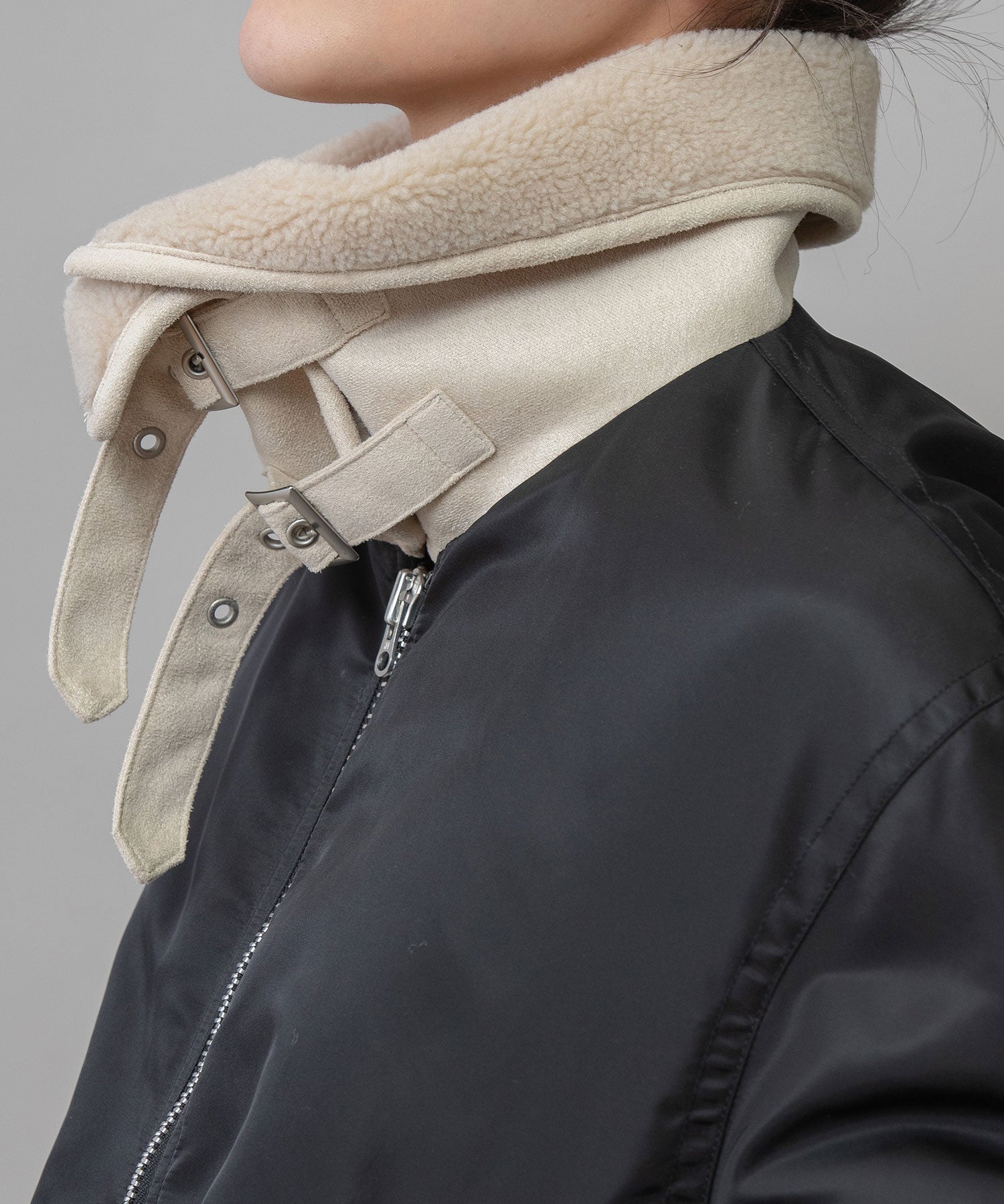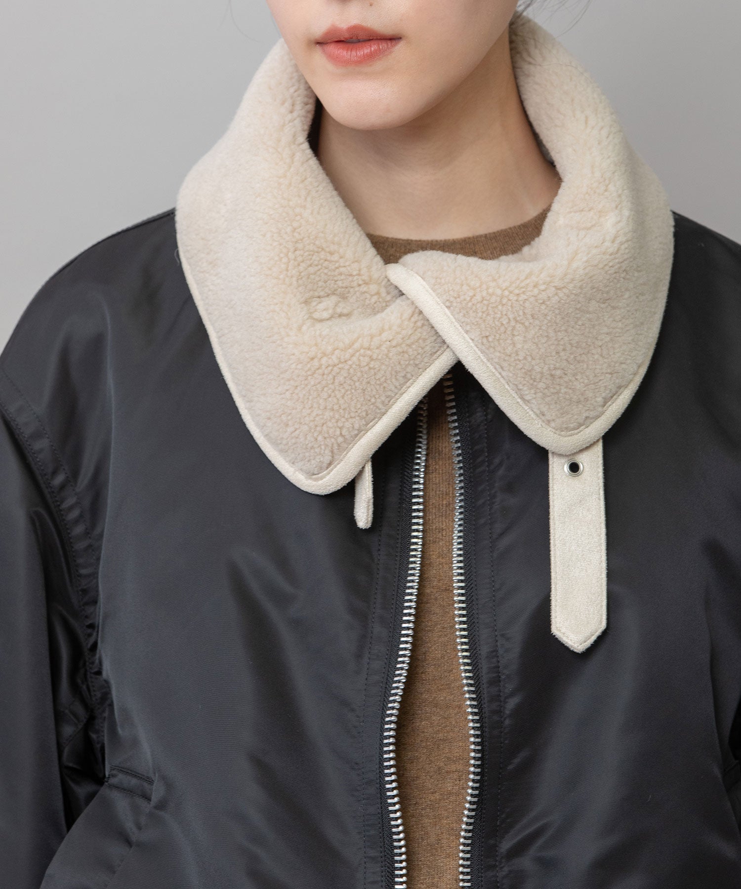 大きめに作られたボア衿は首元を暖かく包み込み、スタンドにしてベルトで留められるデザインなので、気候や気分に合わせてスタイリングを楽しめます。