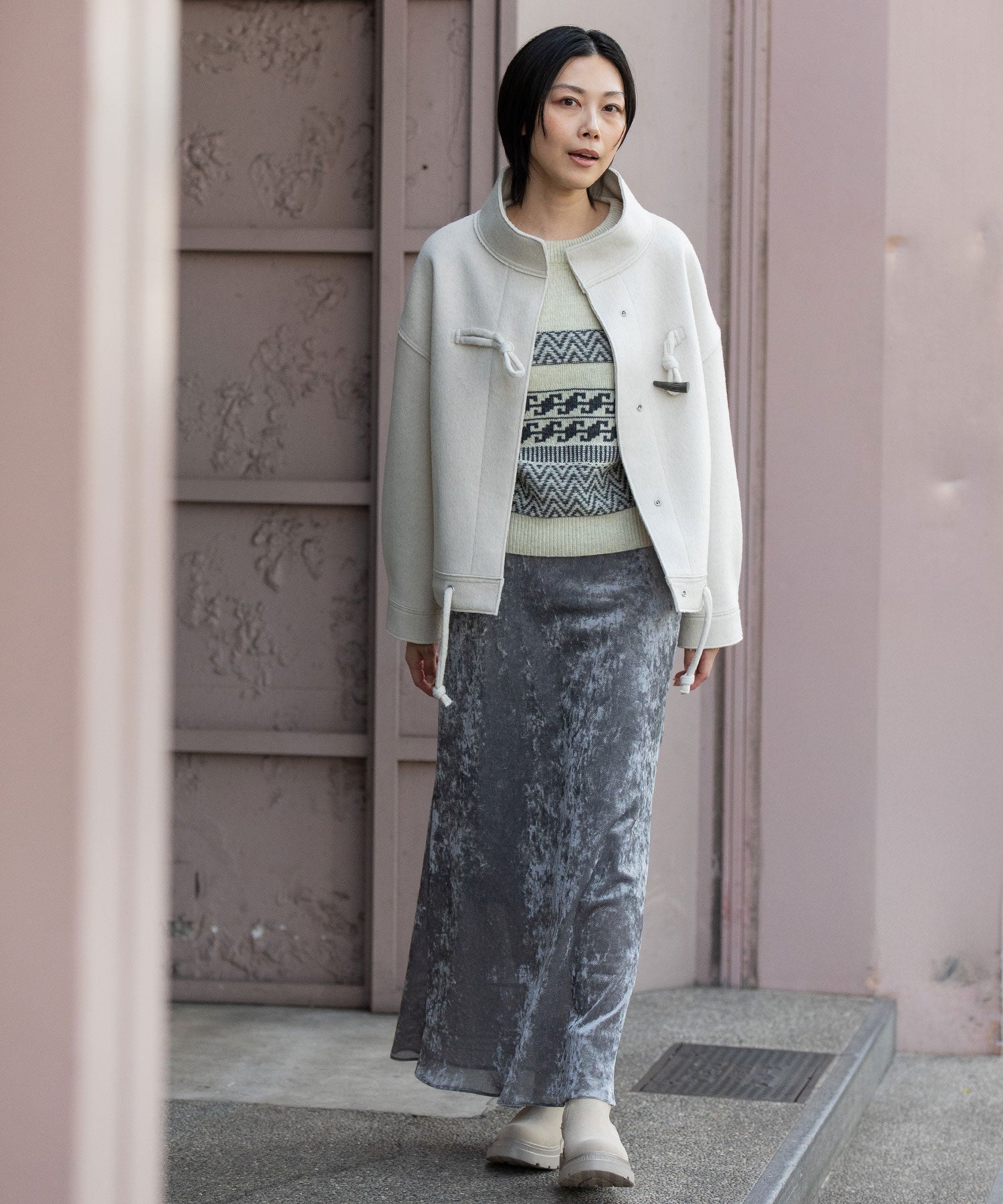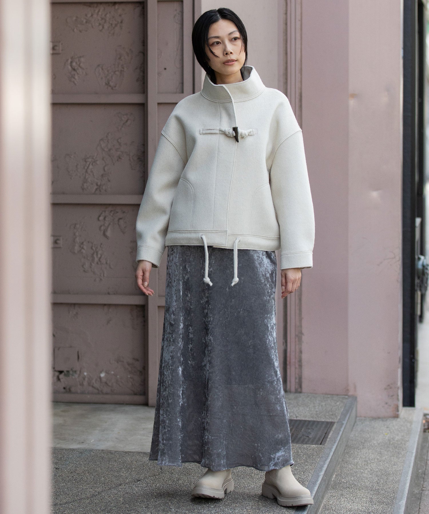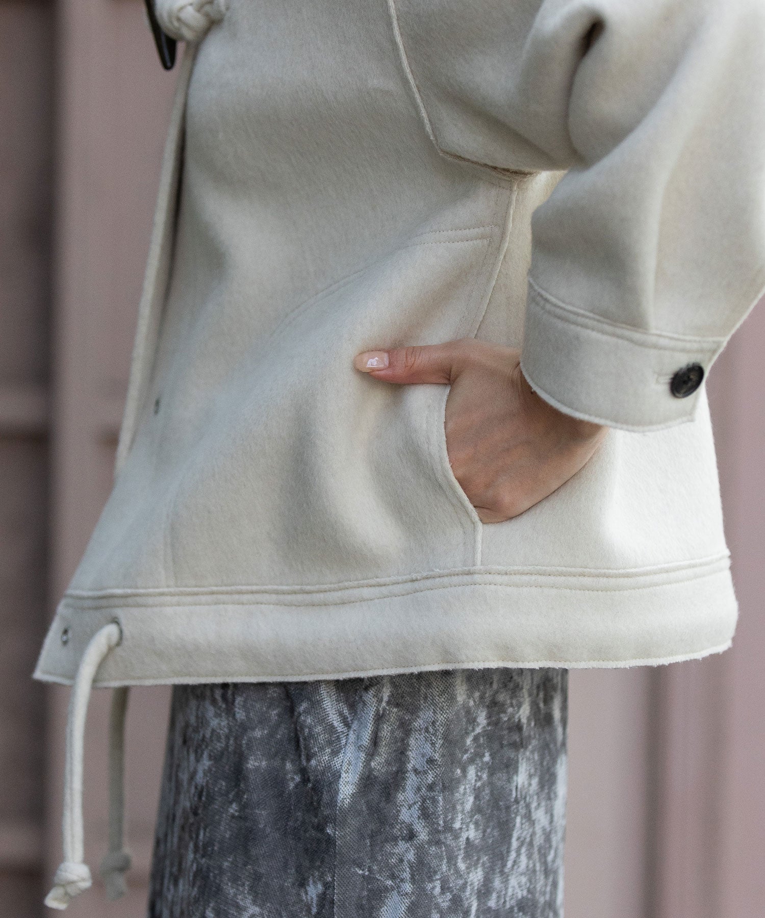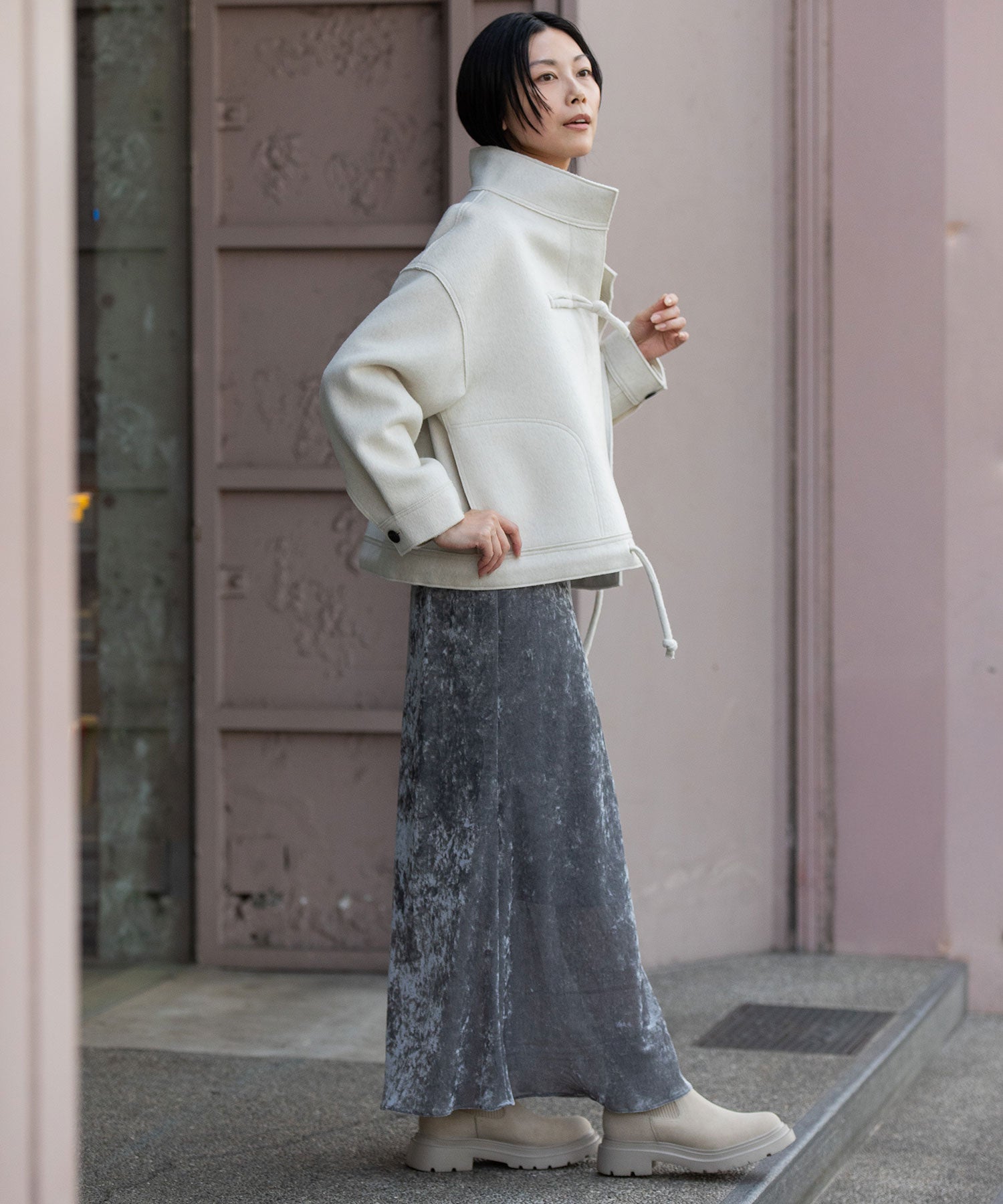 裾やトグルにロープでなく共地を袋にした紐使いにしてダッフルのマリンやトラッドライクなイメージを少し控えてシック寄りでコンテンポラリーな雰囲気にまとめられていると思います。