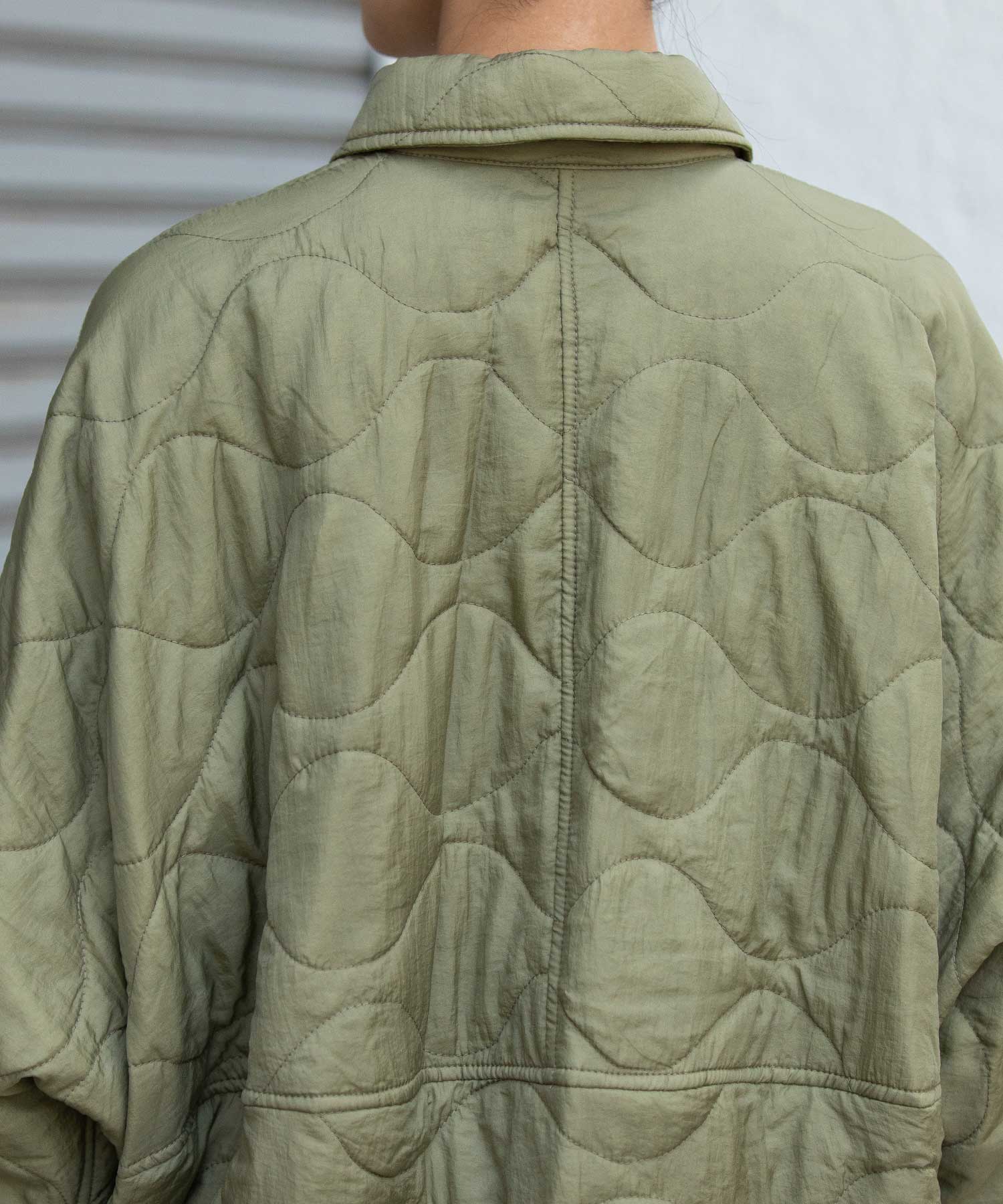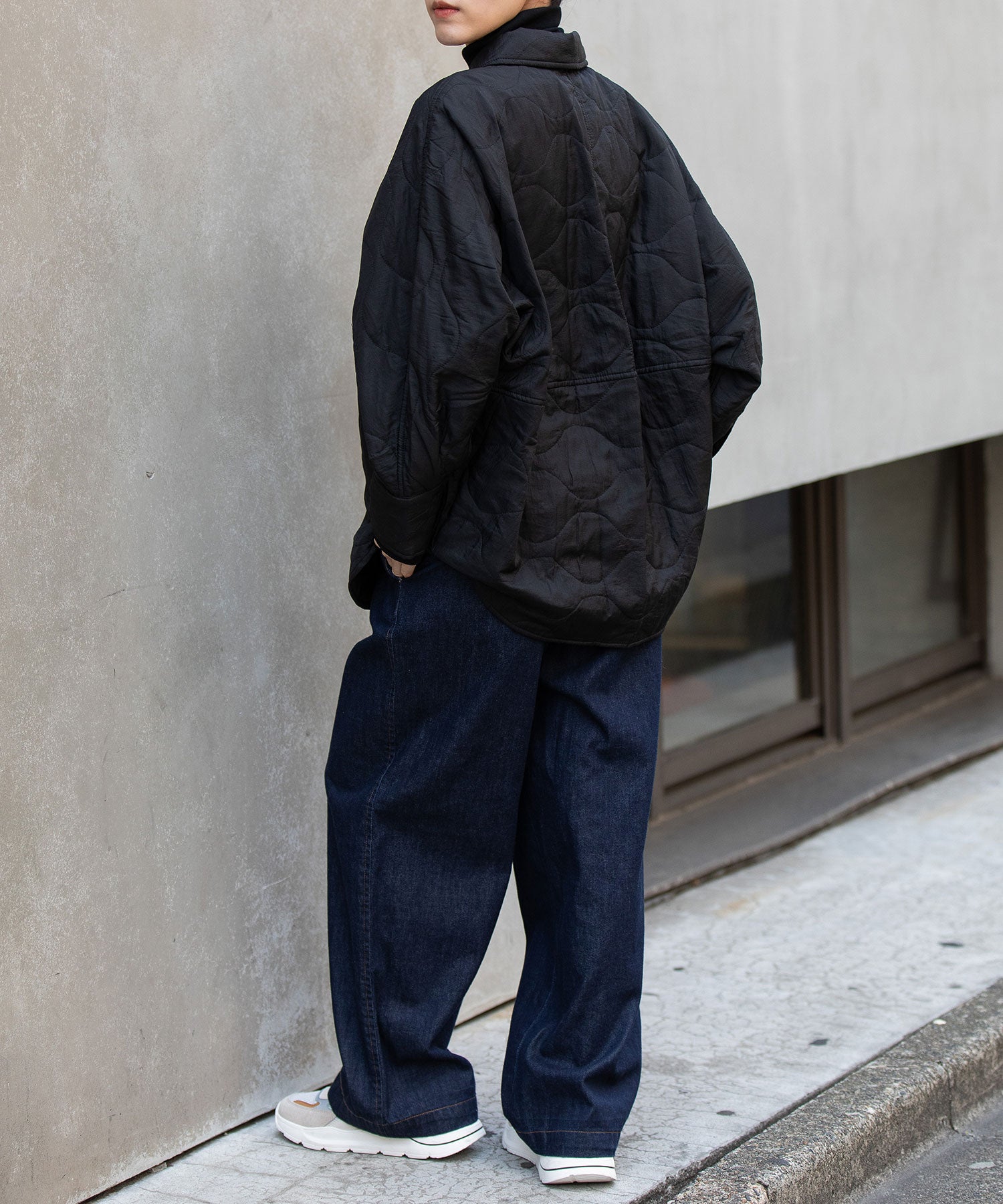 前後のサイズバランスに大きく差をつけ、後ろ身頃を上下に展開して丸みのあるバレル状のサイド/バックスタイルにすることで普通に羽織っても抜け感のあるシルエットになります。