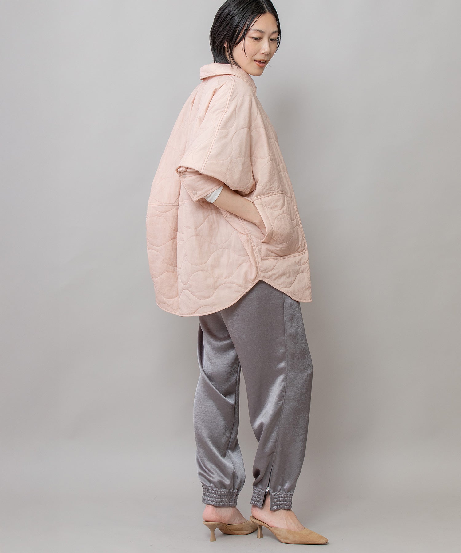 ペーパーライクな極細番手の糸を使った軽量タフタで40gのsonora AURA中綿をサンドしてひょうたんキルトを施しています。