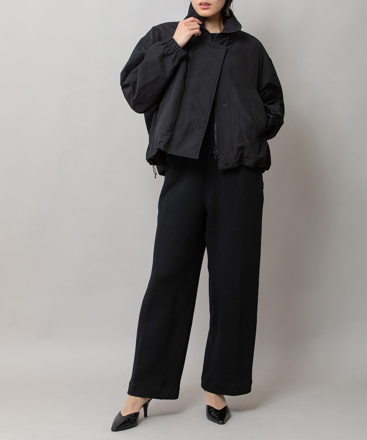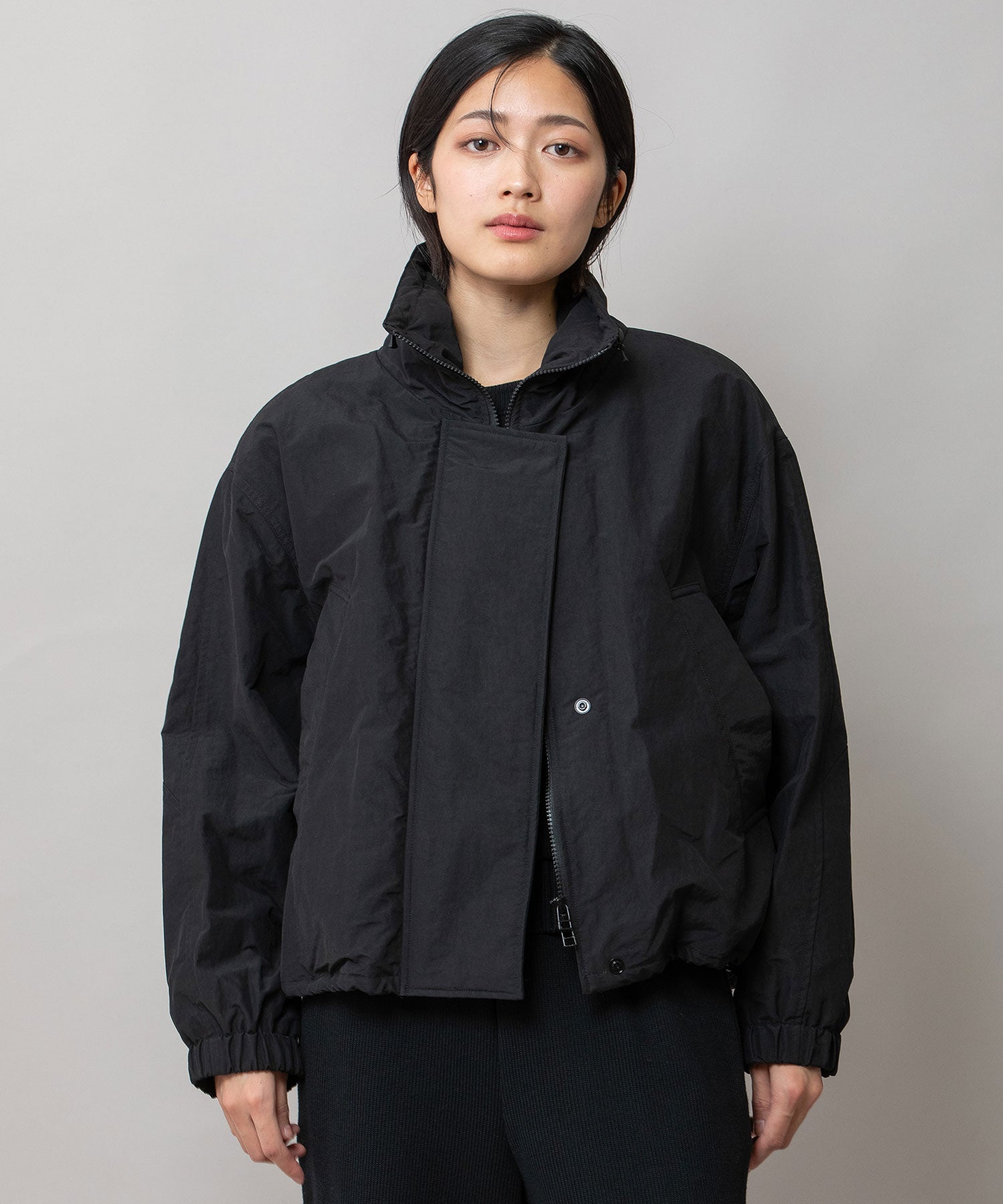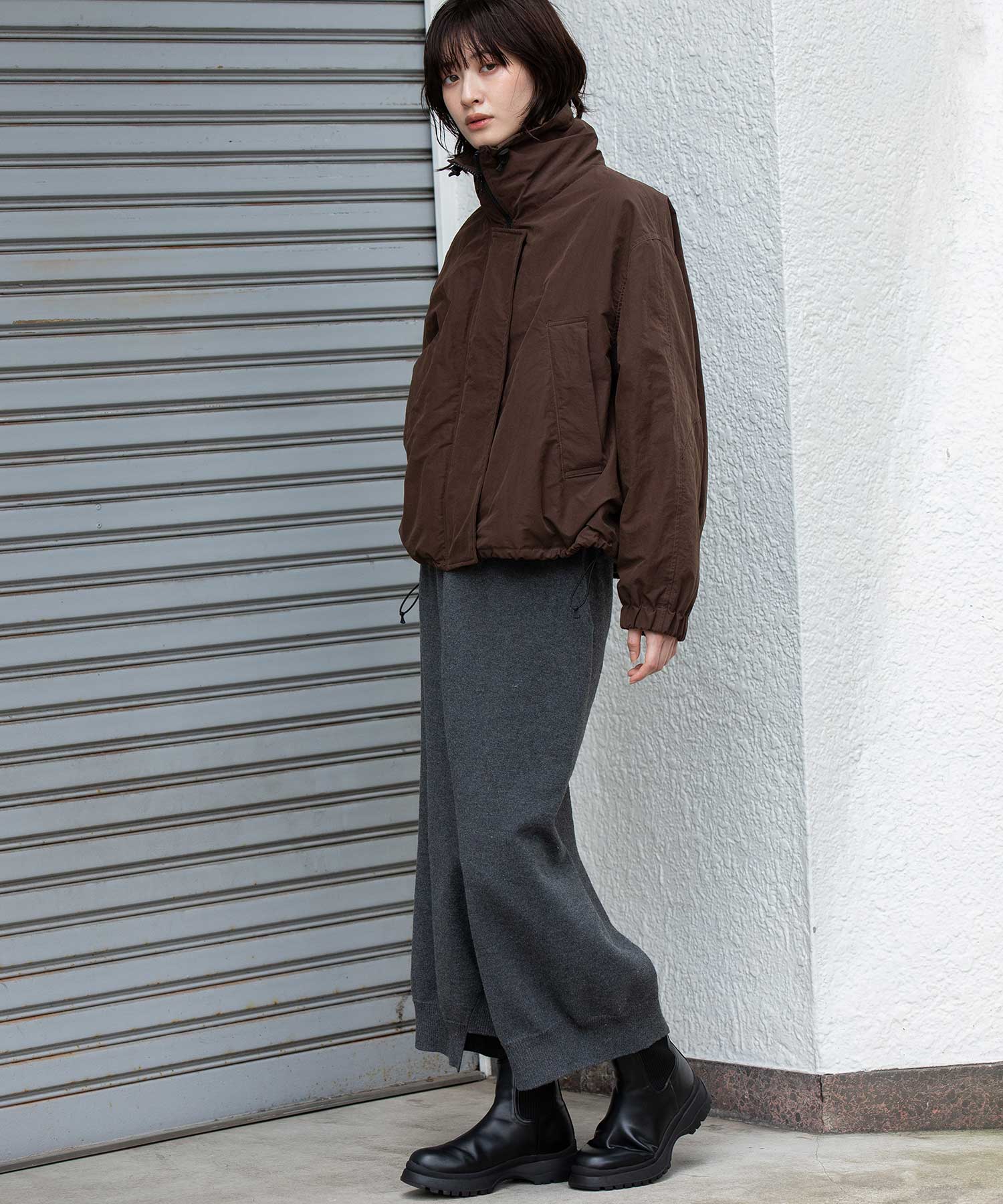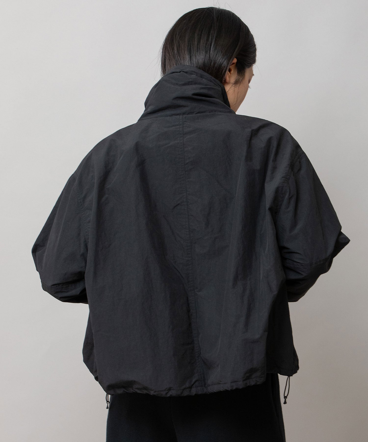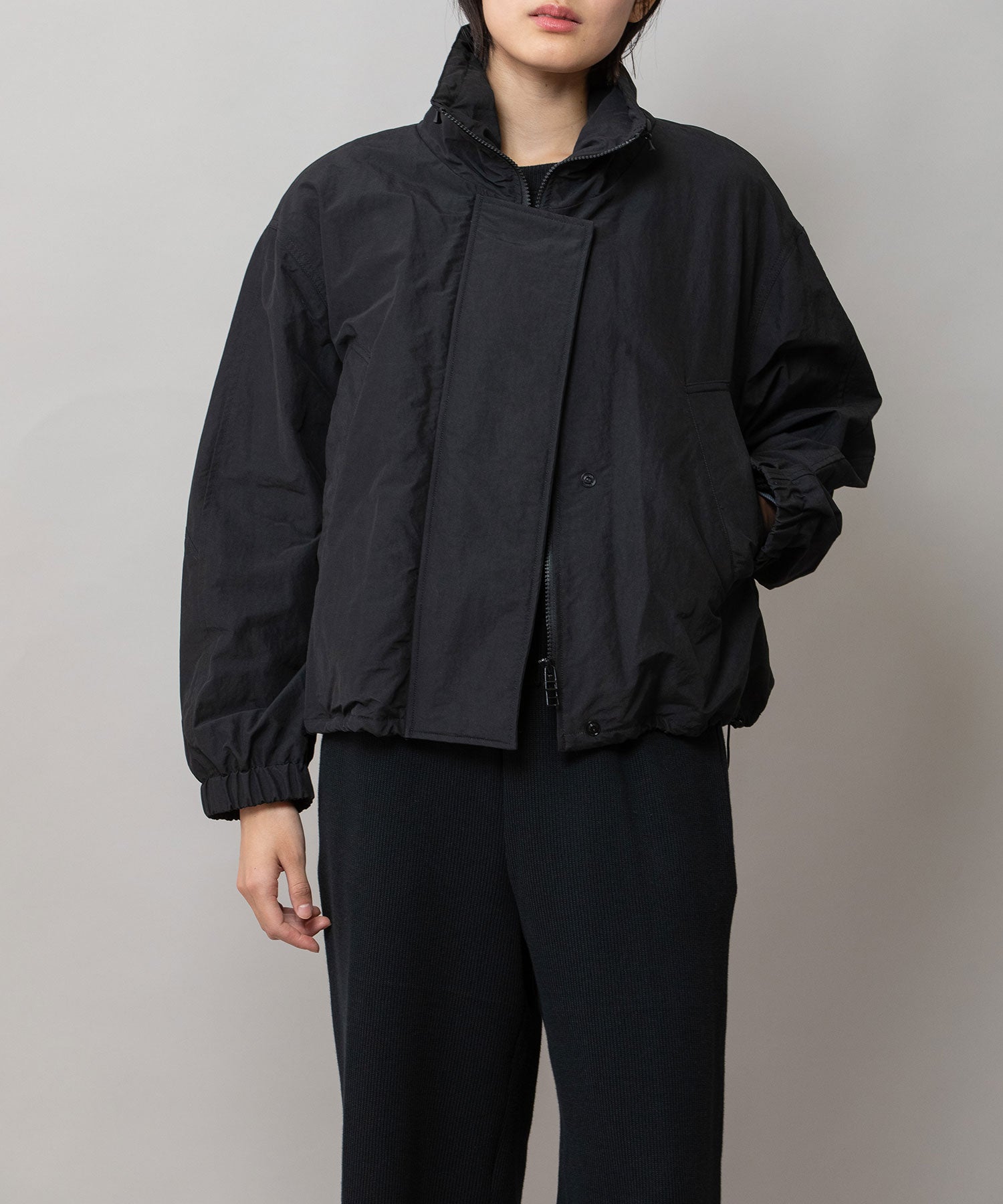 スタンドカラーと身頃裾はストレッチコードでブラウジング可能です。