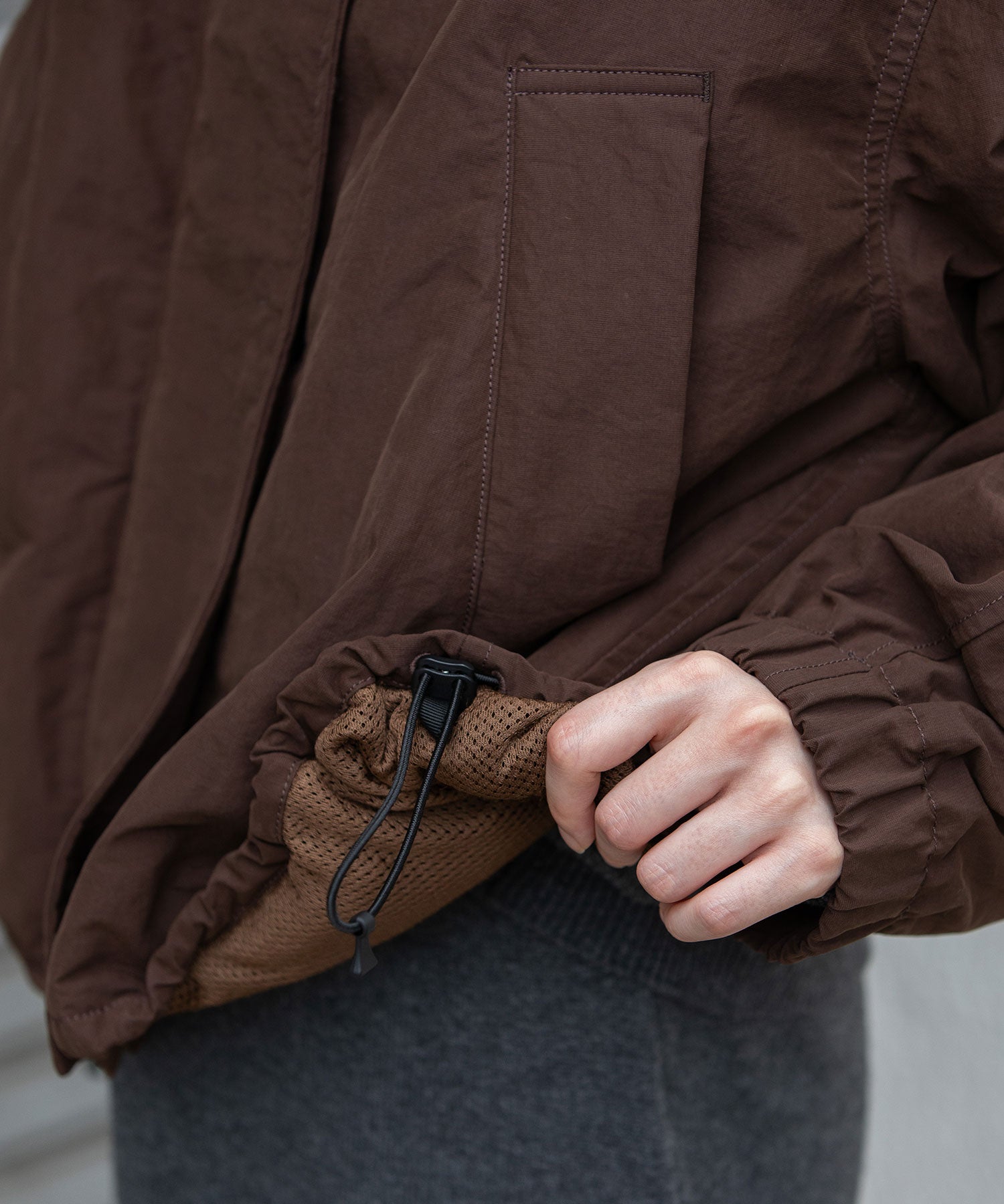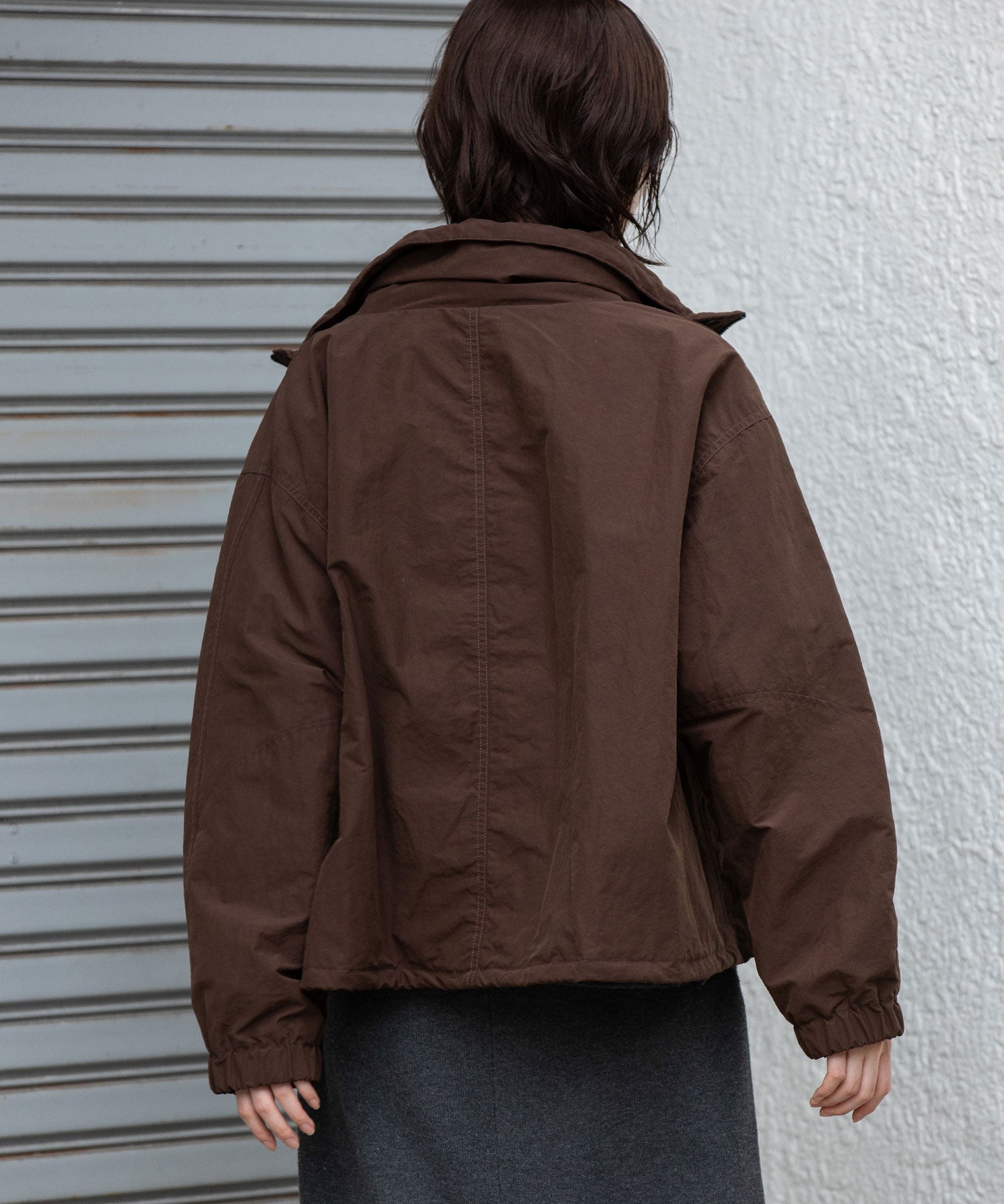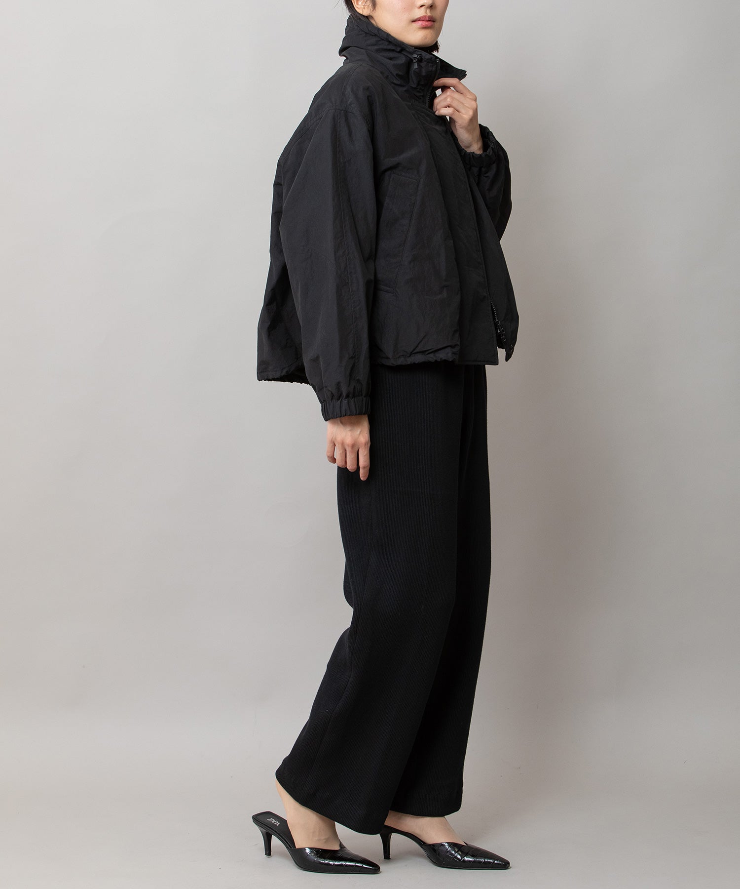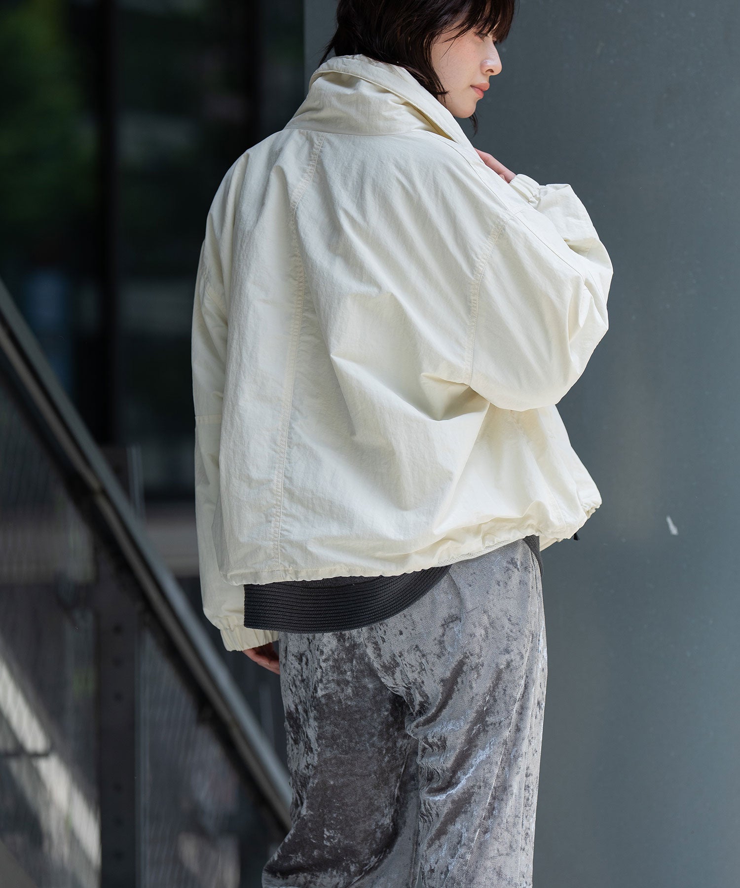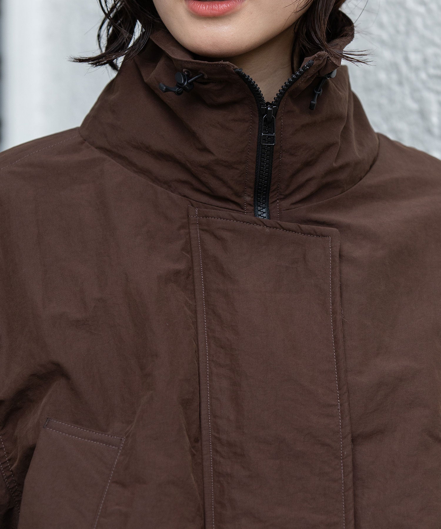 スタンドカラーと身頃裾はストレッチコードでブラウジング可能です。