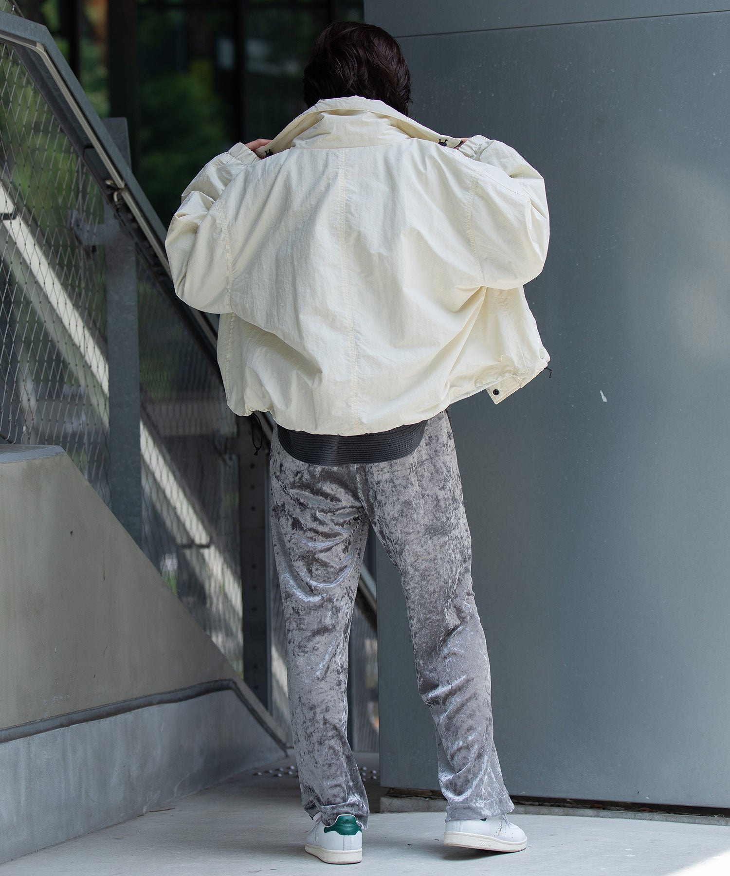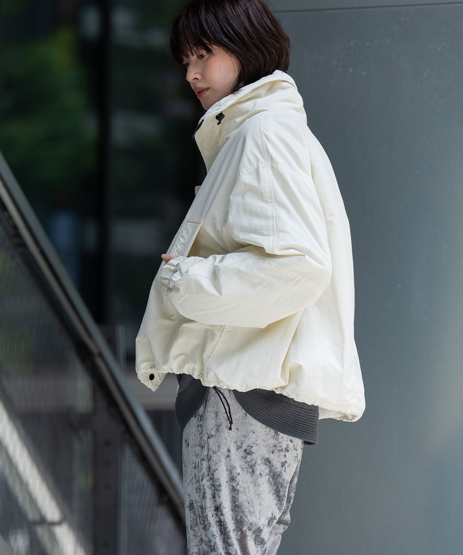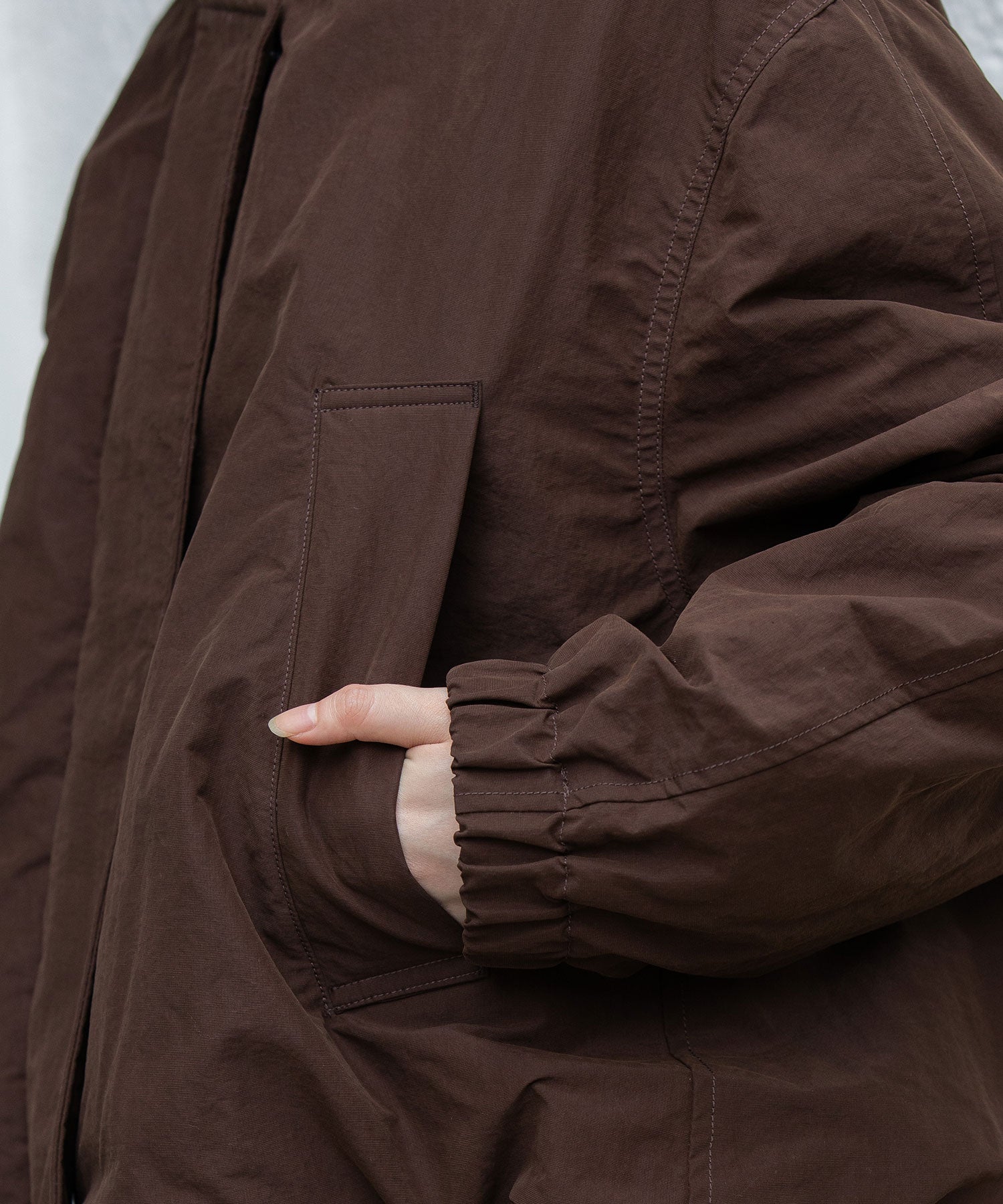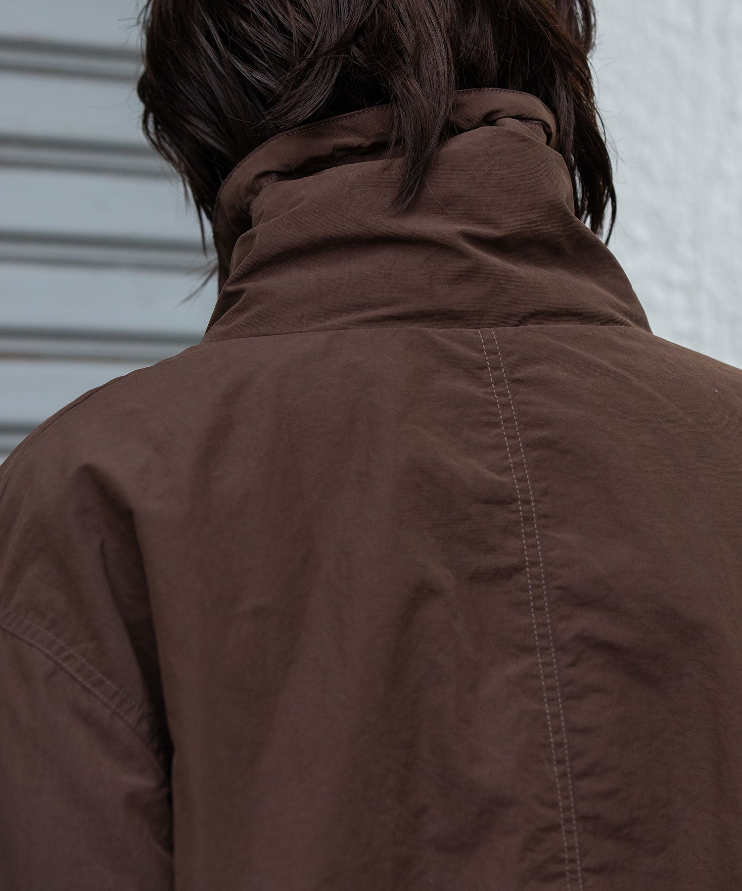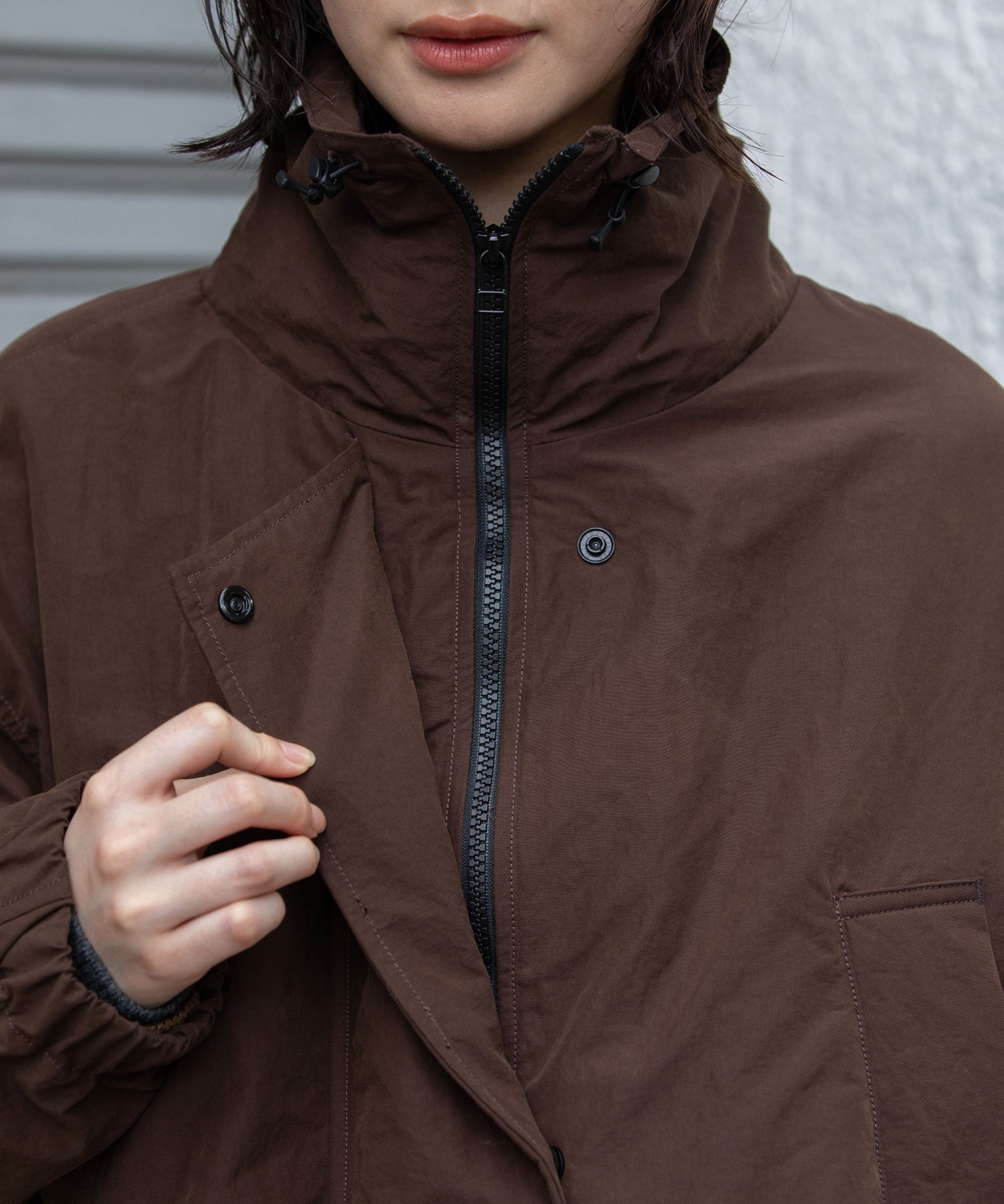 スタンドカラーと身頃裾はストレッチコードでブラウジング可能です。