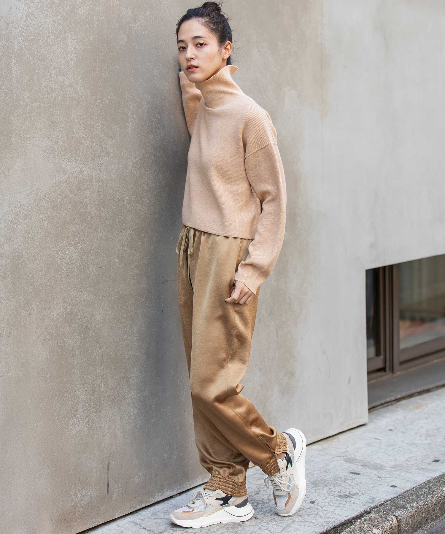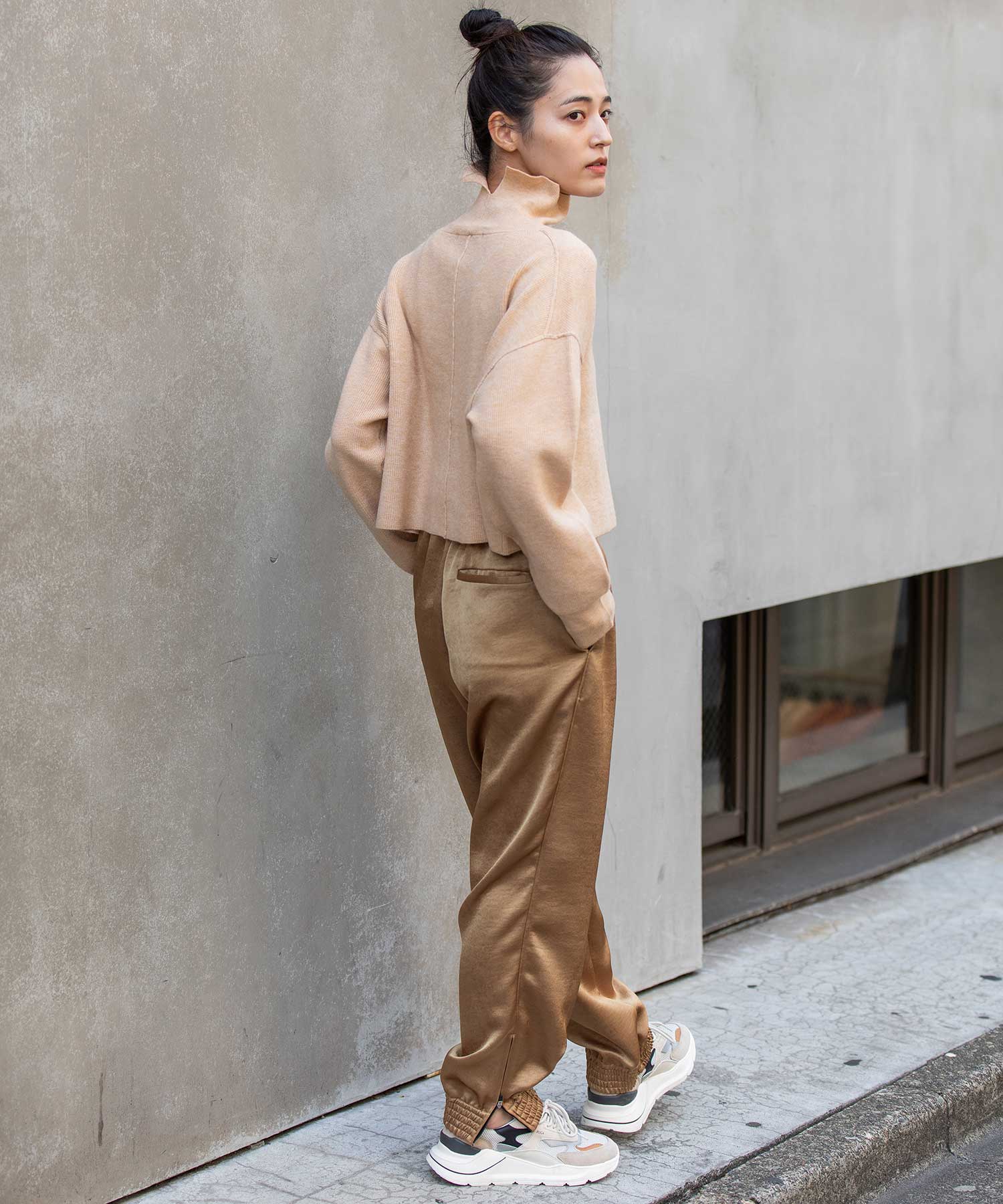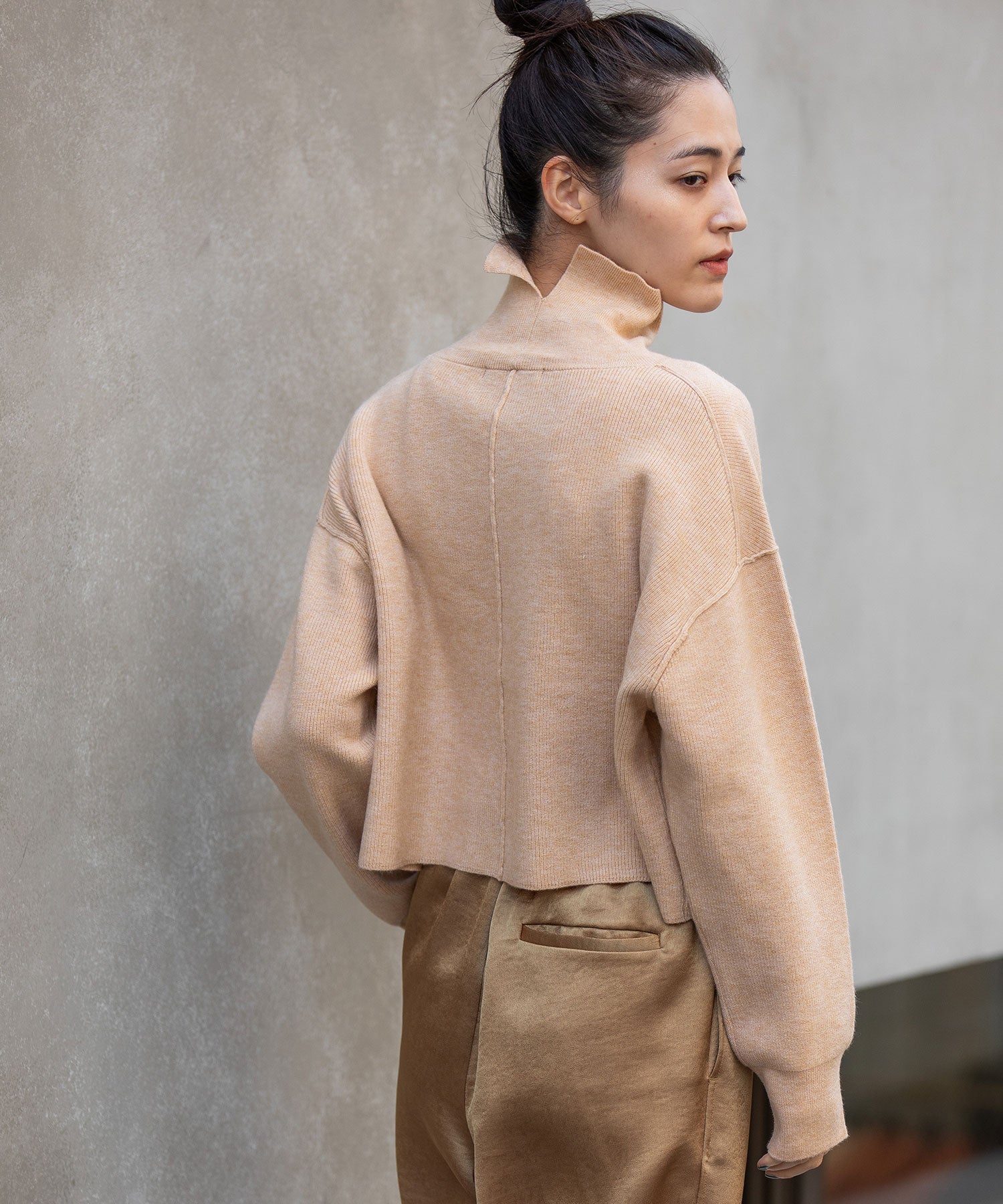 ゆるっとしたタートルネックが大人っぽく、センターバックにはスリットを入れ、抜け感も加えています。
