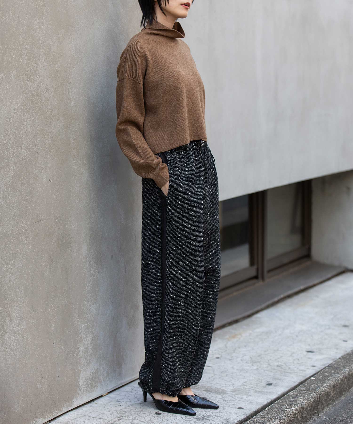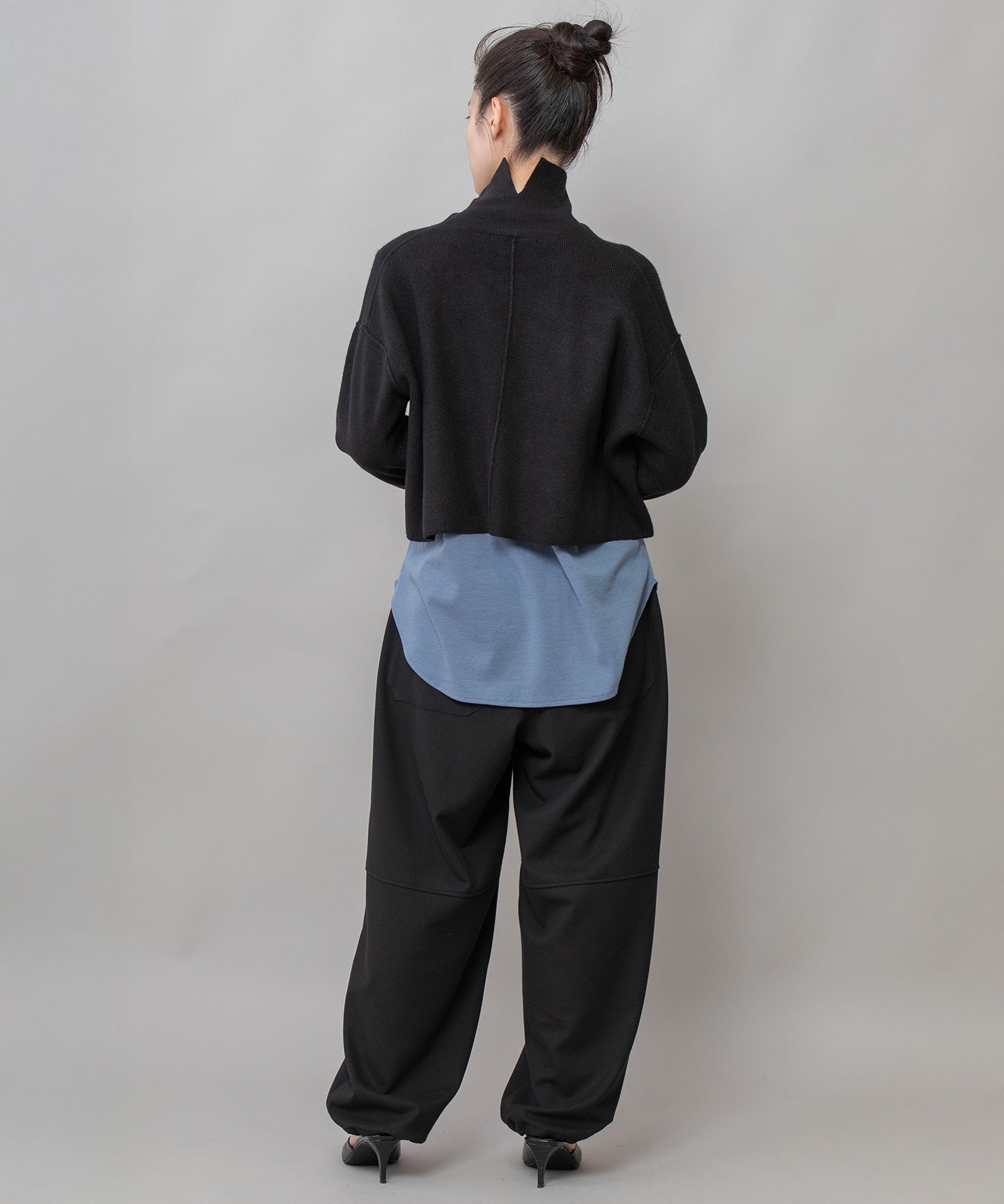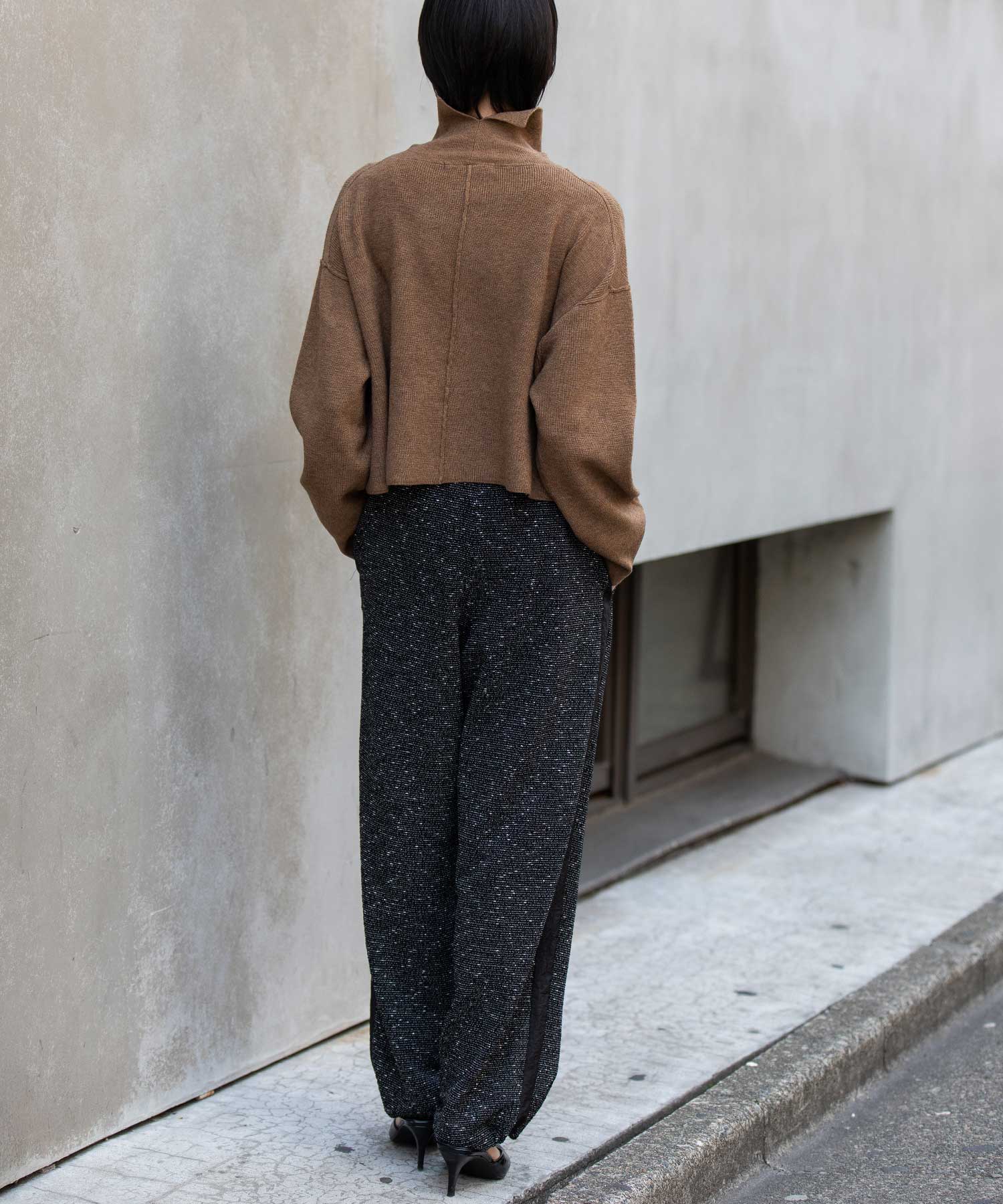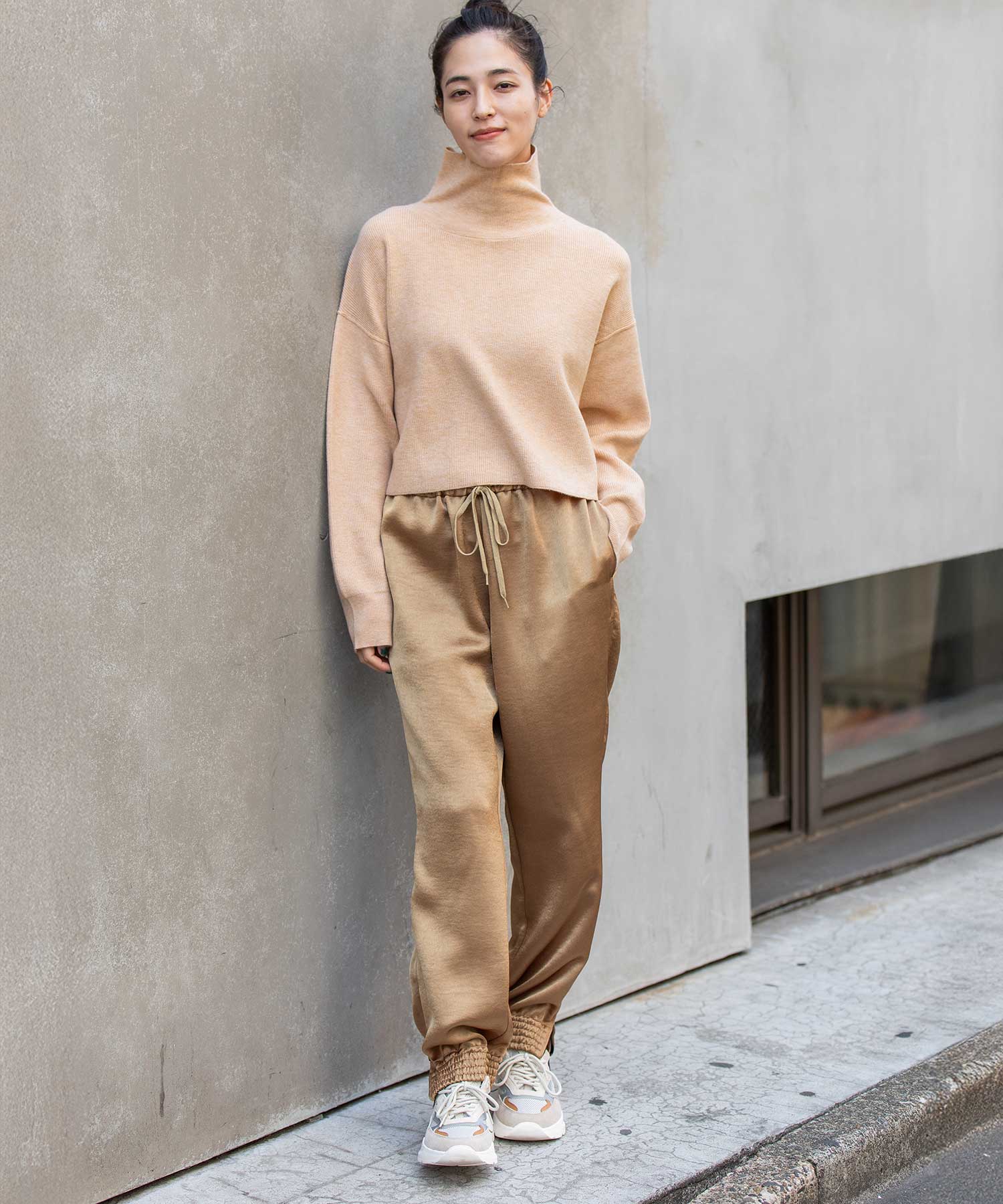 ゆるっとしたタートルネックが大人っぽく、センターバックにはスリットを入れ、抜け感も加えています。