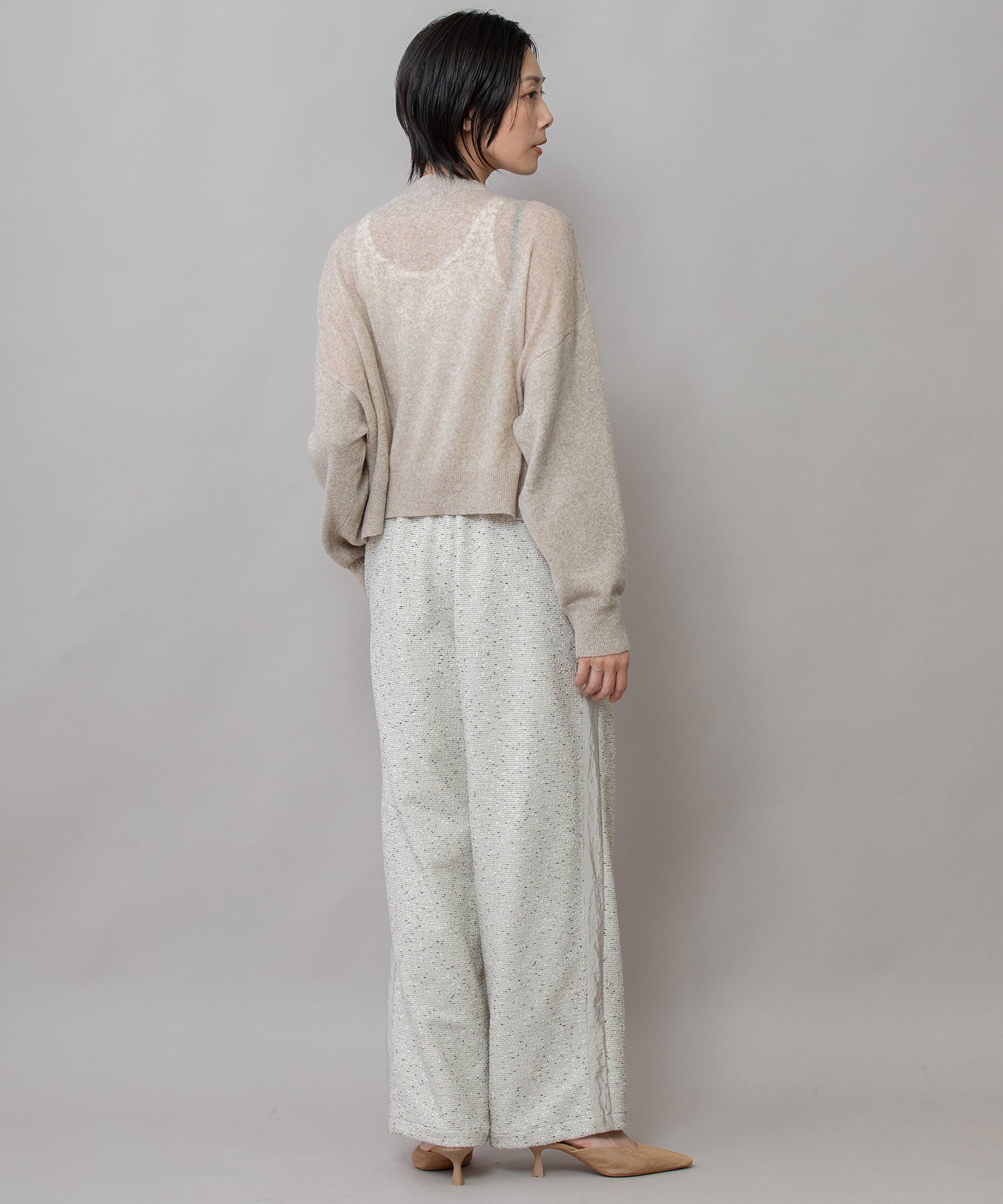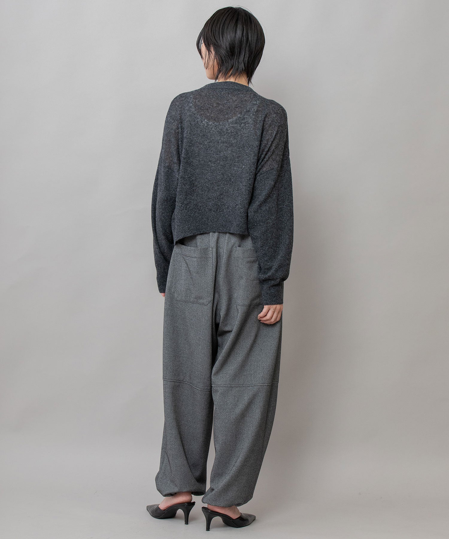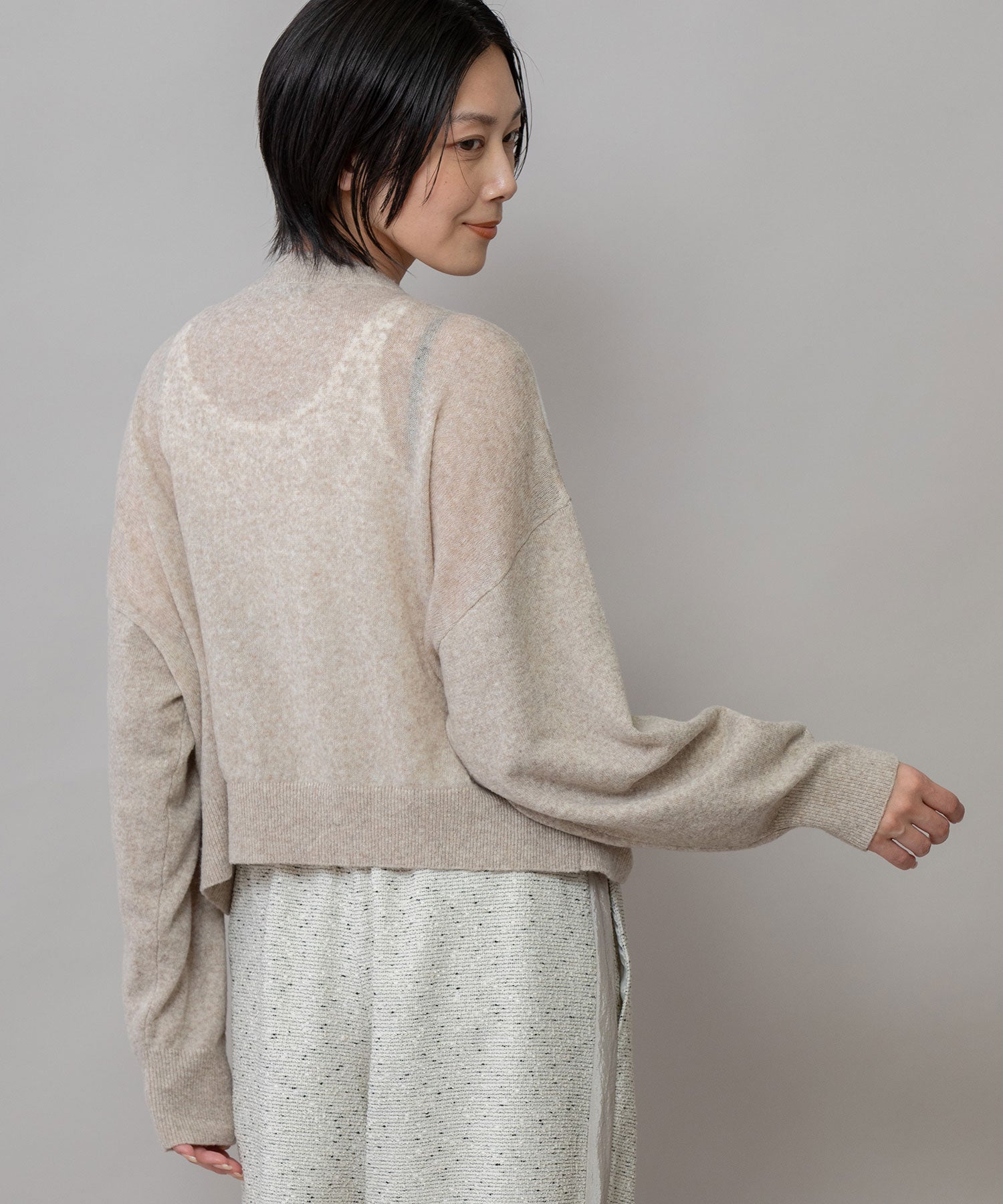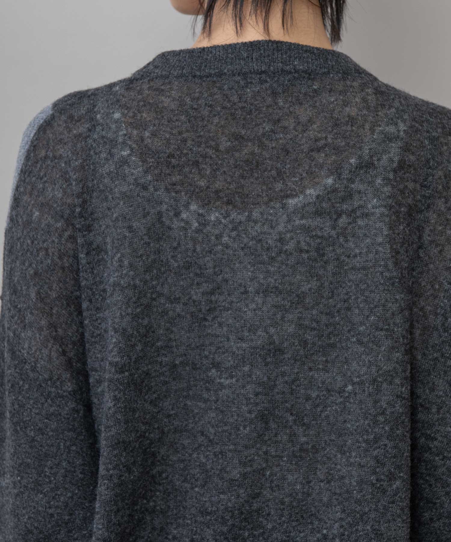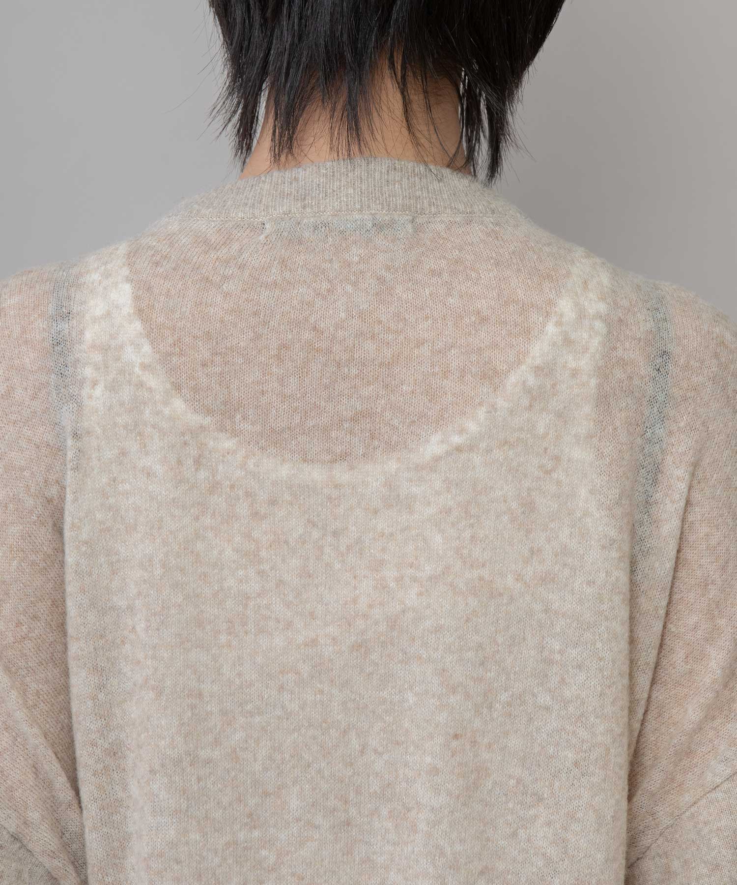 また、後ろ身頃のみ1本取りで編み立て、前身頃と袖とは違った透け感のある編地にしています。