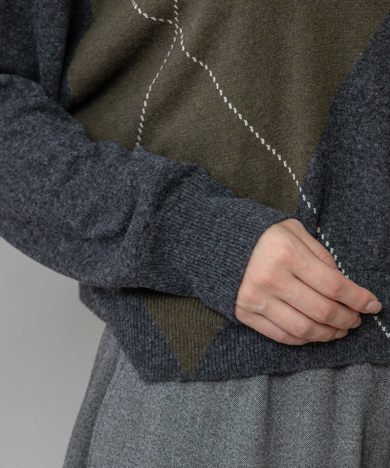 12GGの天竺編みで、前身頃は12GGのインターシャで、アーガイル柄に編み立てています。