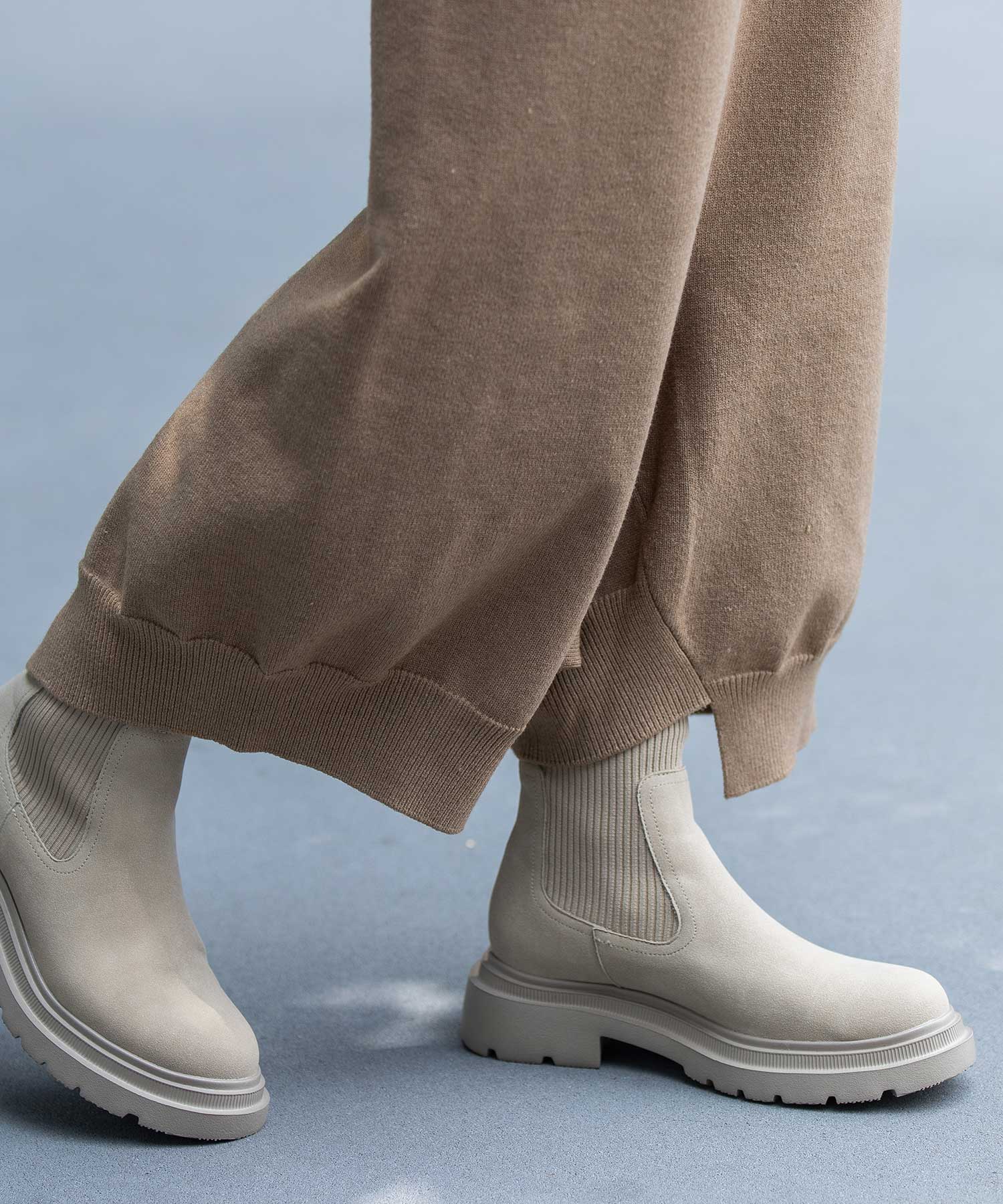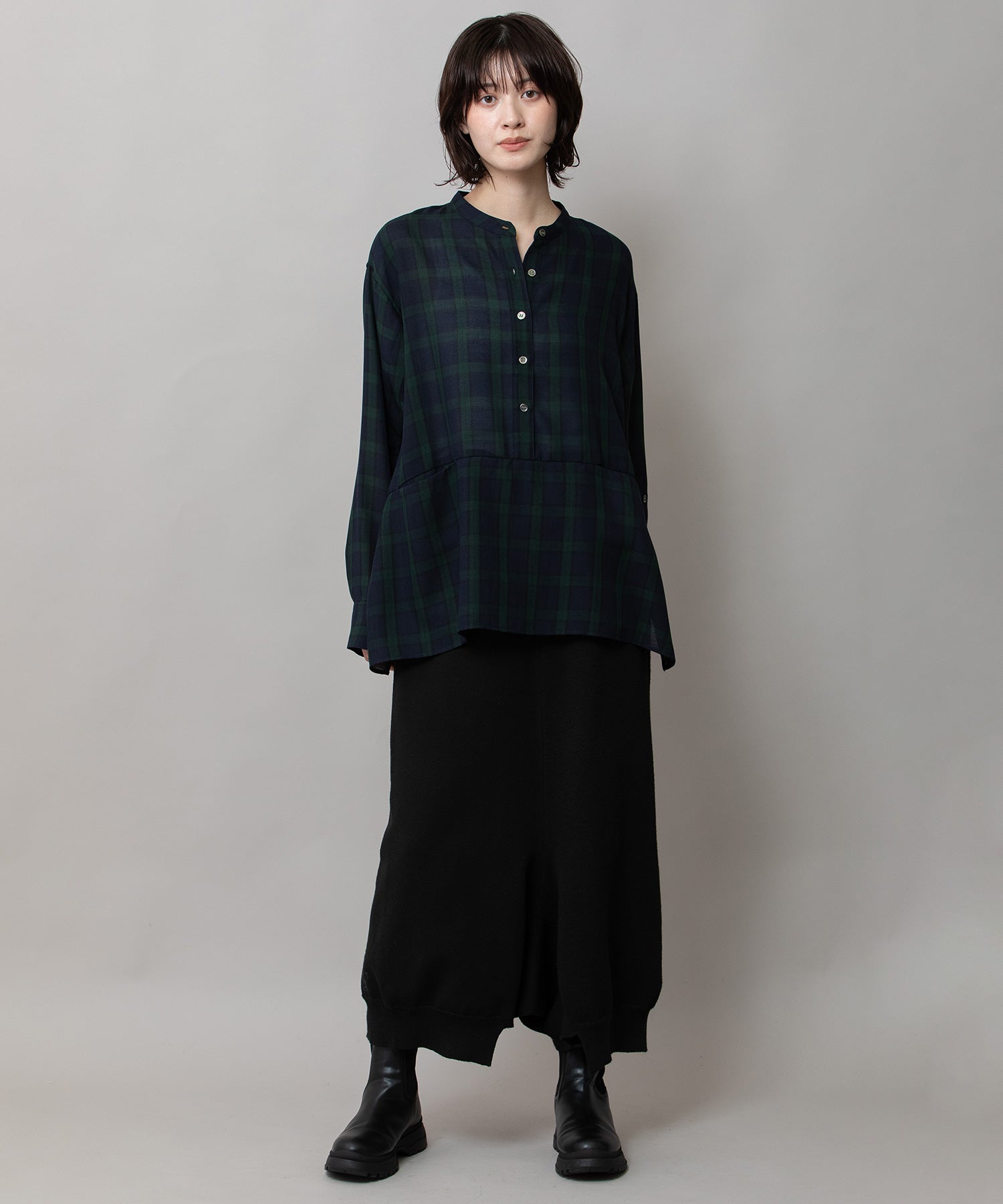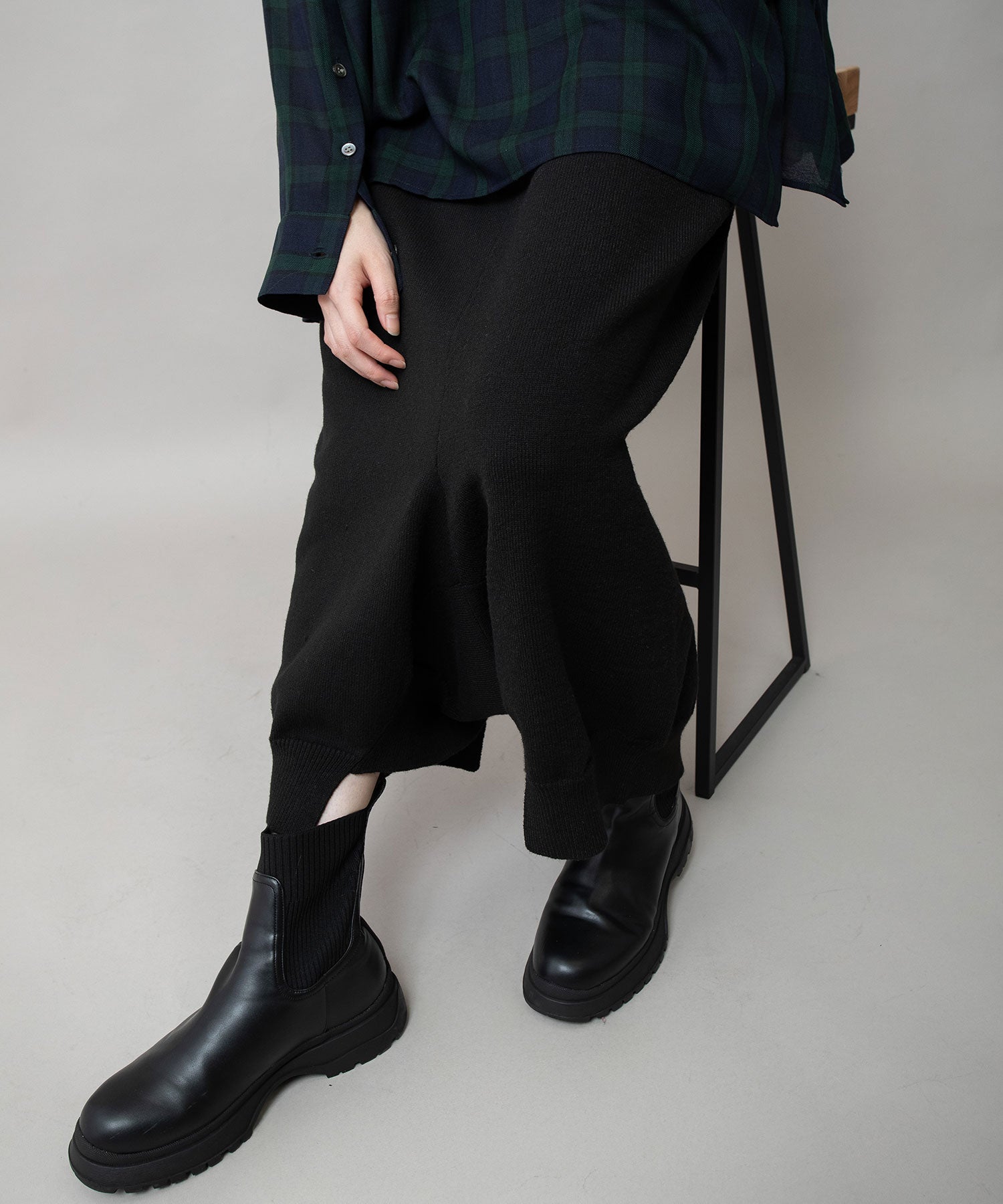股上を長く取り股ぐり部分にマチパーツをつけたデザインで、着用するとマチ部分が広がり、裾に向かってナチュラルについた丸みとニットのふくらみ感で他にはないデザイン・シルエットに仕上がっています。