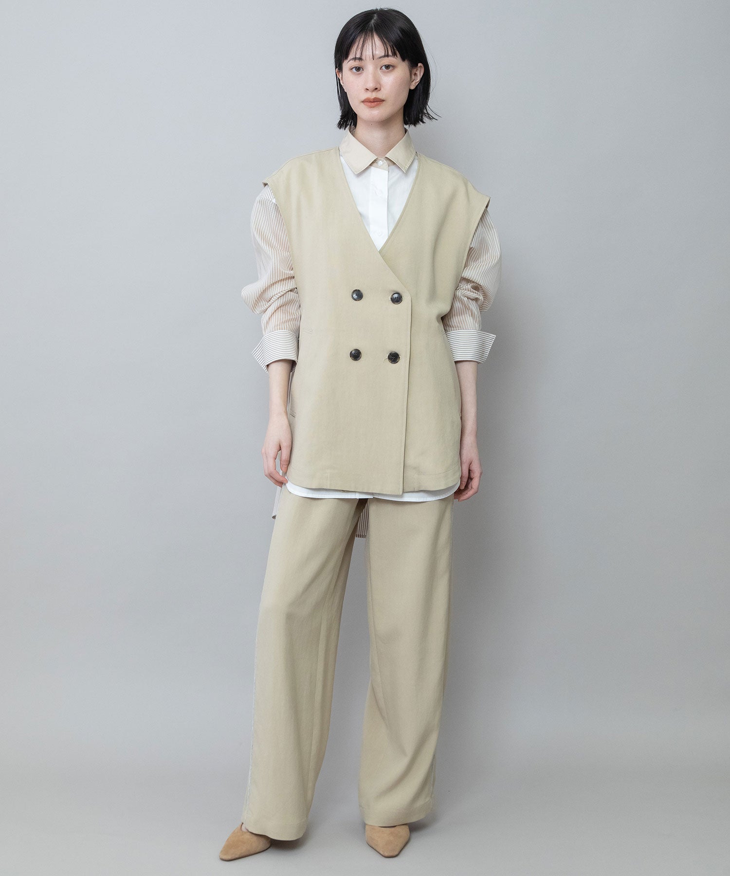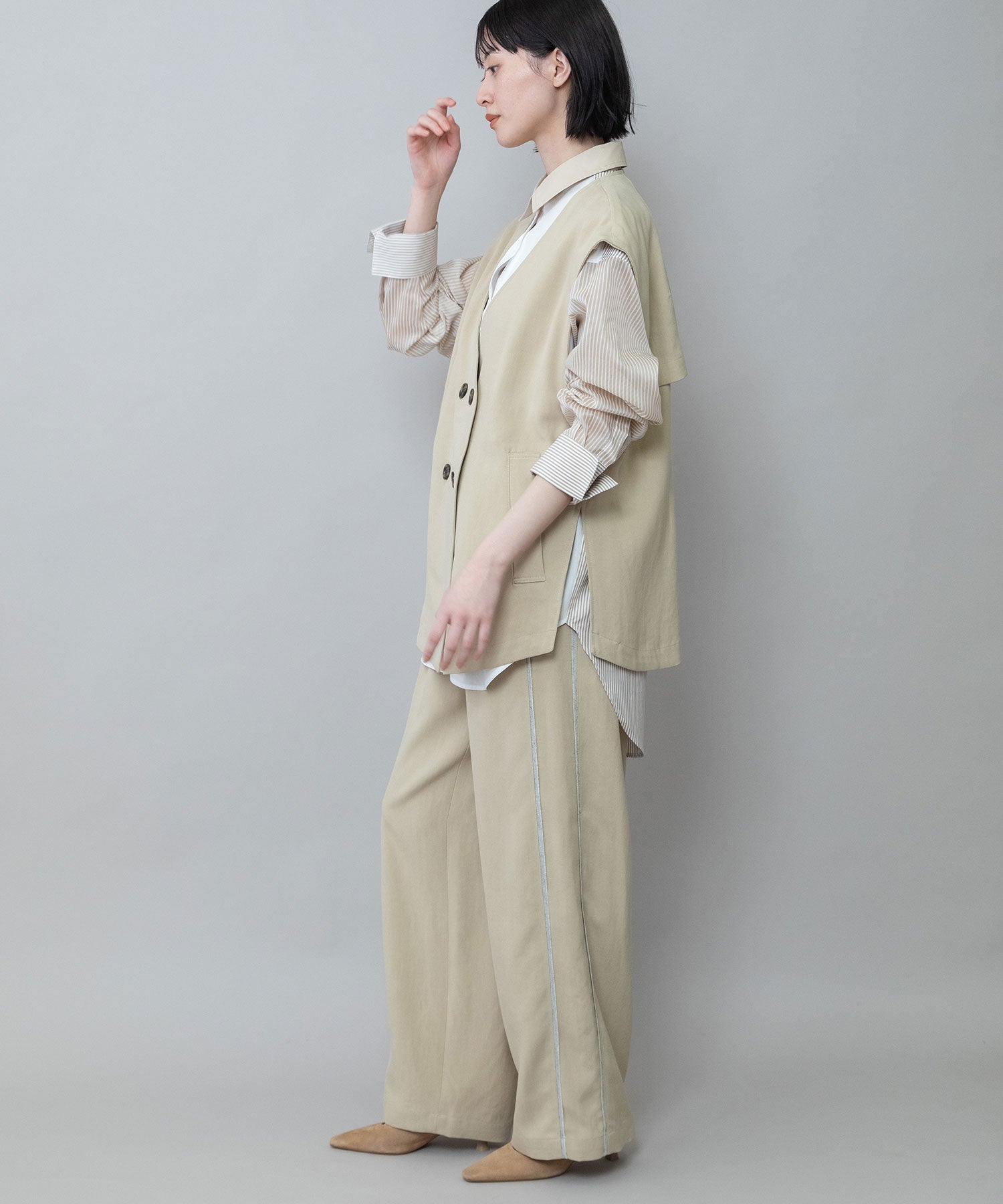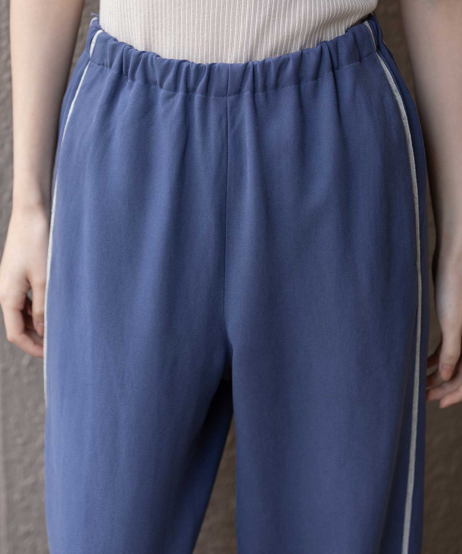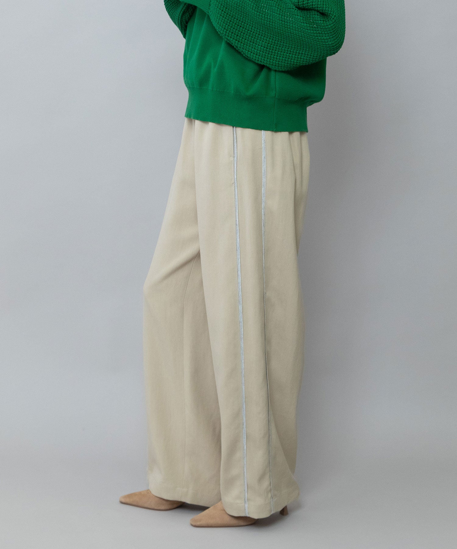 使用しているリネン混のテープは各色ナチュラルな杢が入っていて質感もしっかりしてるのでリラクシーな高級感があります。テープによってシームが強調されるので、どの角度から見てもすっきり脚長に見えるようシーム位置を設定しています。やや浅めの股上、特に後ろ股ぐりを浅めに設定して小尻効果も狙ってます。セットアップだけでなく幅広いコーデに使えるワイドストレートシルエットのイージートラウザーズです。