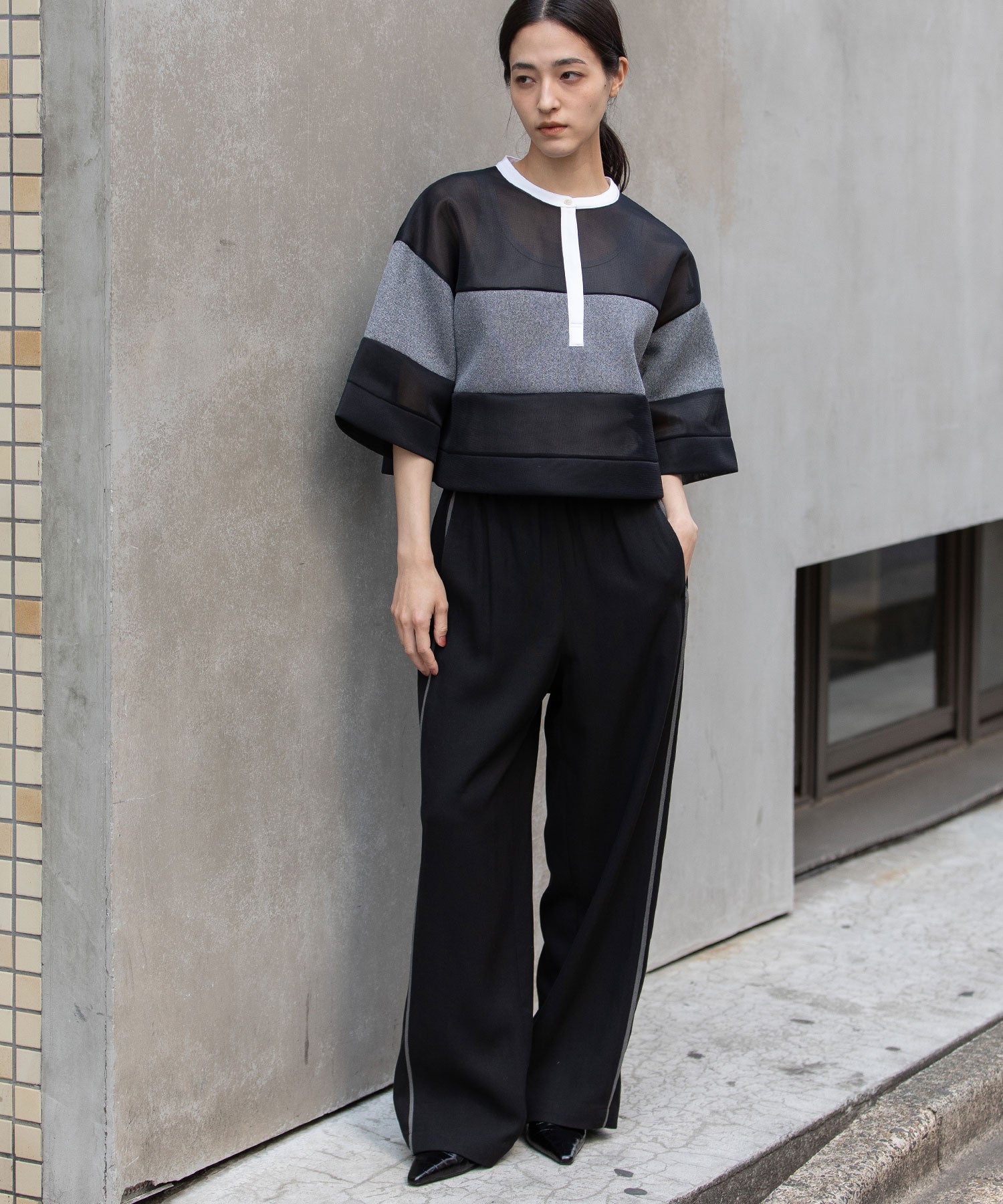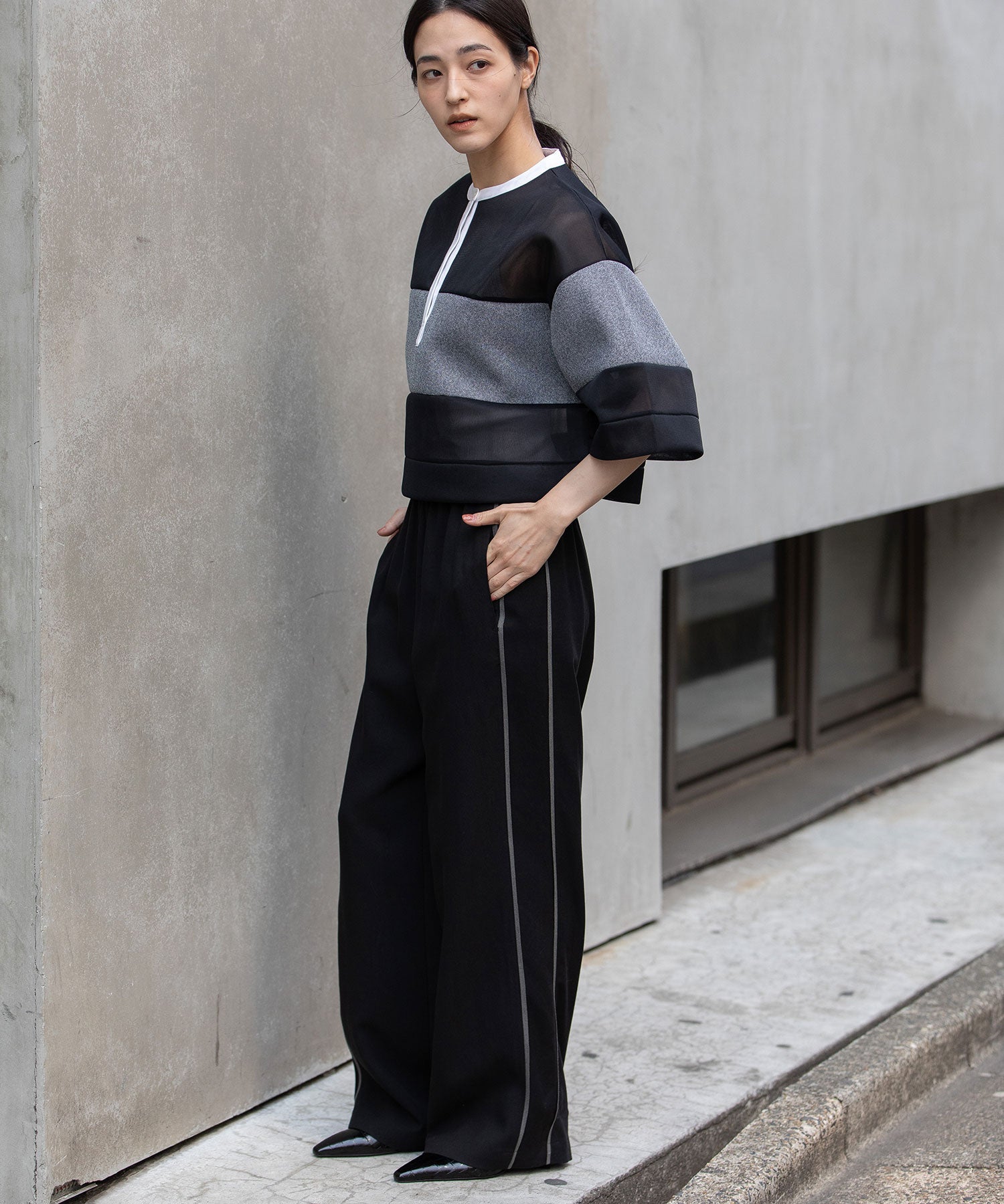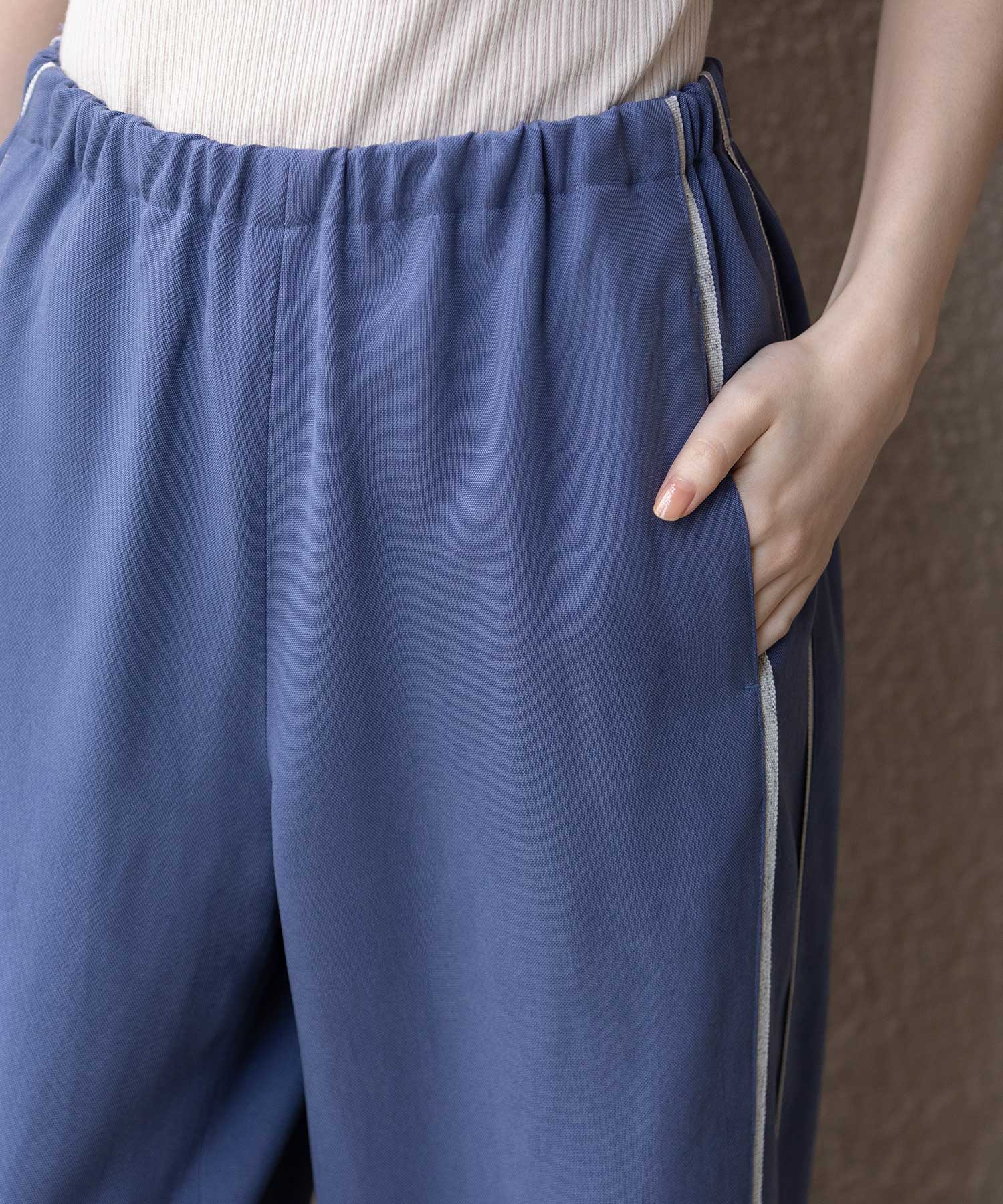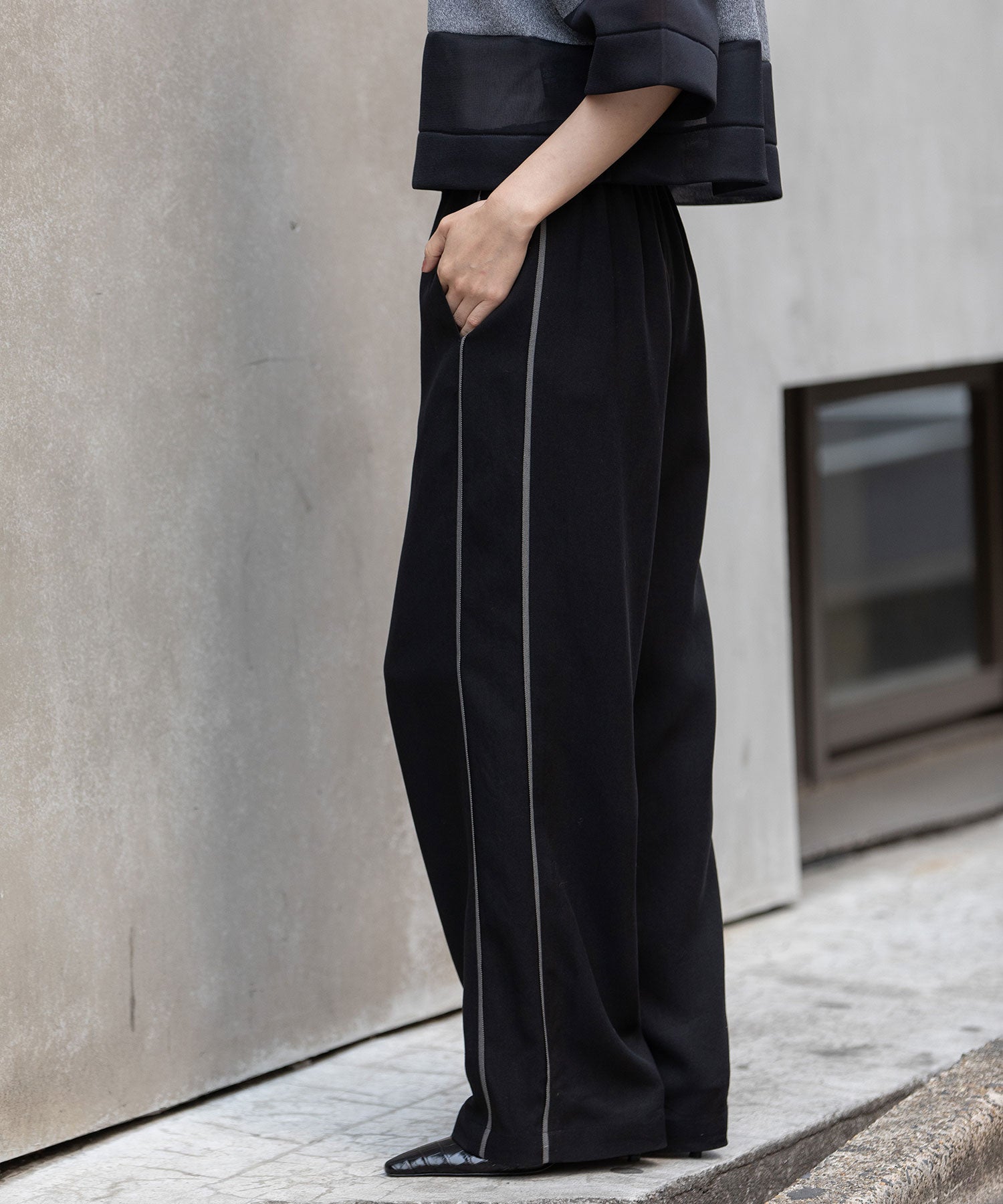脇パネルのシームにテープをはさみ込んだワイドパンツ。