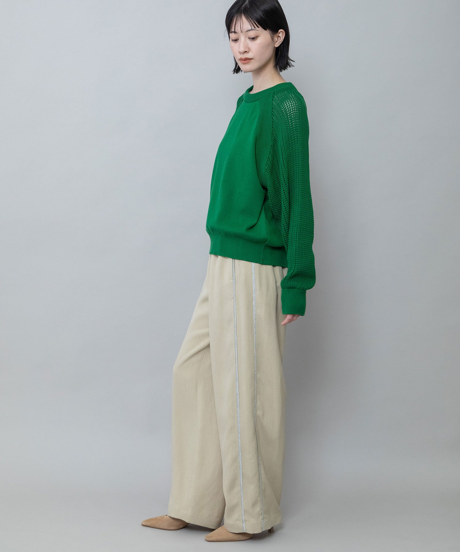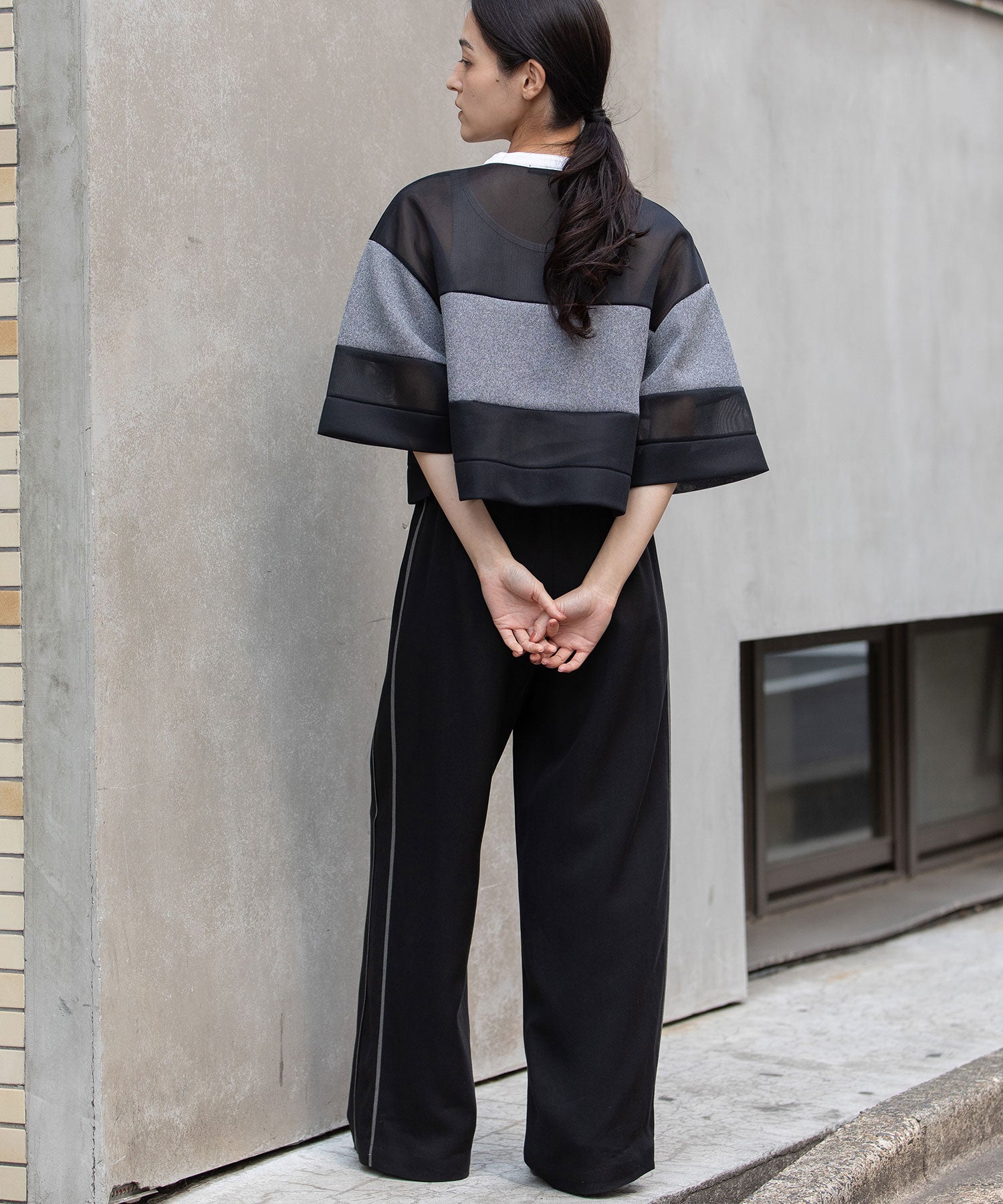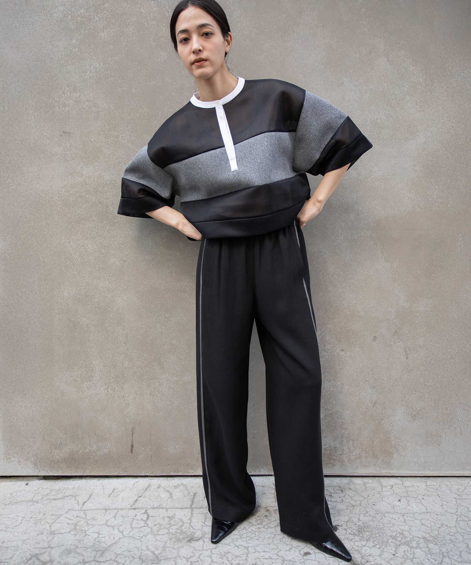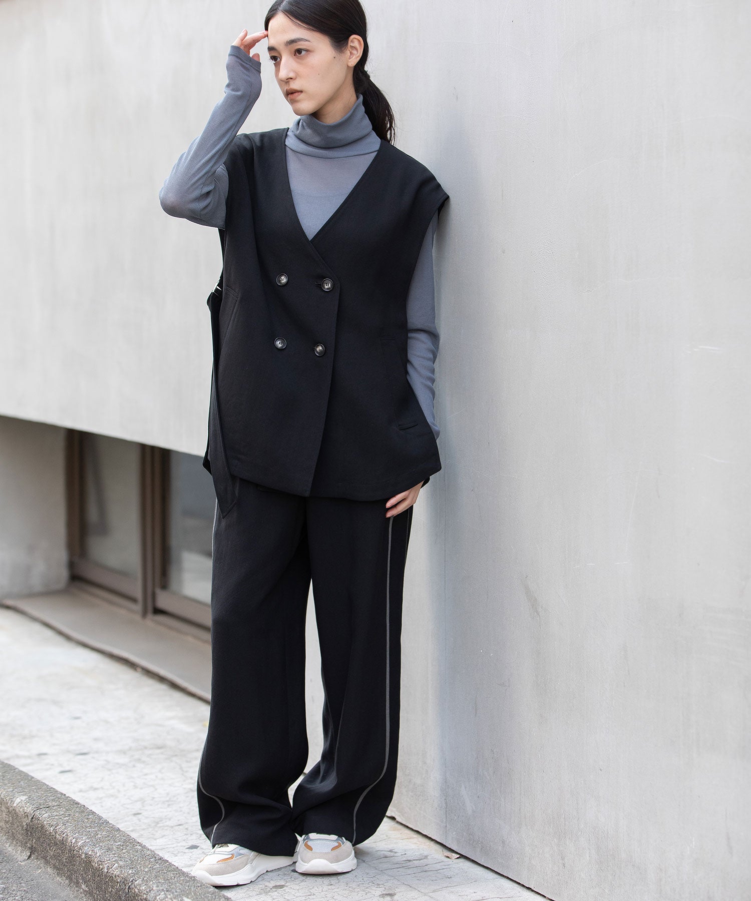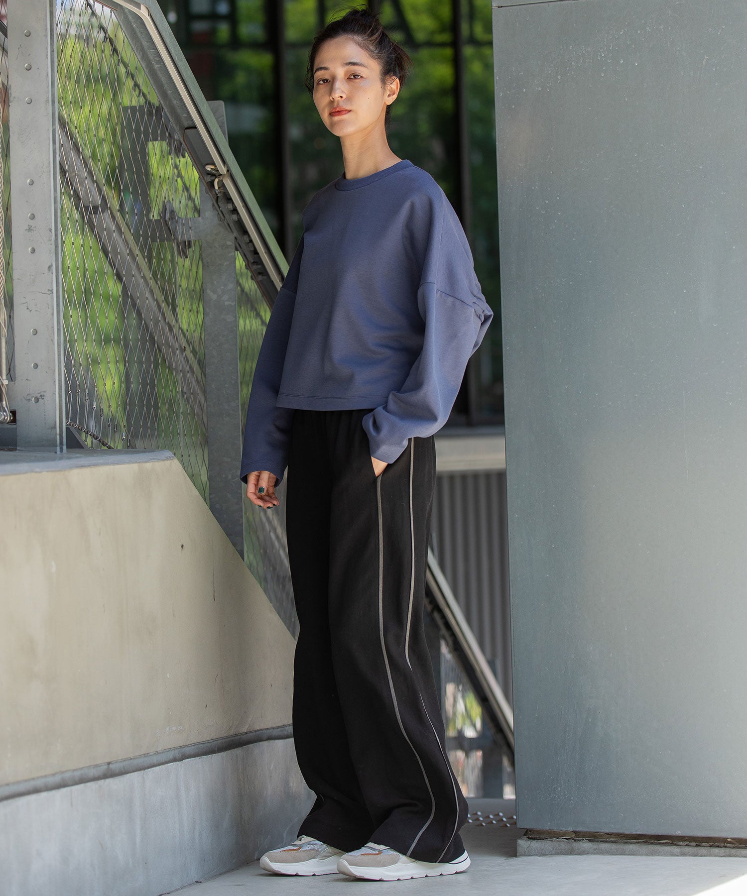 脇パネルのシームにテープをはさみ込んだワイドパンツ。