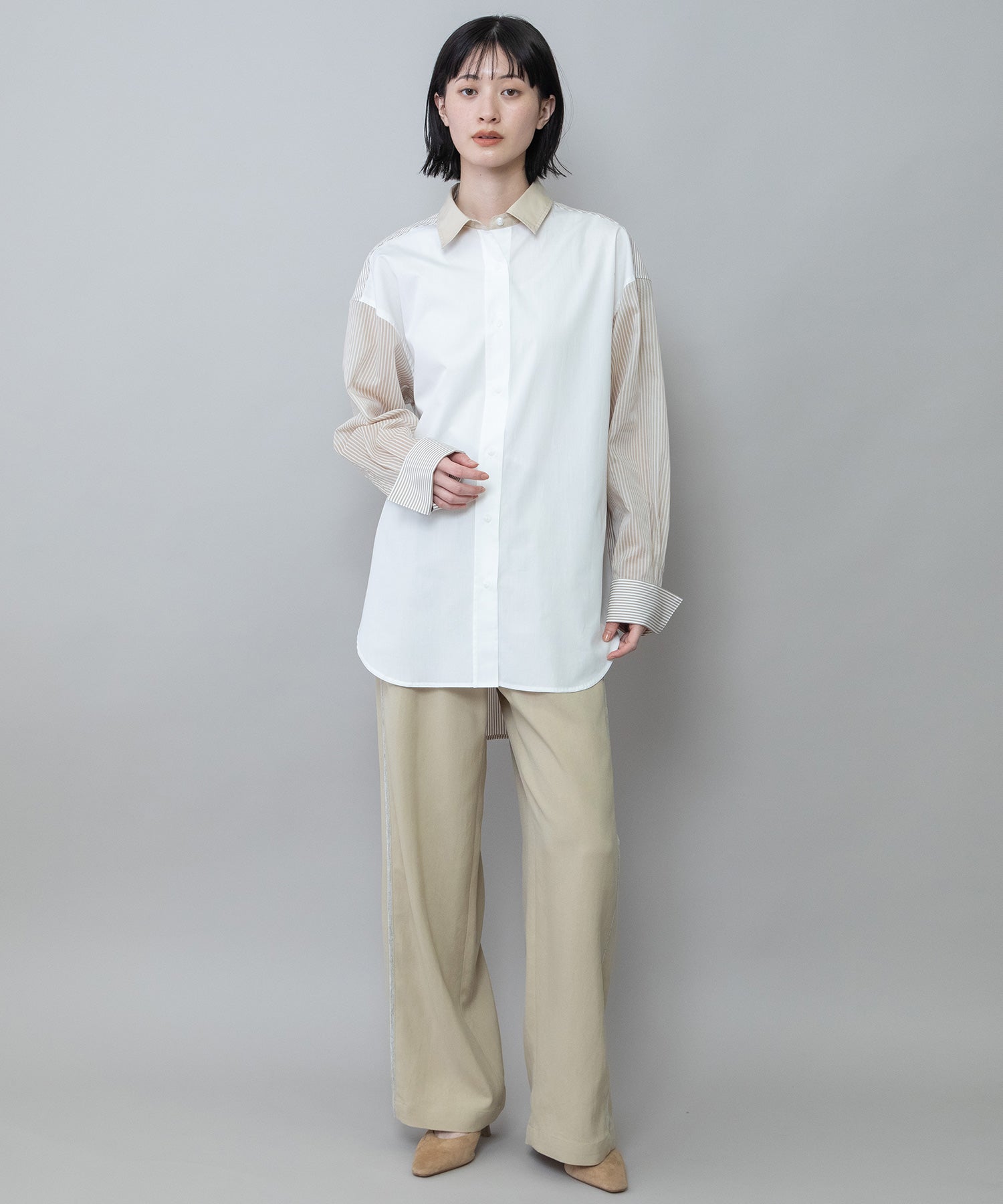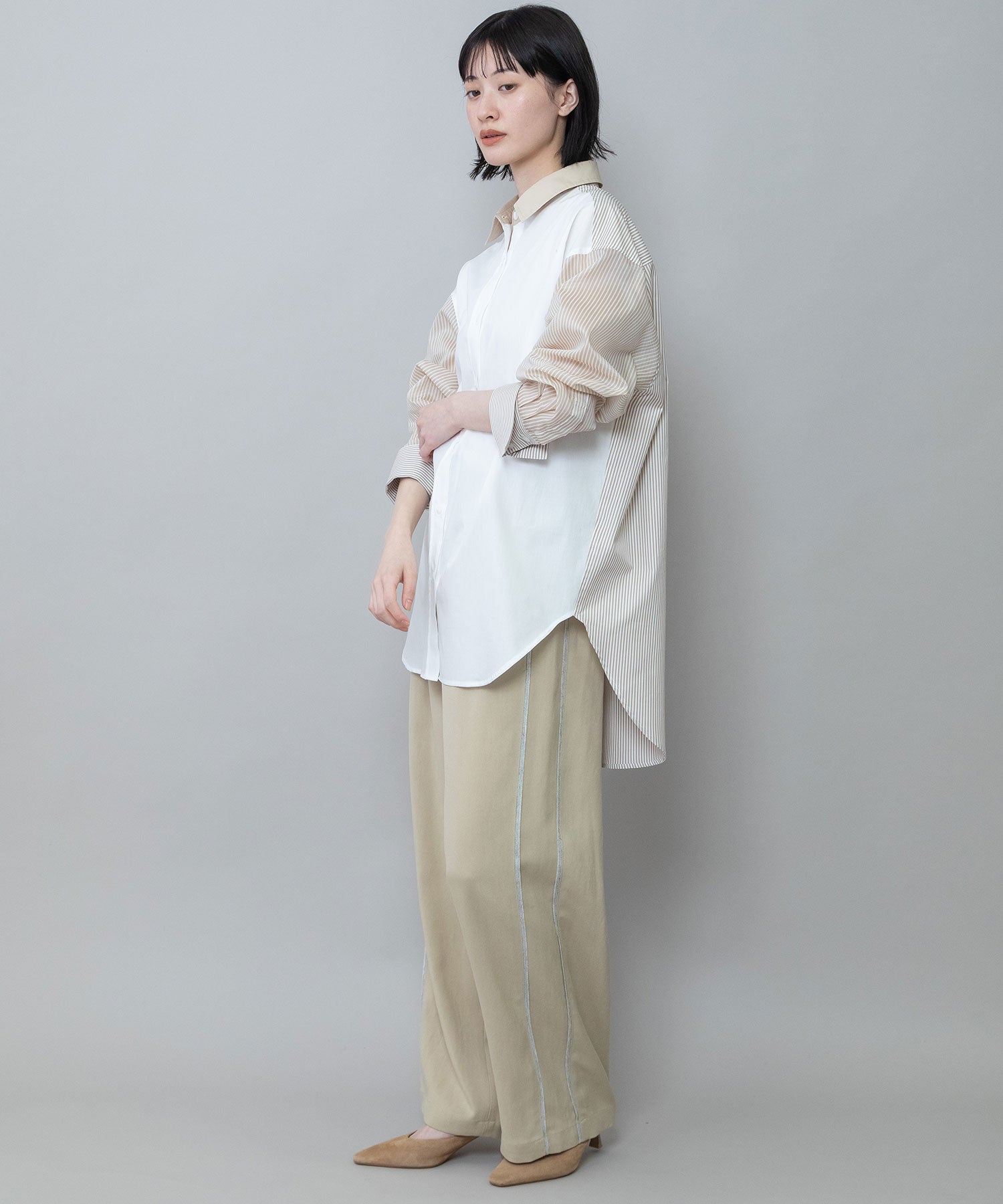 ■ホワイト:クリアなホワイトを前面に、袖と背面にはベージュのストライプ