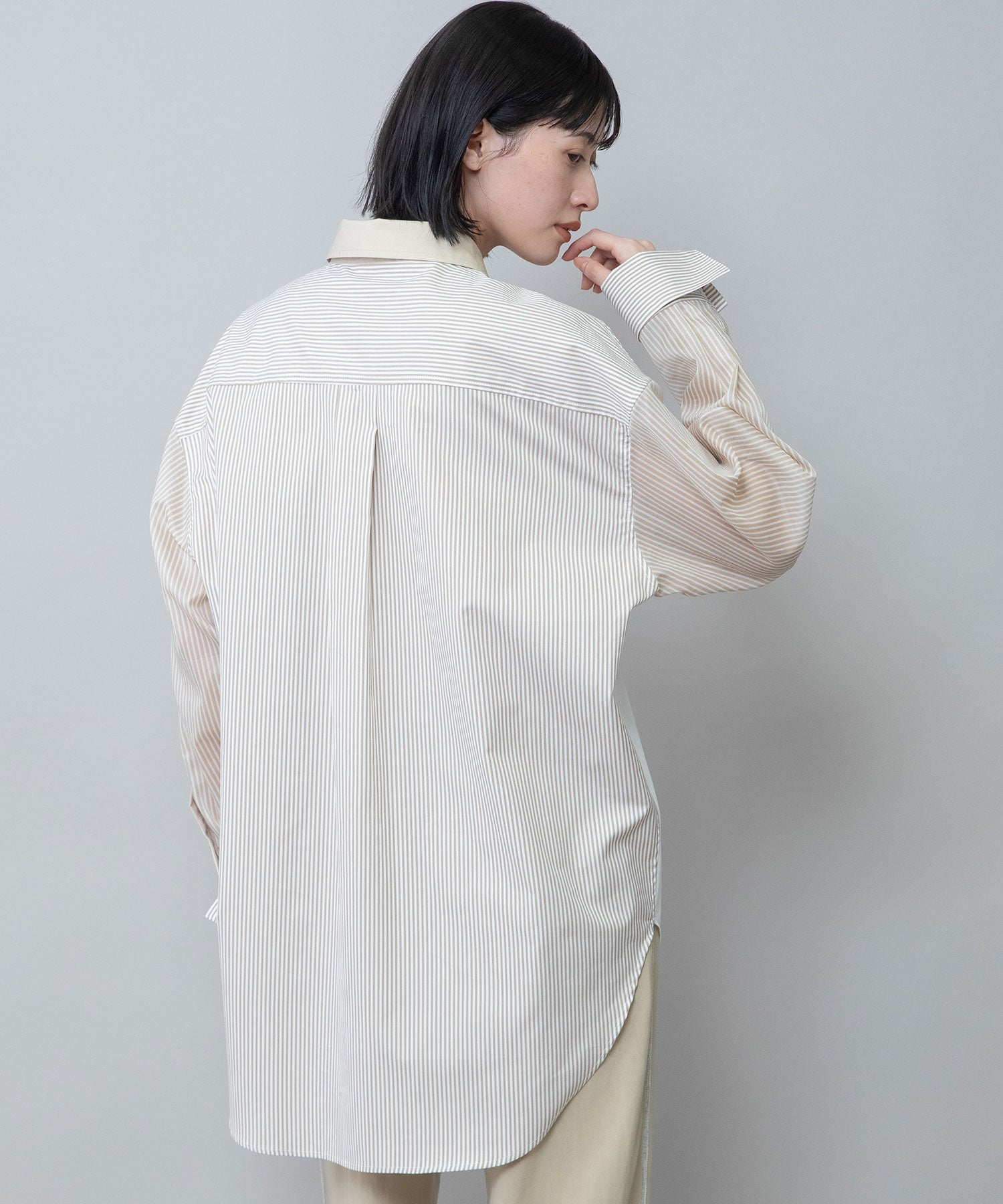 袖:綿の細番手とポリエステルフィラメントを交織した適度な透け感のある素材に、ストライプ柄をプリントで表現しました。