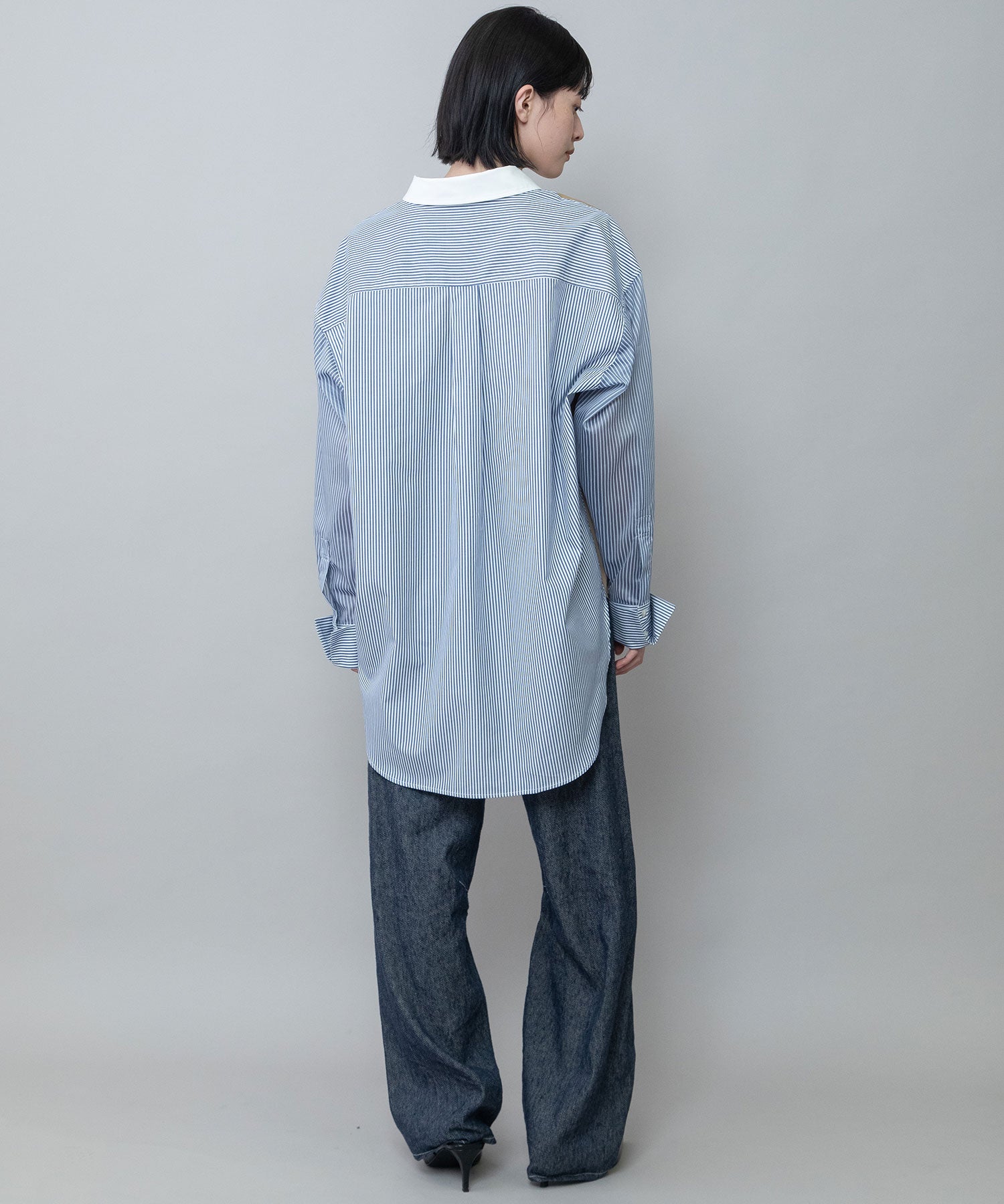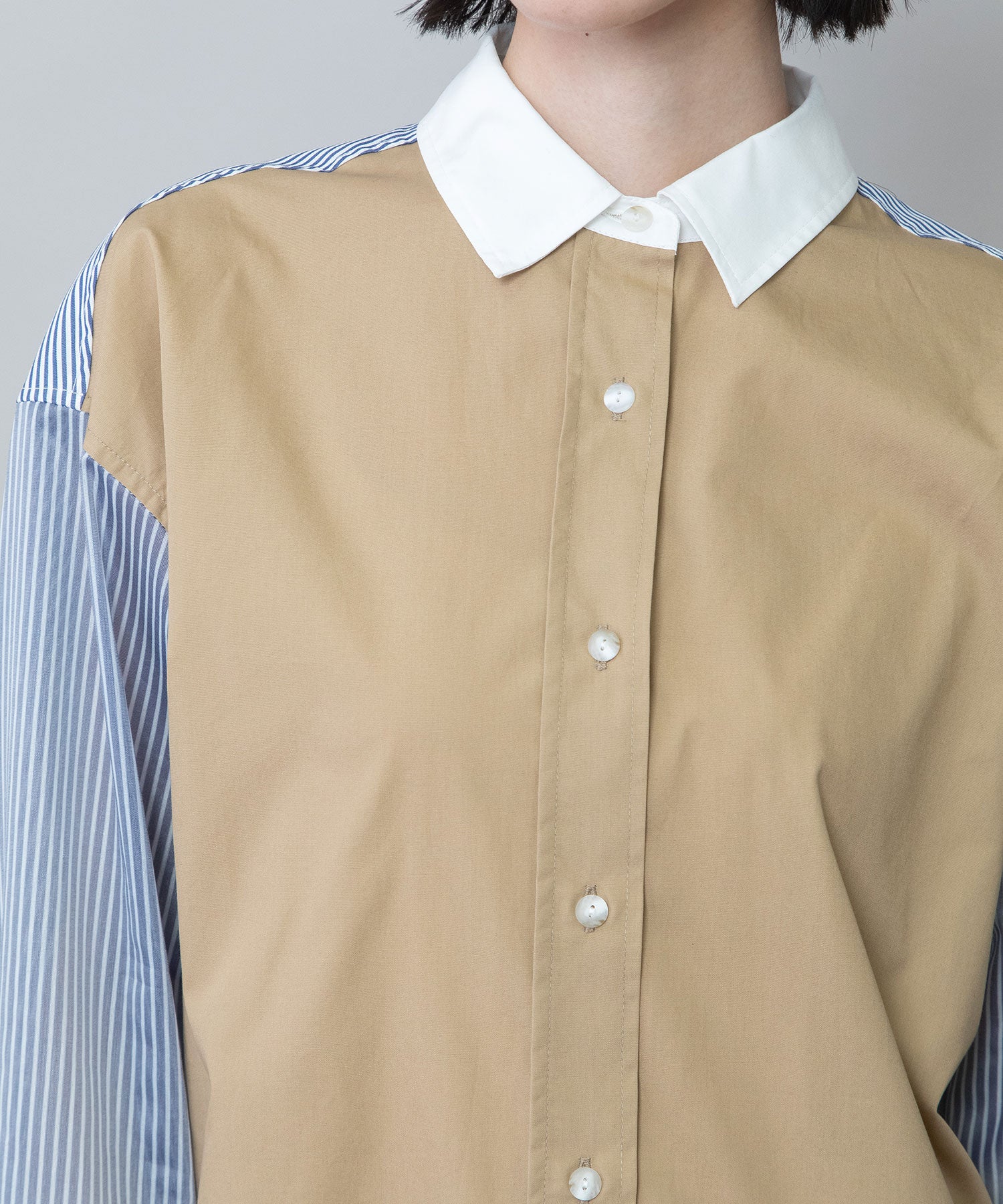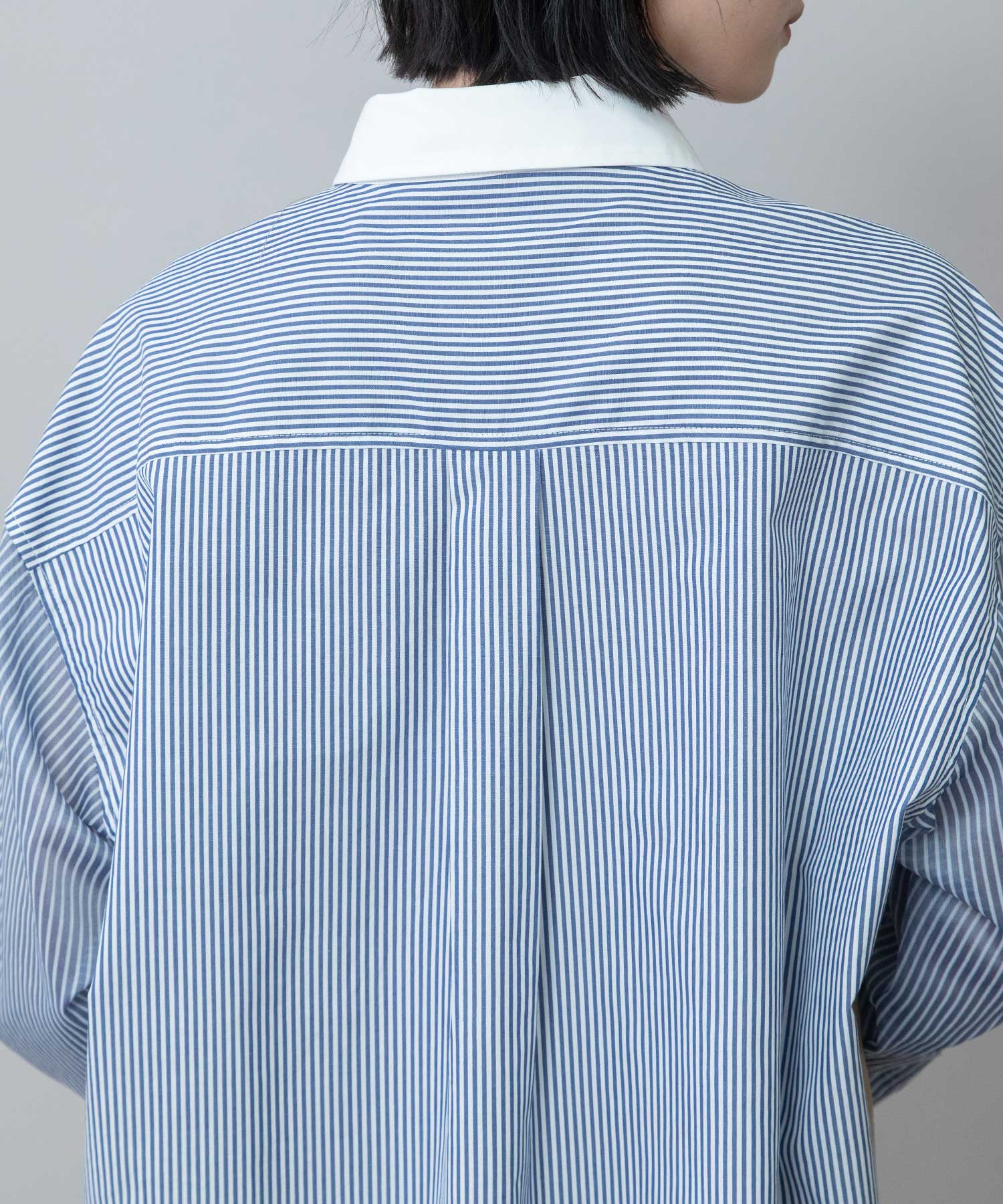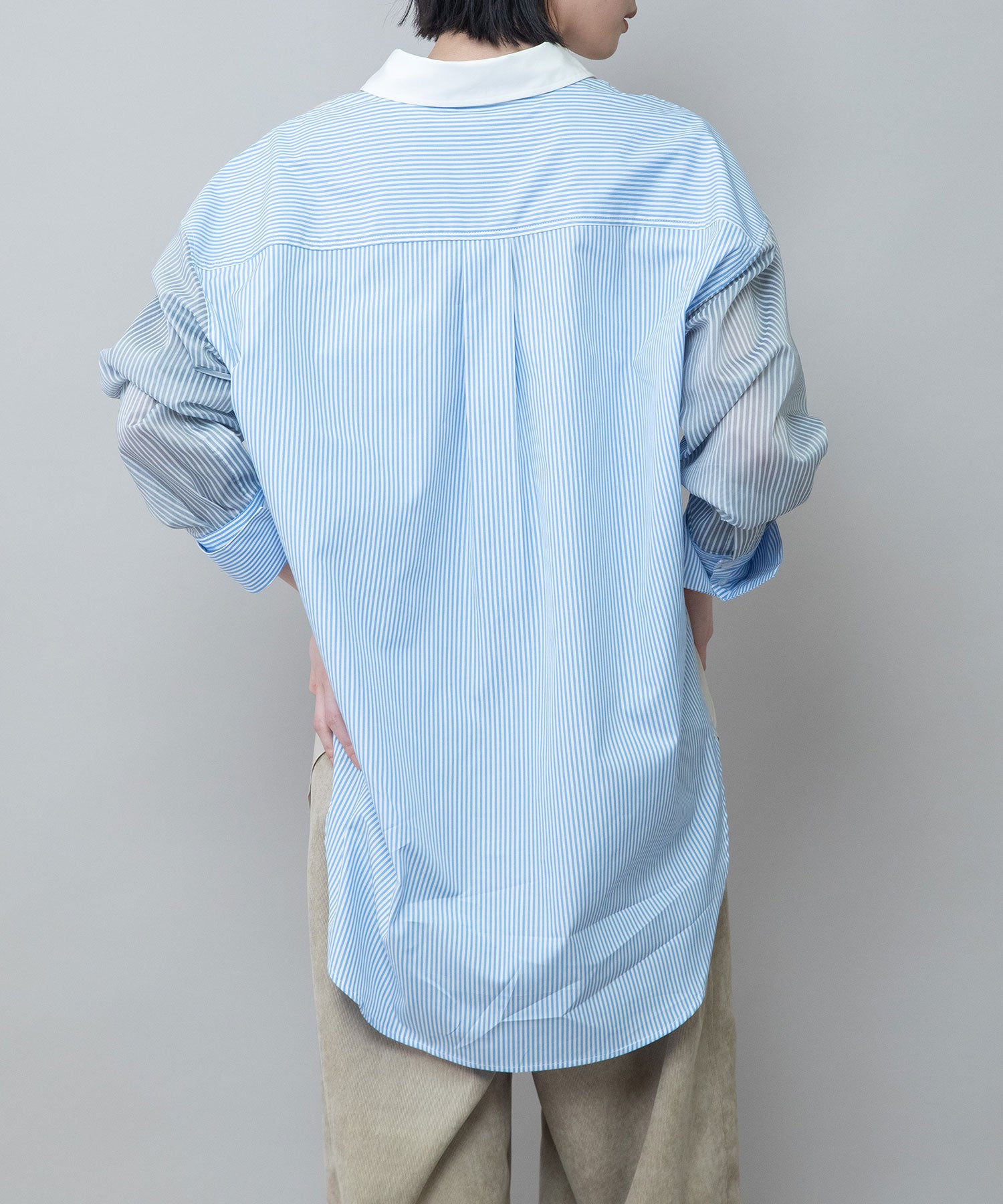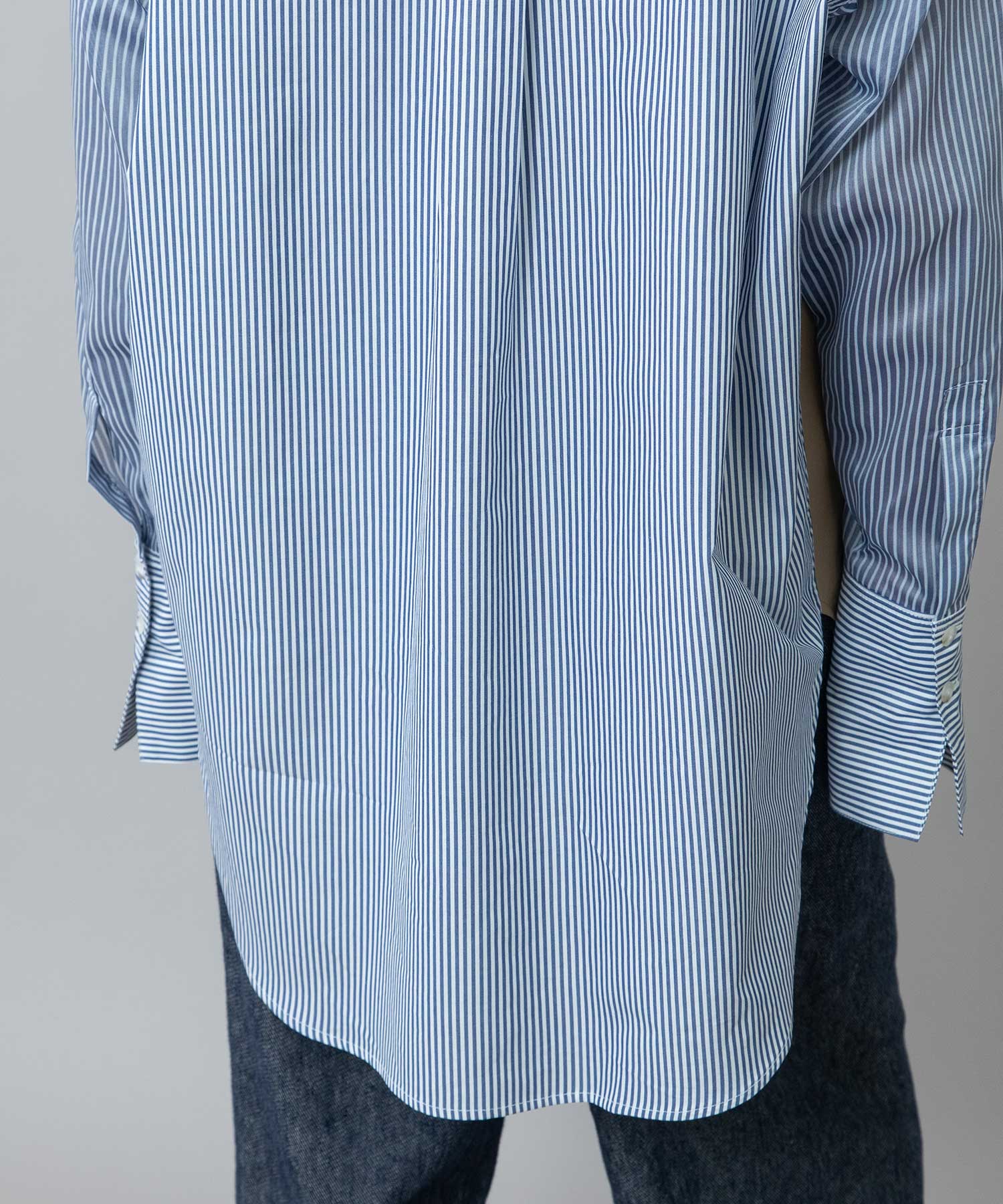 前見頃と衿は色違いのブロード、後ろ見頃とカフスはストライプ、袖はシアーストライプと3種類の素材を使い分けたデザインです。