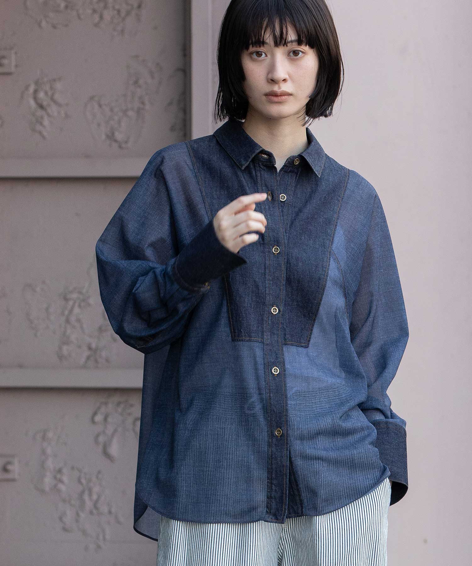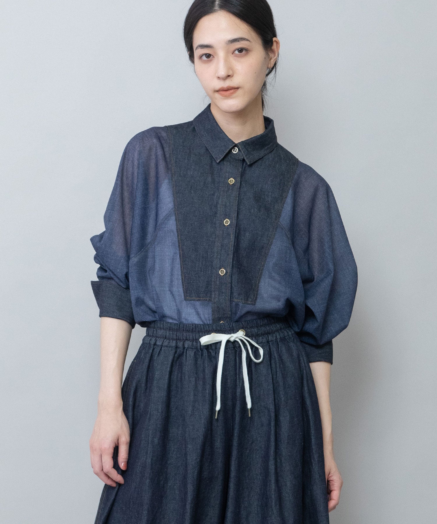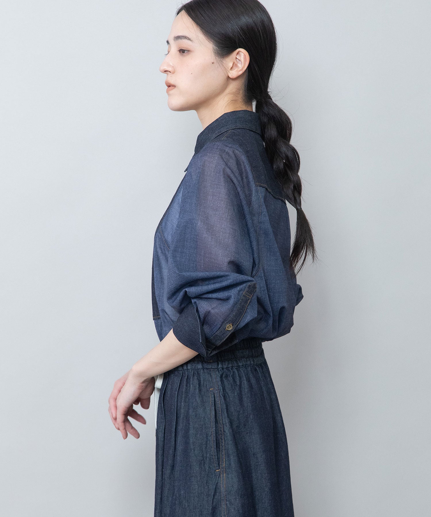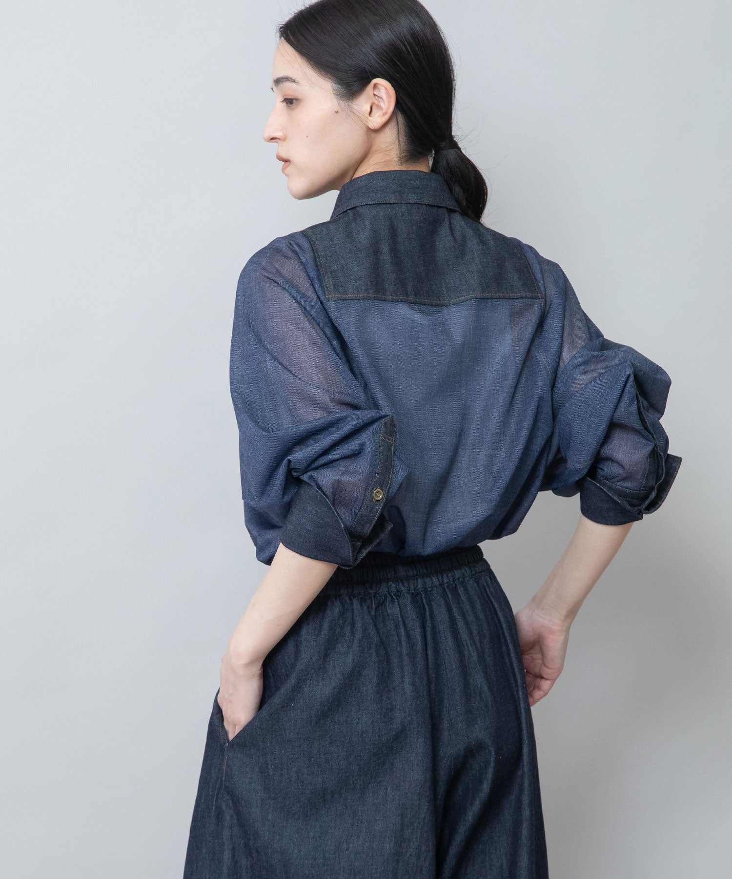 アーカイブのブザムシャツのディテールをアップデートして2種類のデニムを組み合わせたアイテムです。イカ胸や衿などキチンと感のほしいパーツには6ozデニム、身頃やたっぷりとした袖にはエアリーなシアーデニムを使うことでブラウス寄りなブザムシャツに仕立てました。カマの深いボリューム袖ですが切り替えをイカ胸に合わせてネック寄りに詰めているので前後とも華奢でシックな感じに素材が切り替わるのでより強調されます。