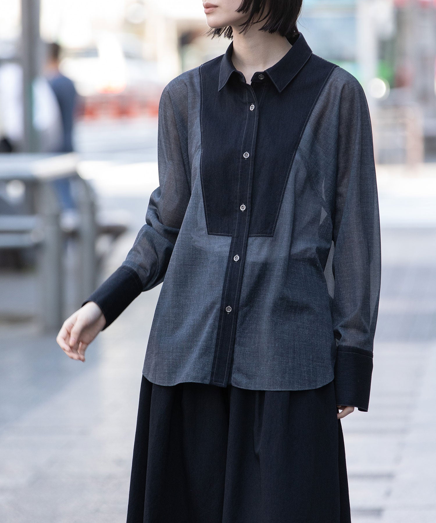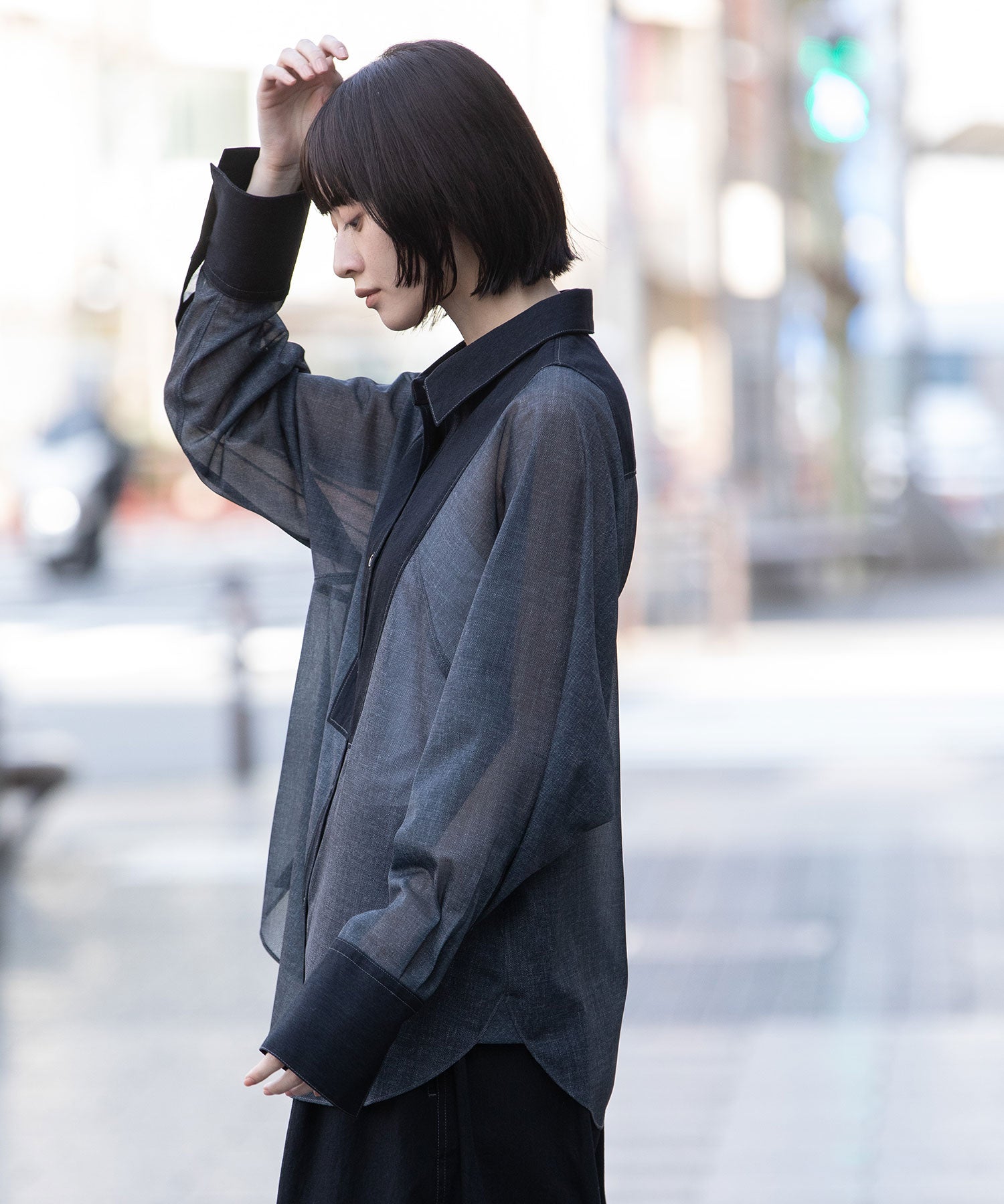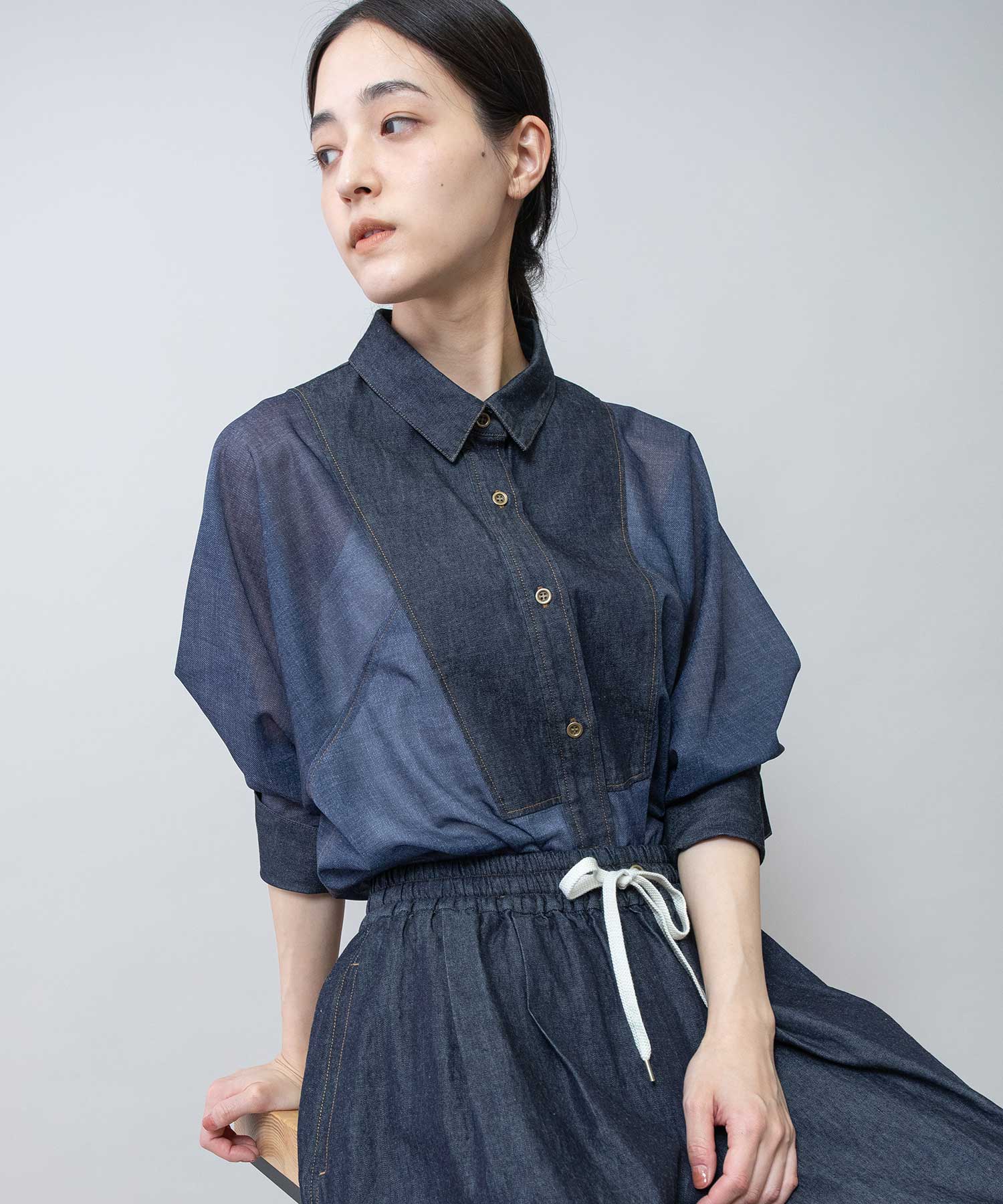 アーカイブのブザムシャツのディテールをアップデートして2種類のデニムを組み合わせたアイテムです。イカ胸や衿などキチンと感のほしいパーツには6ozデニム、身頃やたっぷりとした袖にはエアリーなシアーデニムを使うことでブラウス寄りなブザムシャツに仕立てました。カマの深いボリューム袖ですが切り替えをイカ胸に合わせてネック寄りに詰めているので前後とも華奢でシックな感じに素材が切り替わるのでより強調されます。