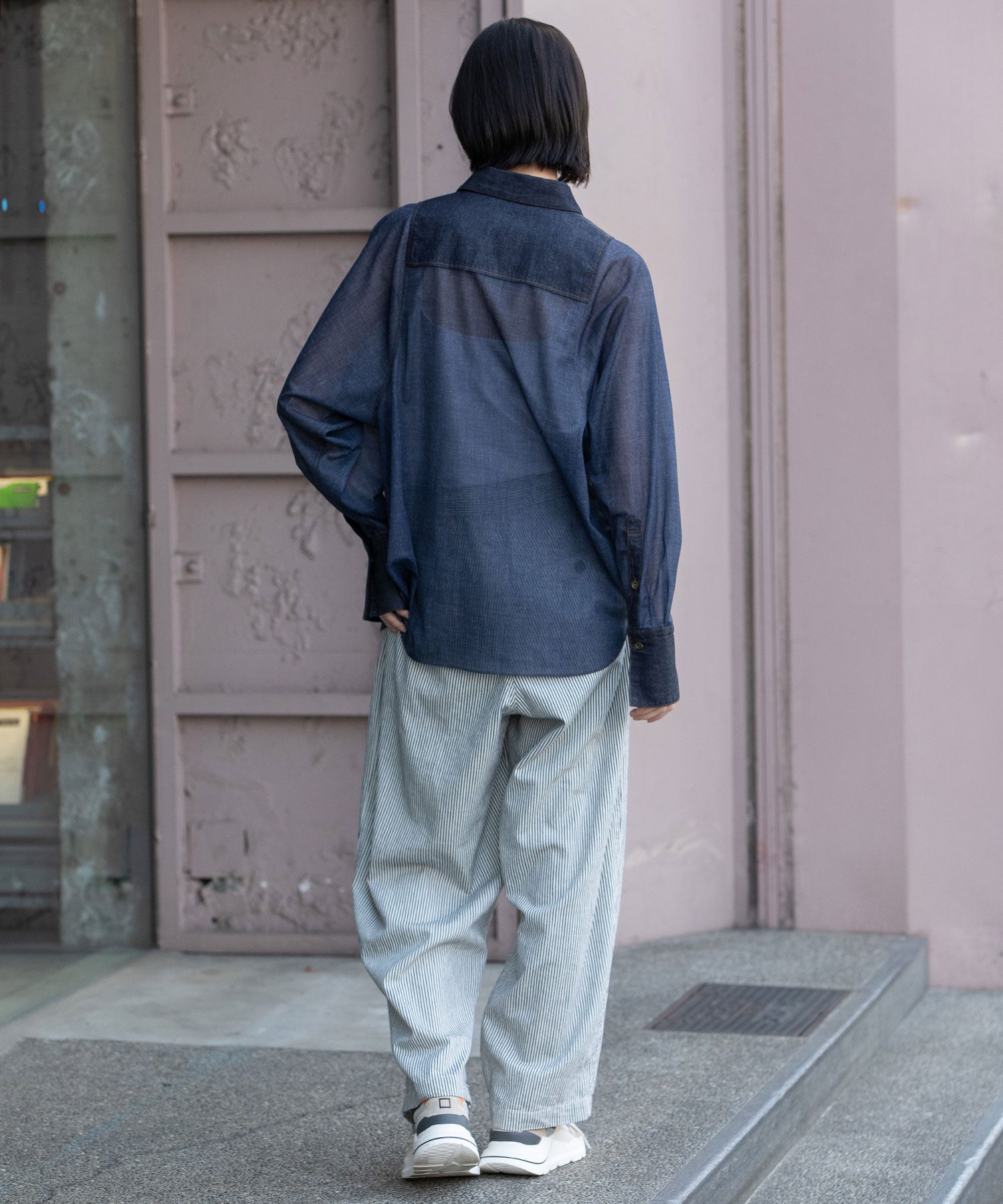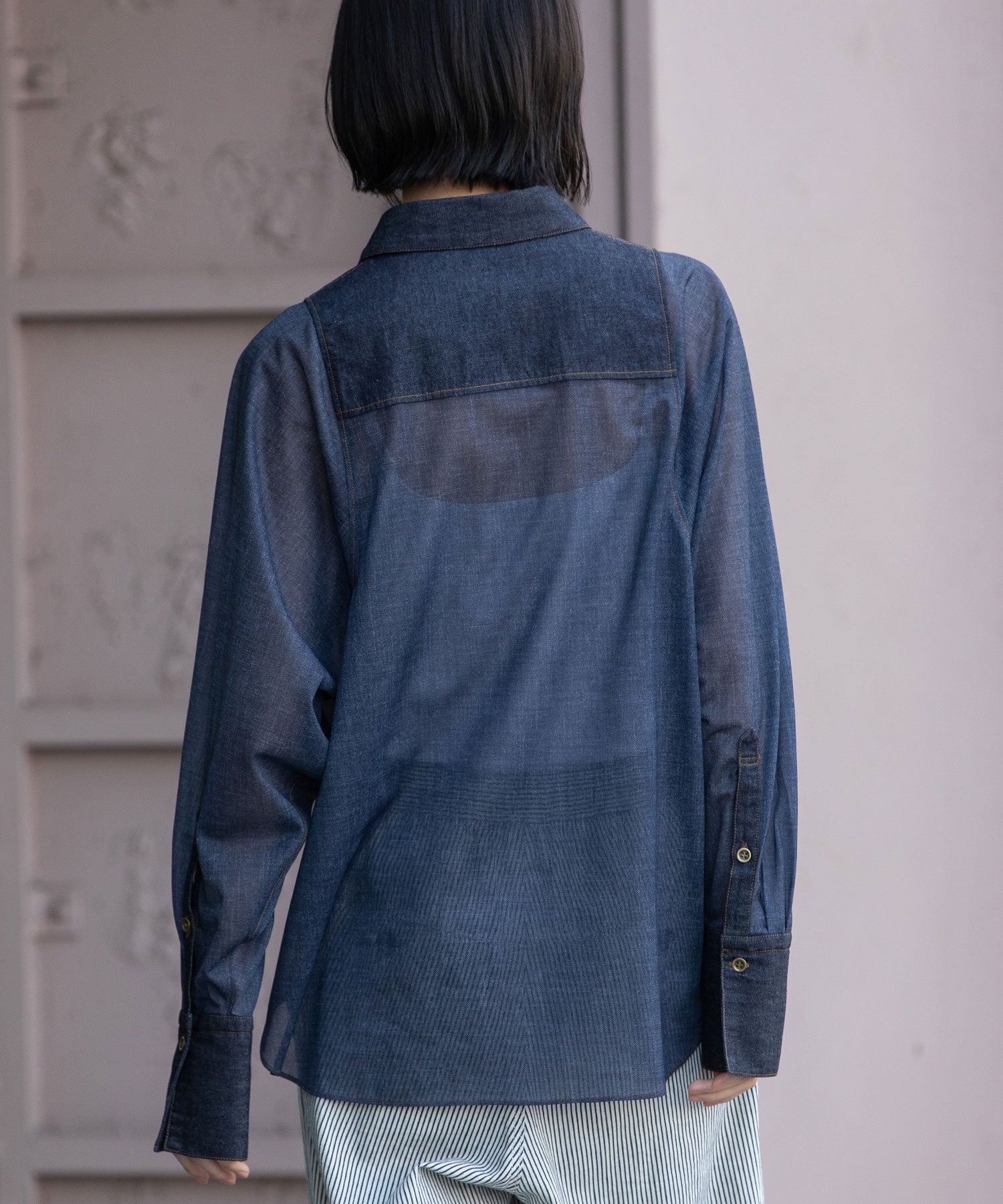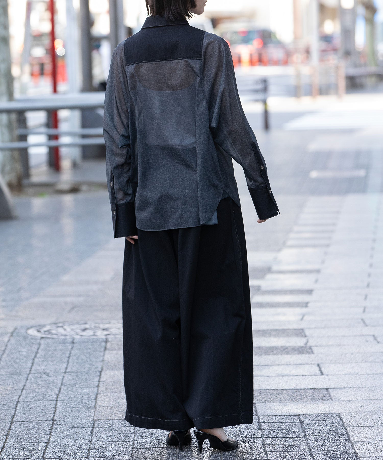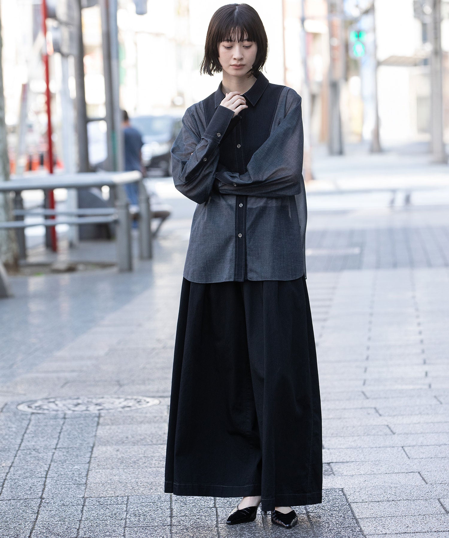 アーカイブのブザムシャツのディテールをアップデートして2種類のデニムを組み合わせたアイテムです。イカ胸や衿などキチンと感のほしいパーツには6ozデニム、身頃やたっぷりとした袖にはエアリーなシアーデニムを使うことでブラウス寄りなブザムシャツに仕立てました。カマの深いボリューム袖ですが切り替えをイカ胸に合わせてネック寄りに詰めているので前後とも華奢でシックな感じに素材が切り替わるのでより強調されます。