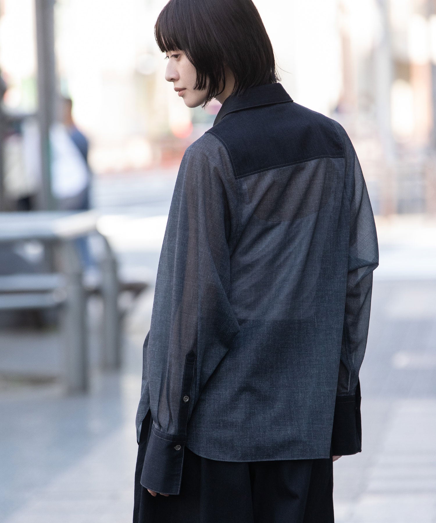 ◆6ozライトデニムとシアー感のあるデニムプリント生地をドッキングさせたシンプルに見えつつもデザイン性の高いシャツ◆