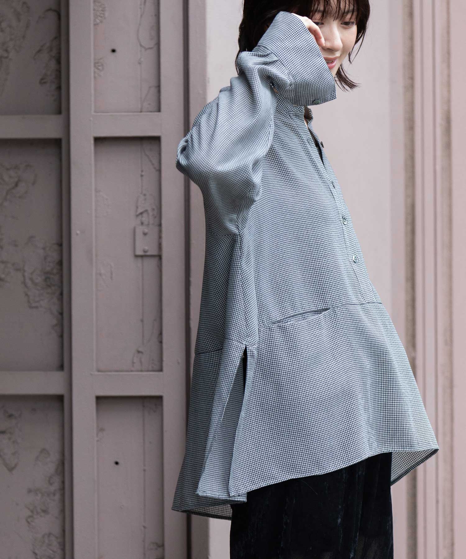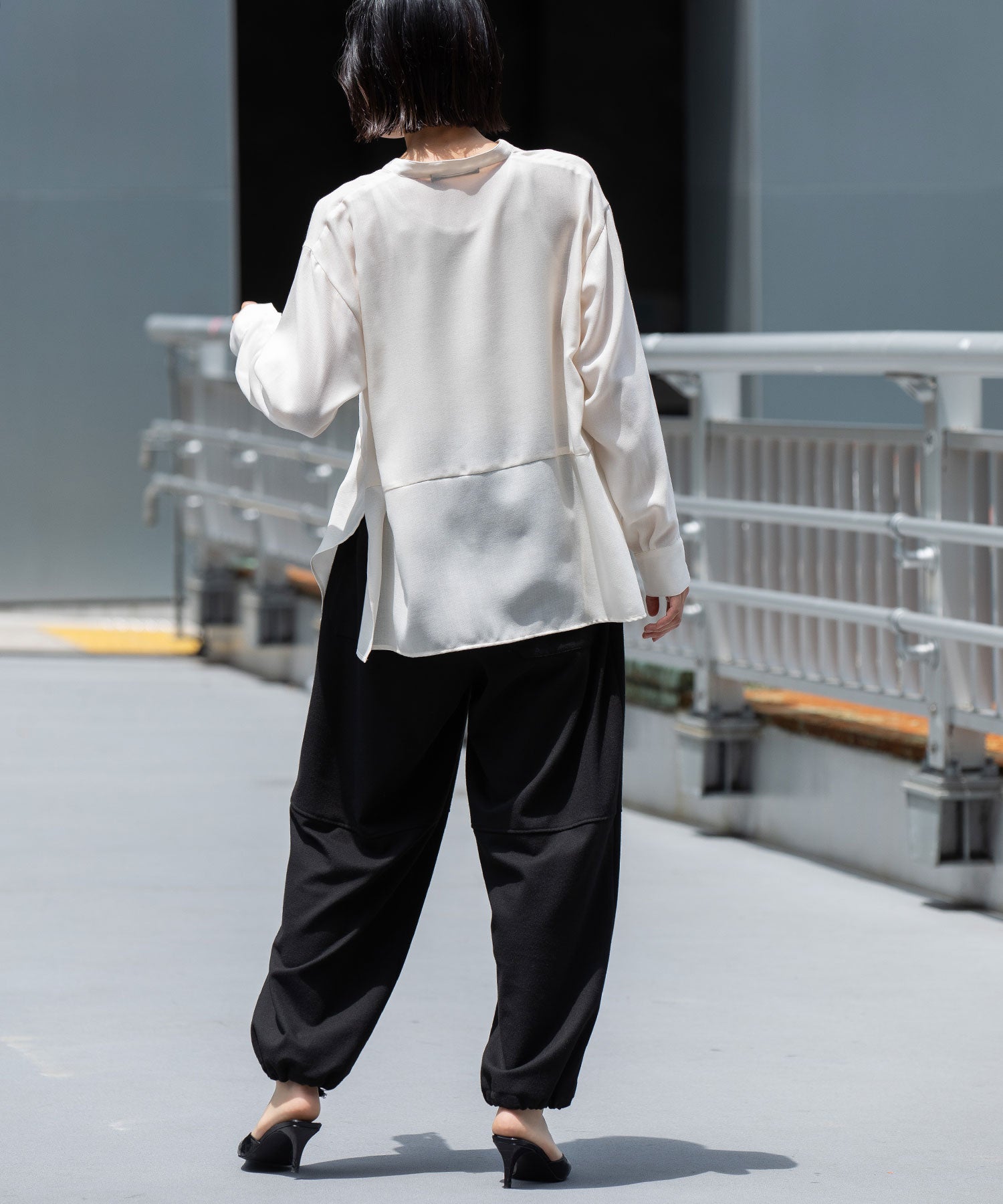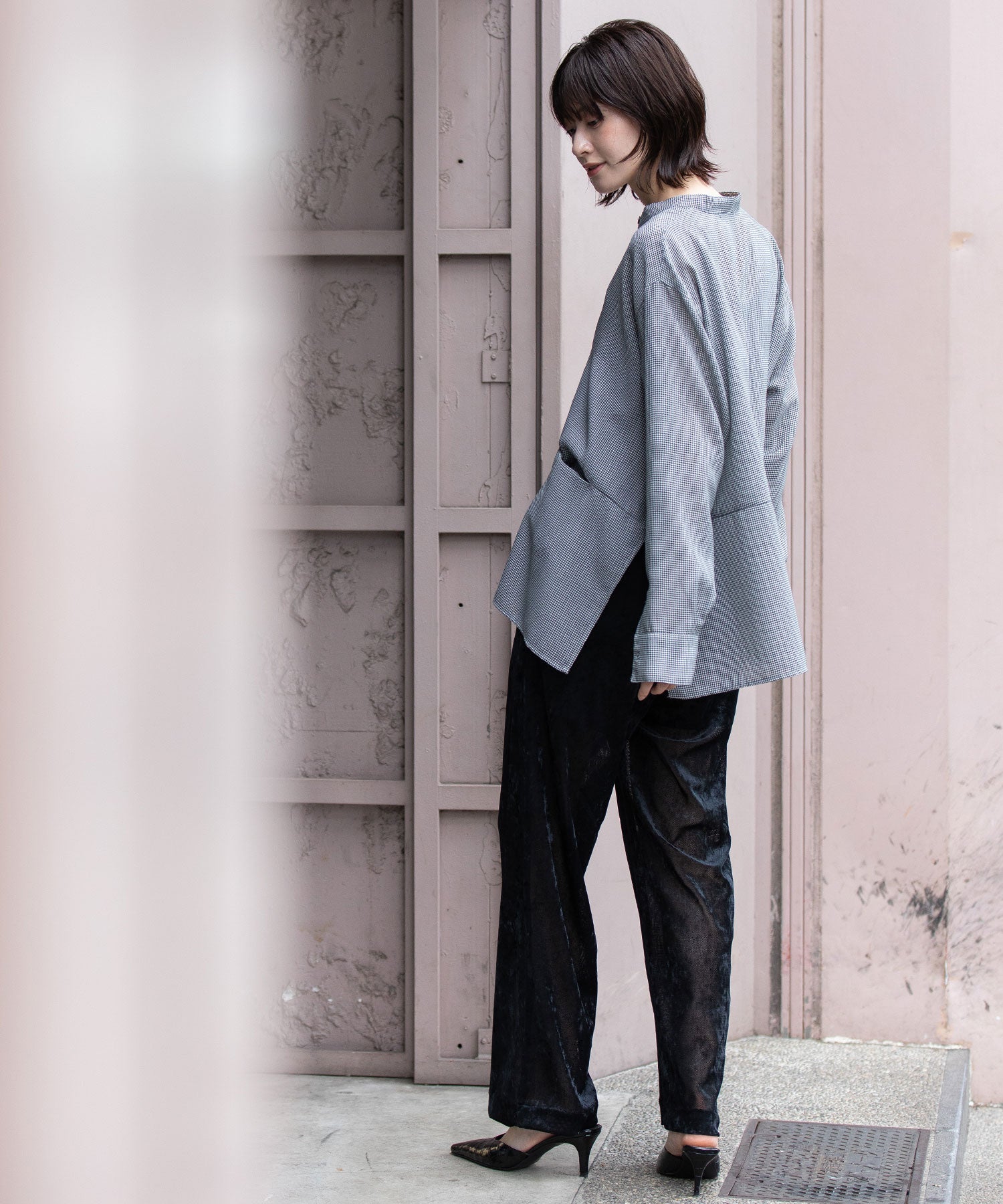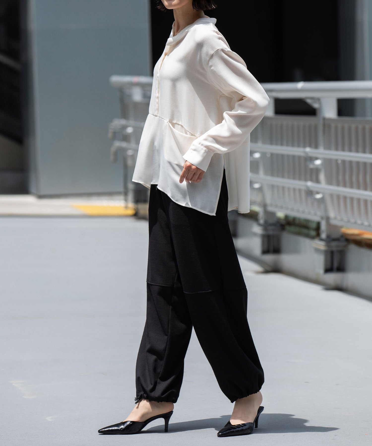 生地のドレープ性によって裾切替え部分に配したポケットが開き、デザインのアクセントになっています。