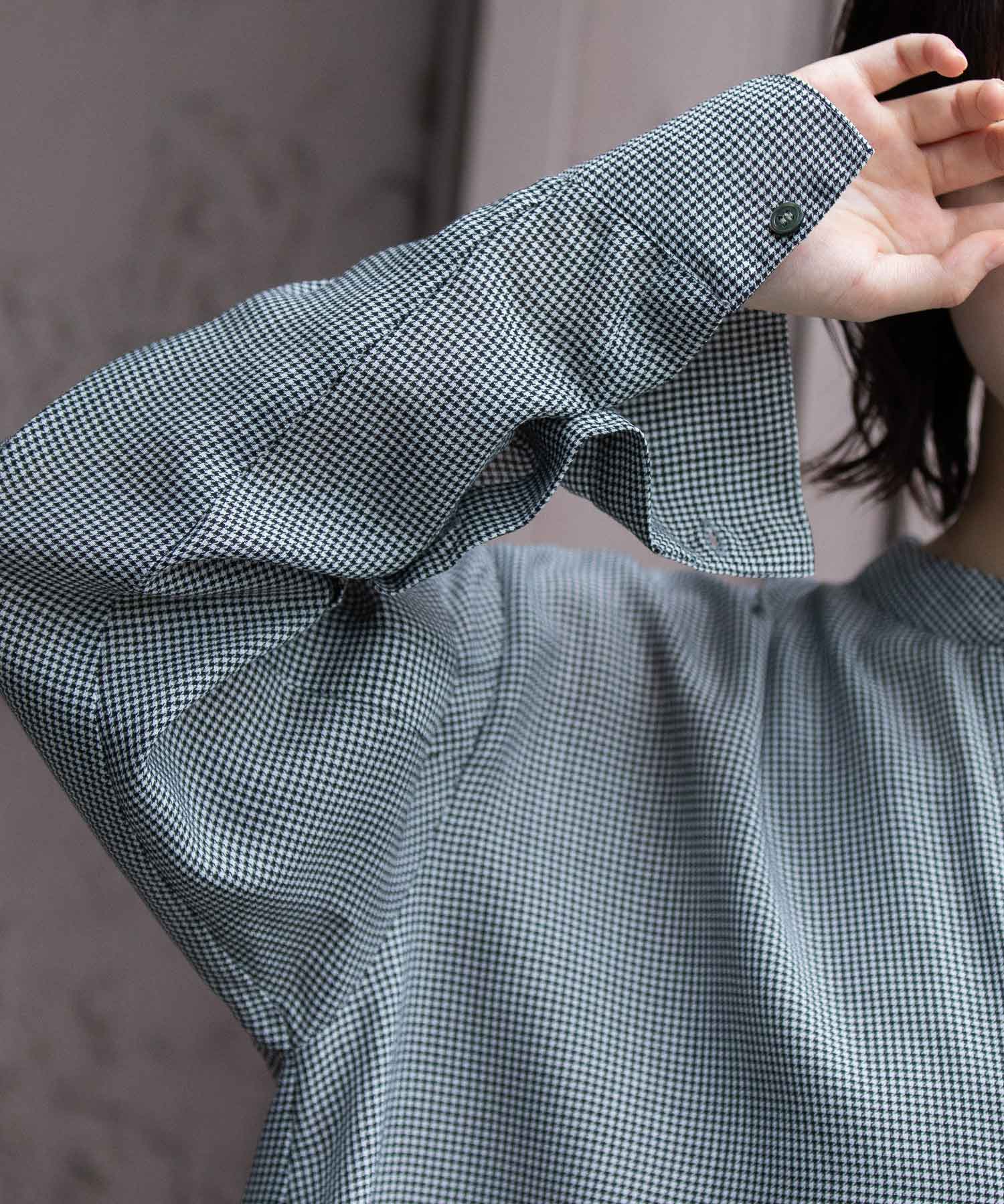 袖は前側に開きをつくり、釦でポイントを付けました。釦を開けてラフに着るのも可愛いです。