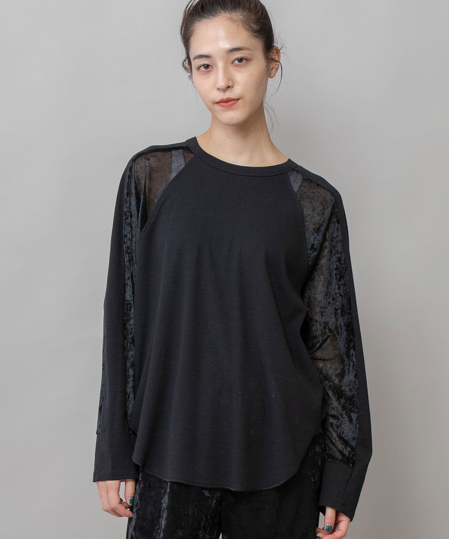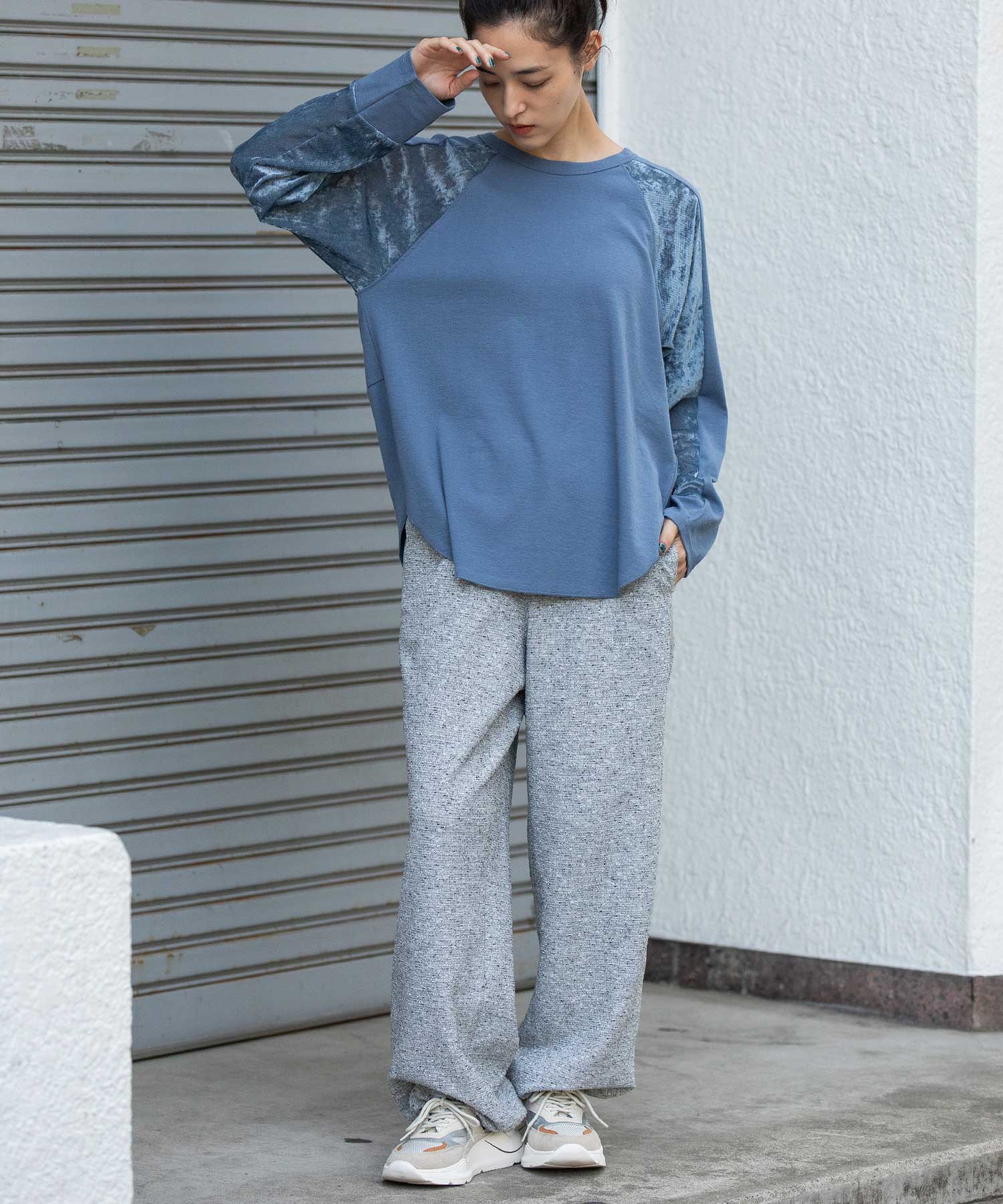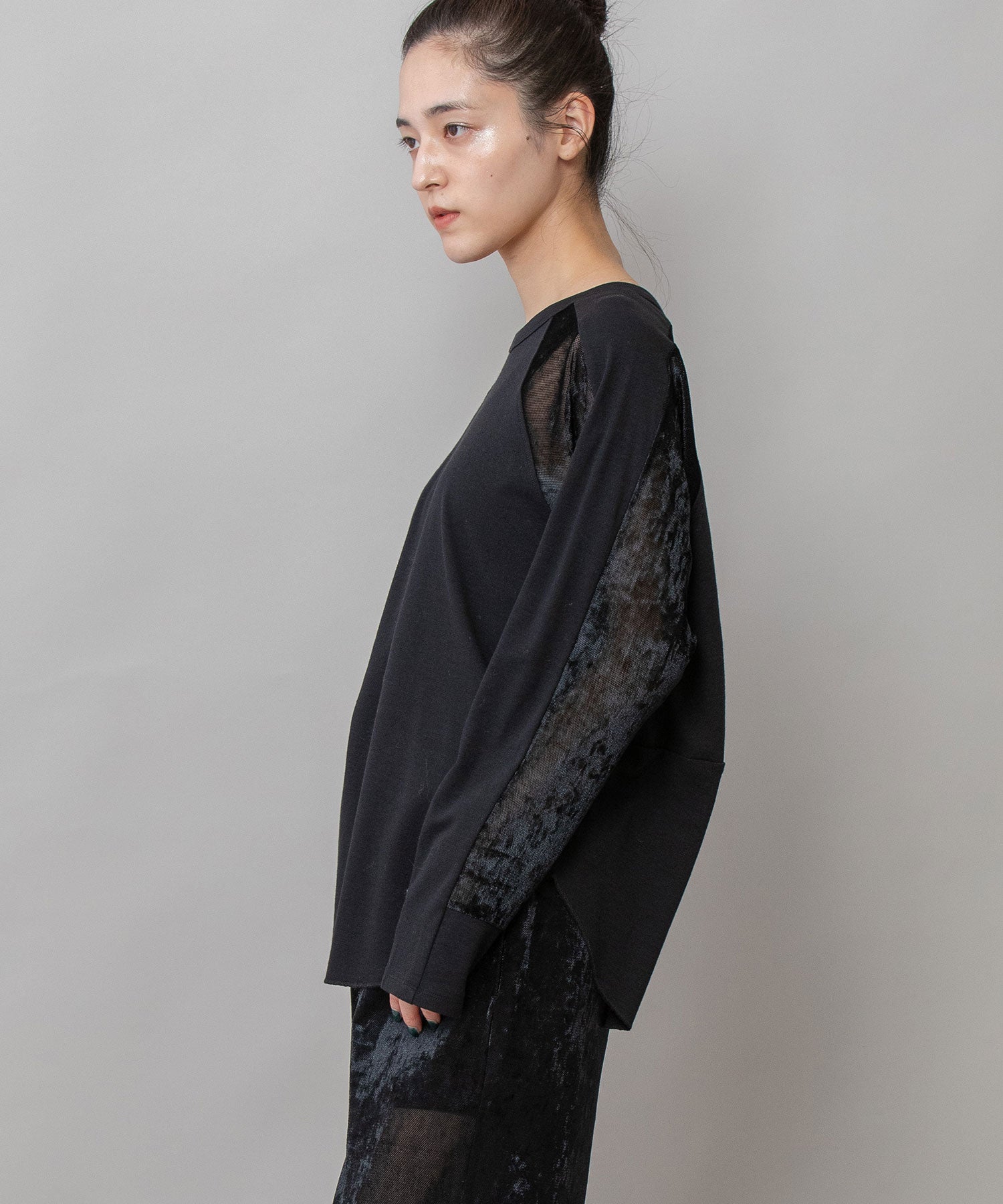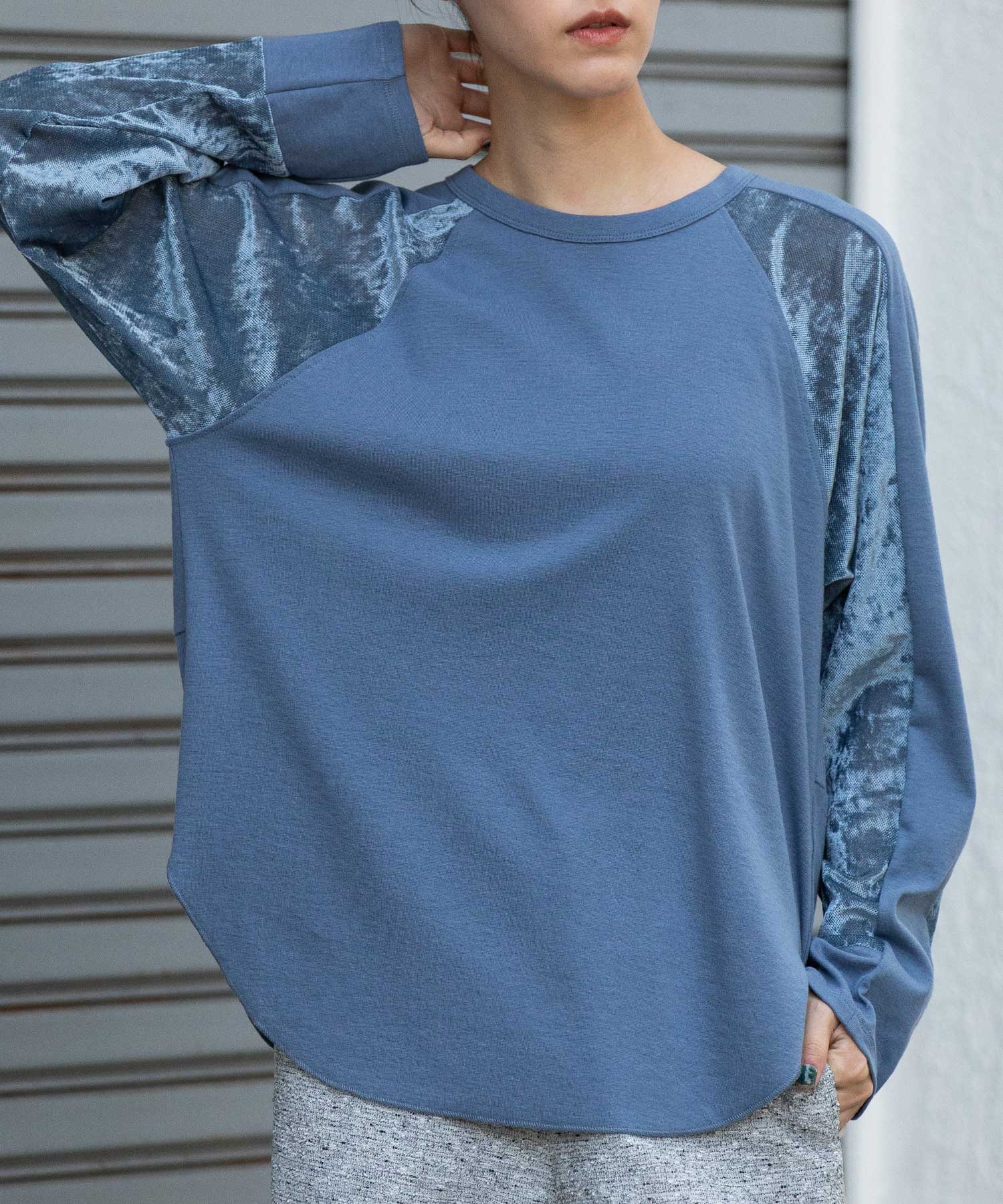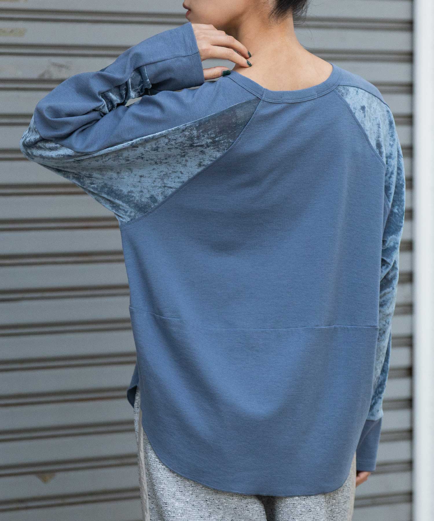秋冬シーズンならではの光沢感のあるベロアで切り替えることで、一枚で様になるデザイントップスに仕上げています。