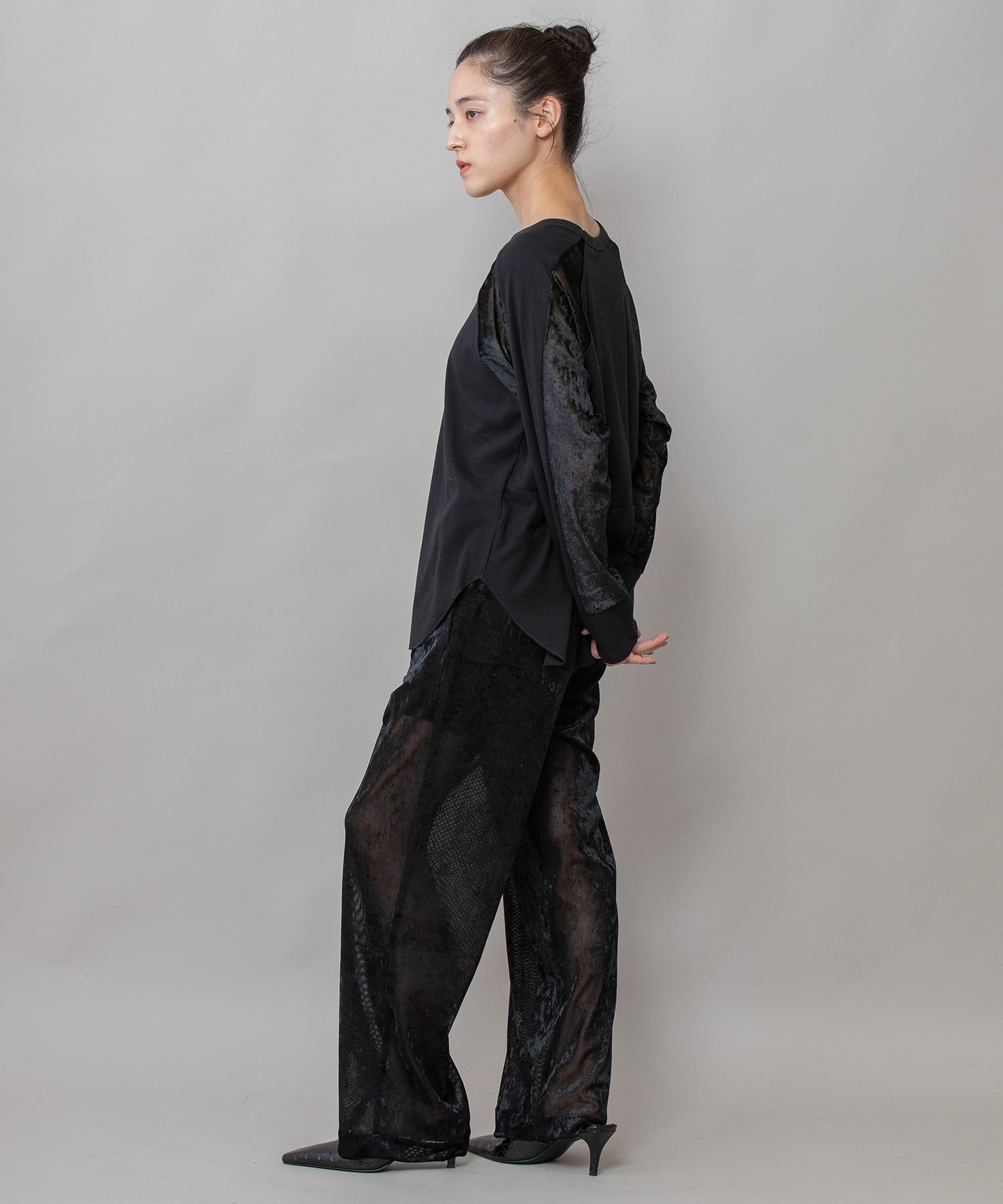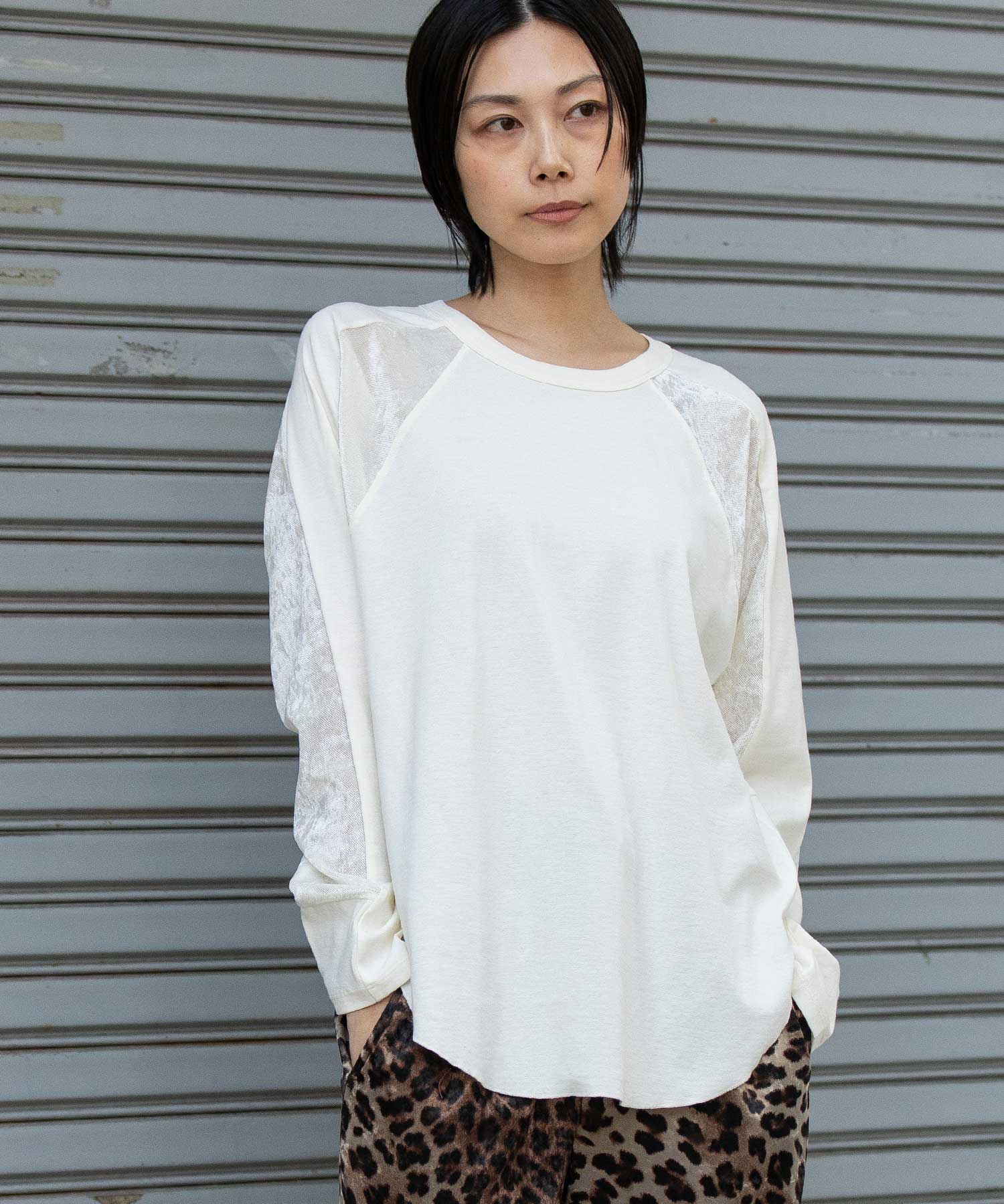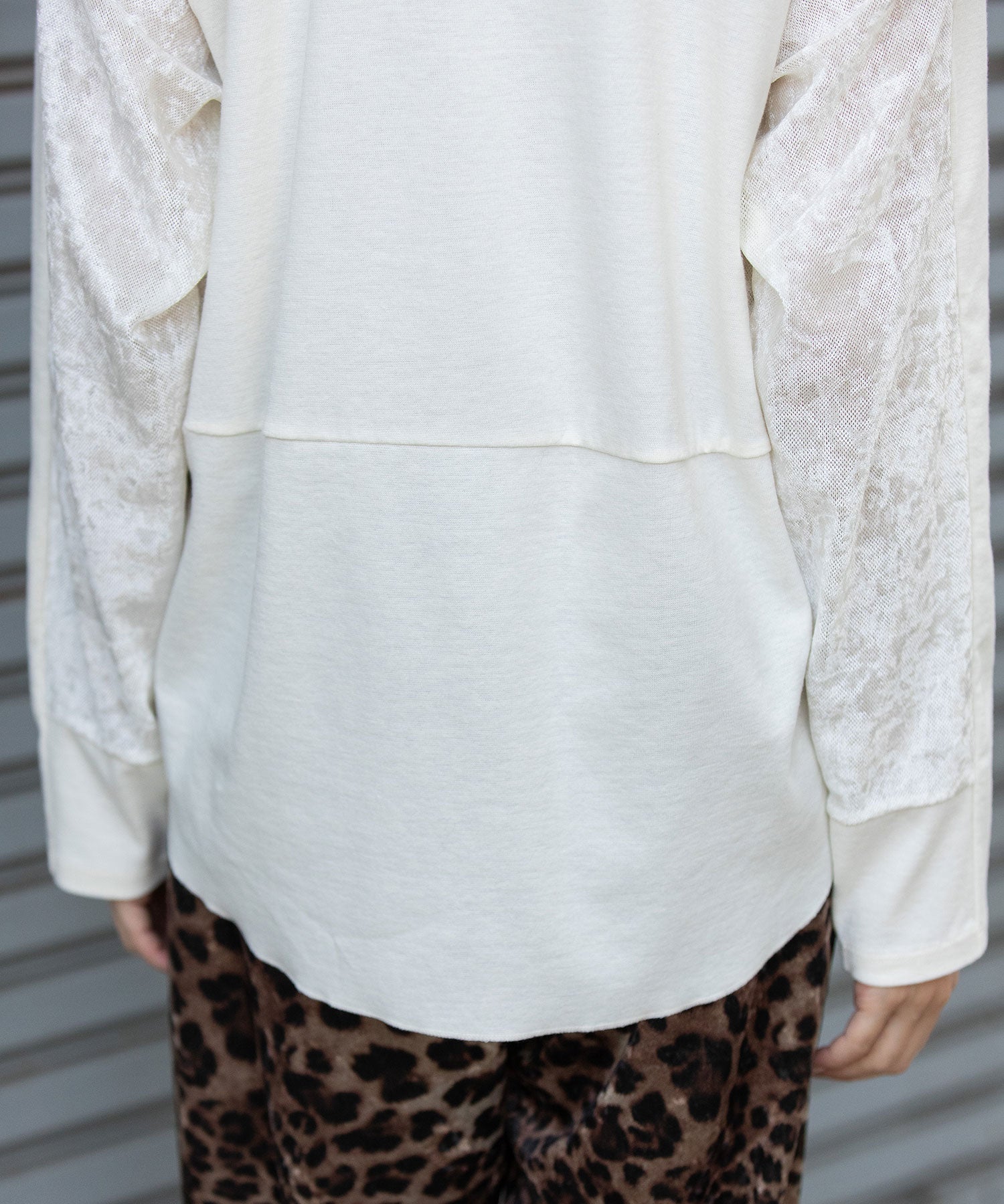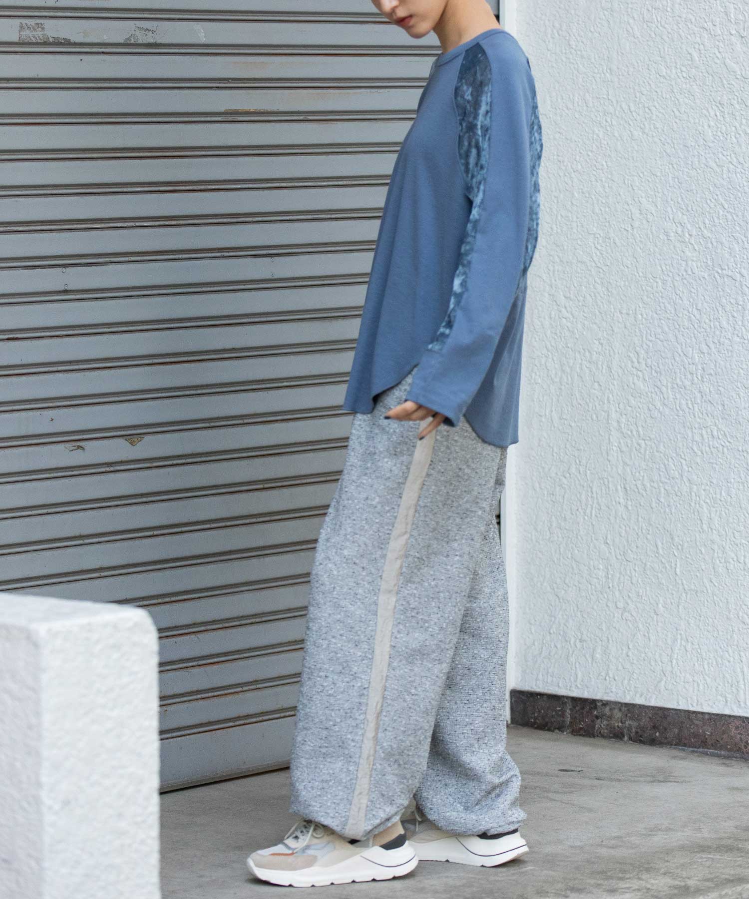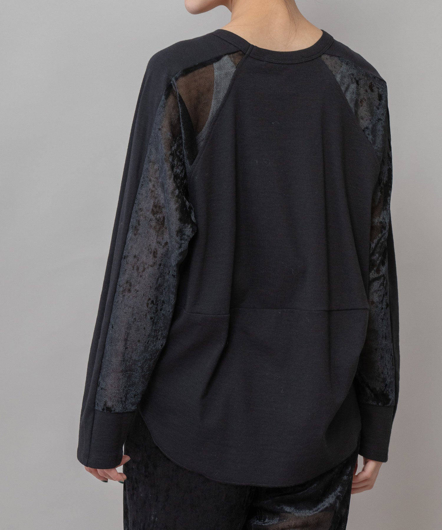 秋冬シーズンならではの光沢感のあるベロアで切り替えることで、一枚で様になるデザイントップスに仕上げています。
