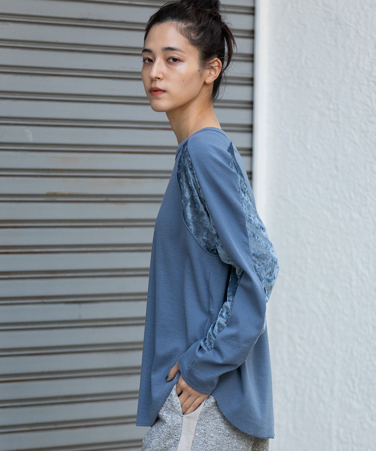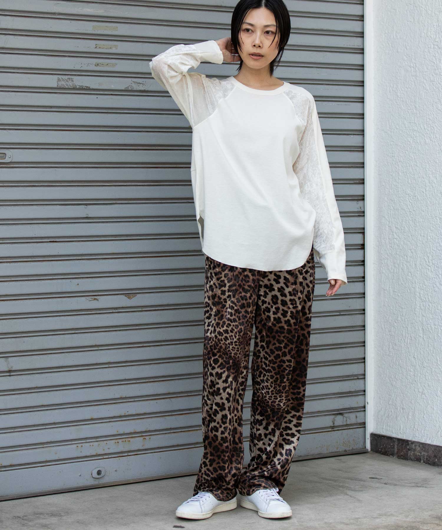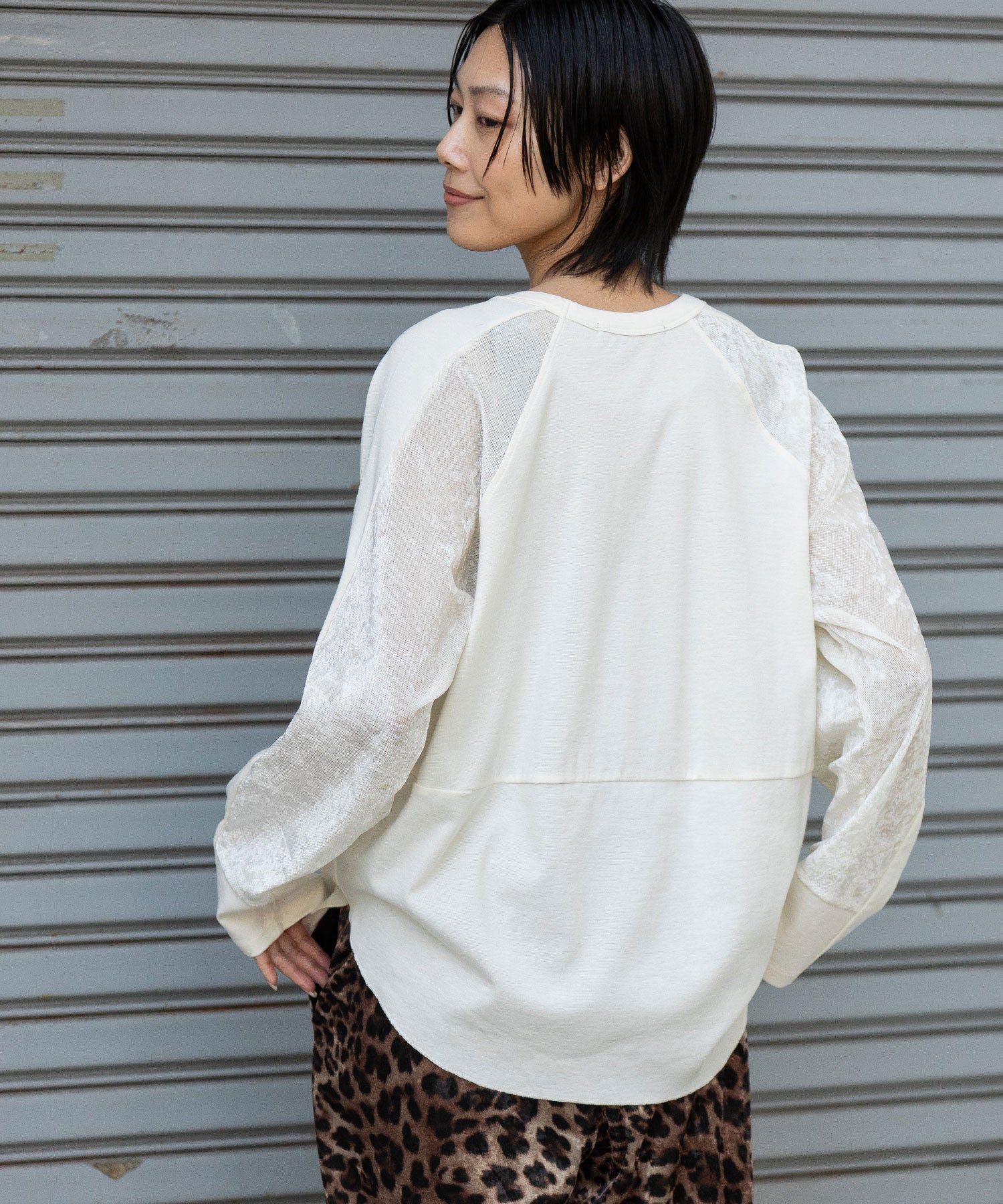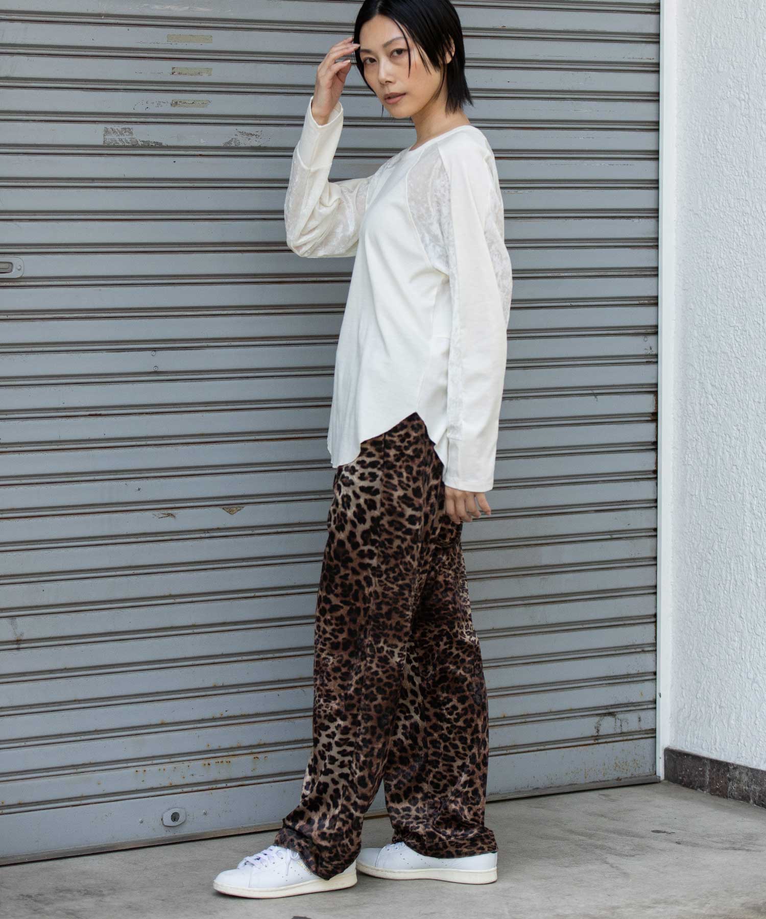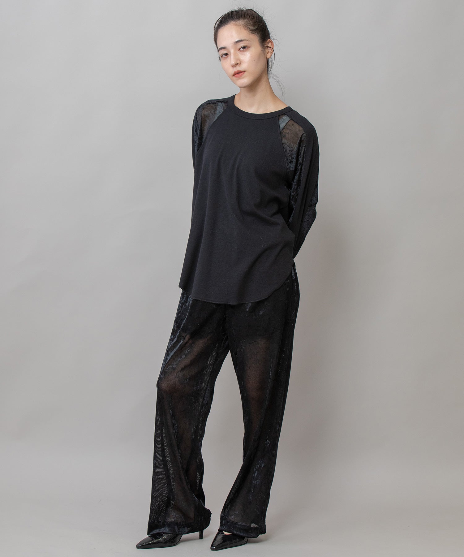 秋冬シーズンならではの光沢感のあるベロアで切り替えることで、一枚で様になるデザイントップスに仕上げています。