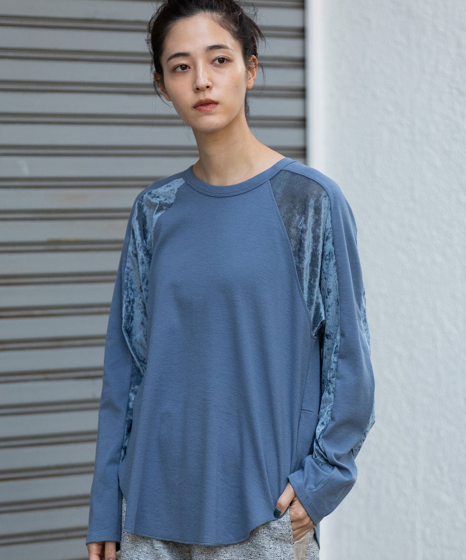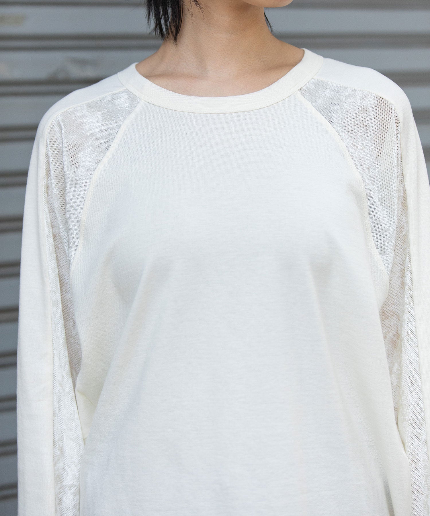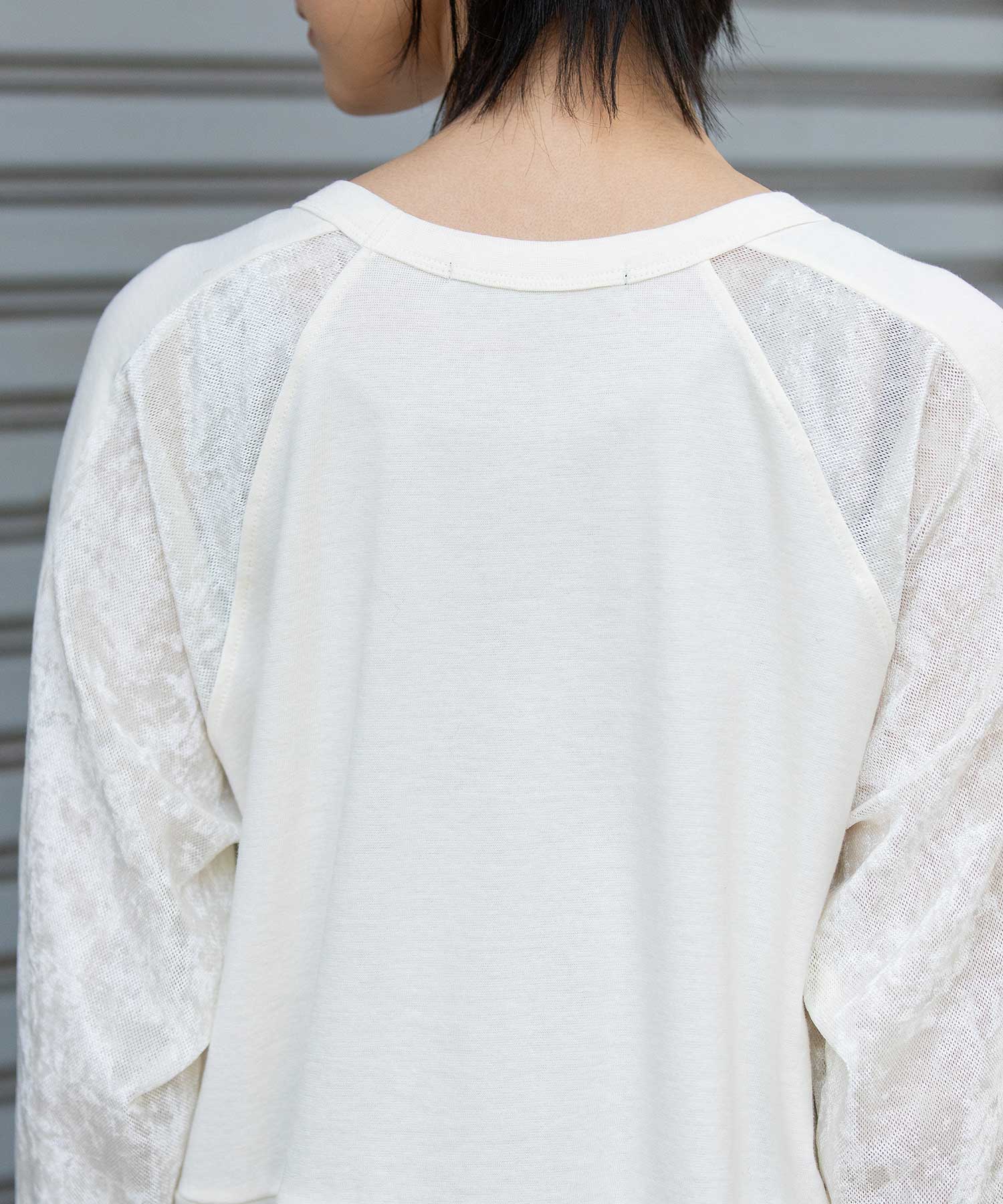 袖下側を同色のメッシュベロアで切り替え、アクセントをつけています。