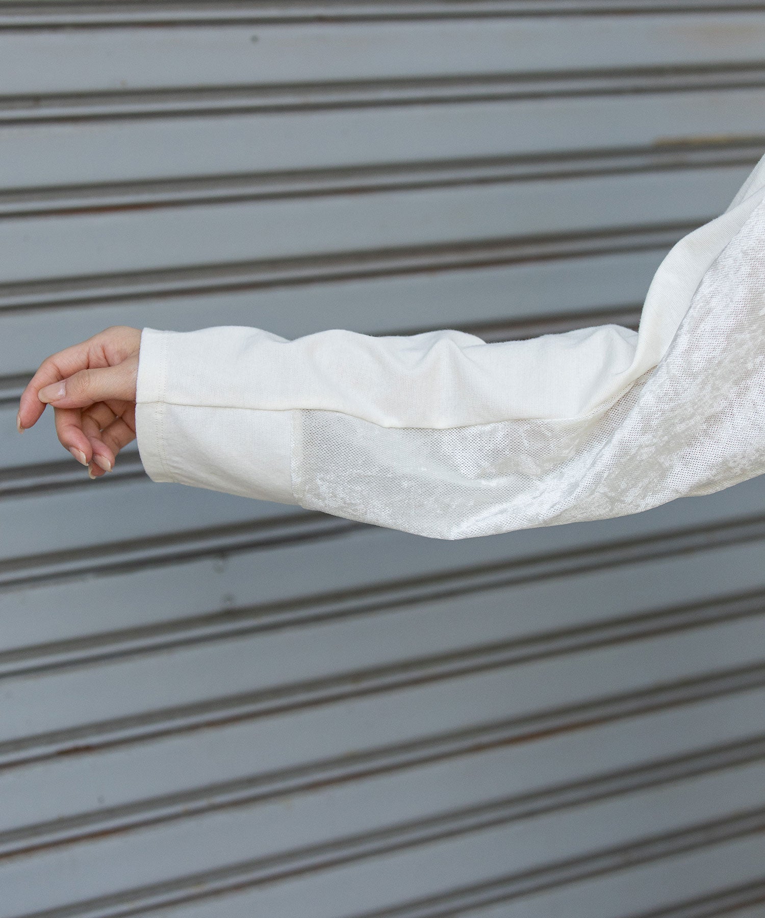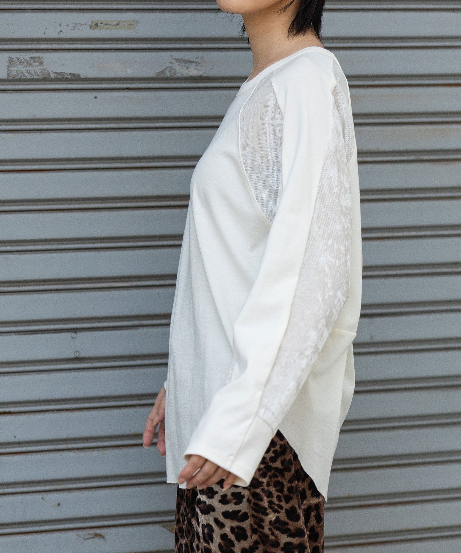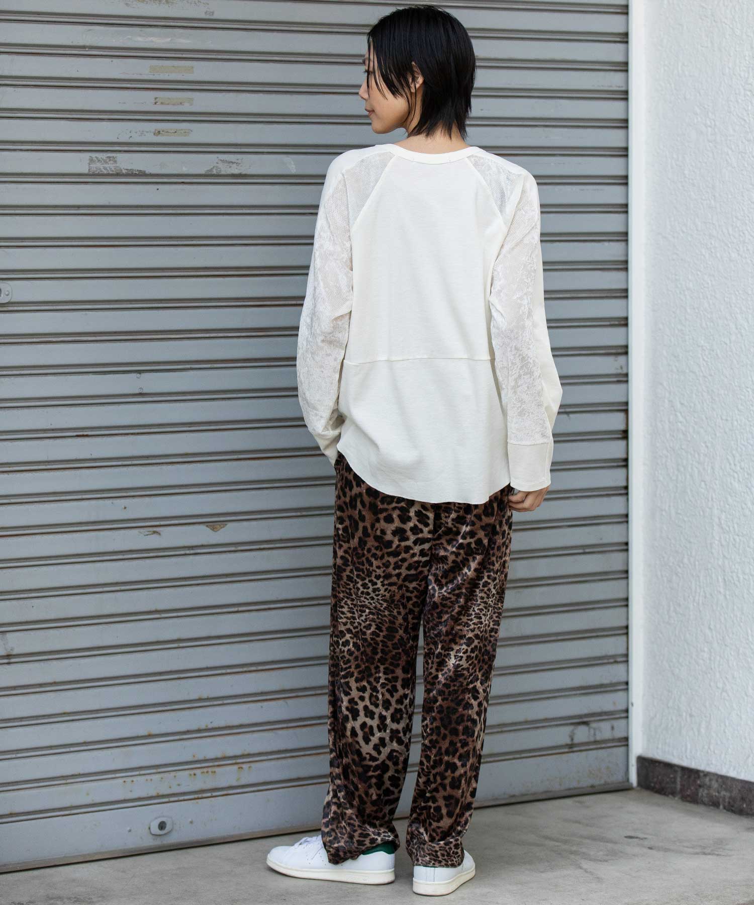 袖下側を同色のメッシュベロアで切り替え、アクセントをつけています。
