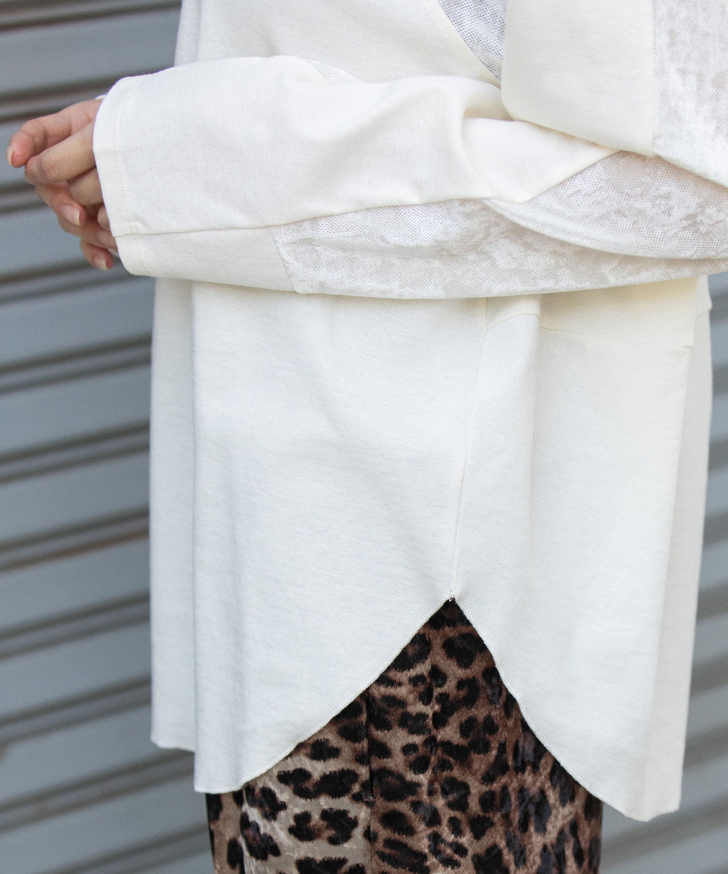 ヒップが隠れるほどの長めの丈感で、後ろ身頃にほんのり丸みをつけています。