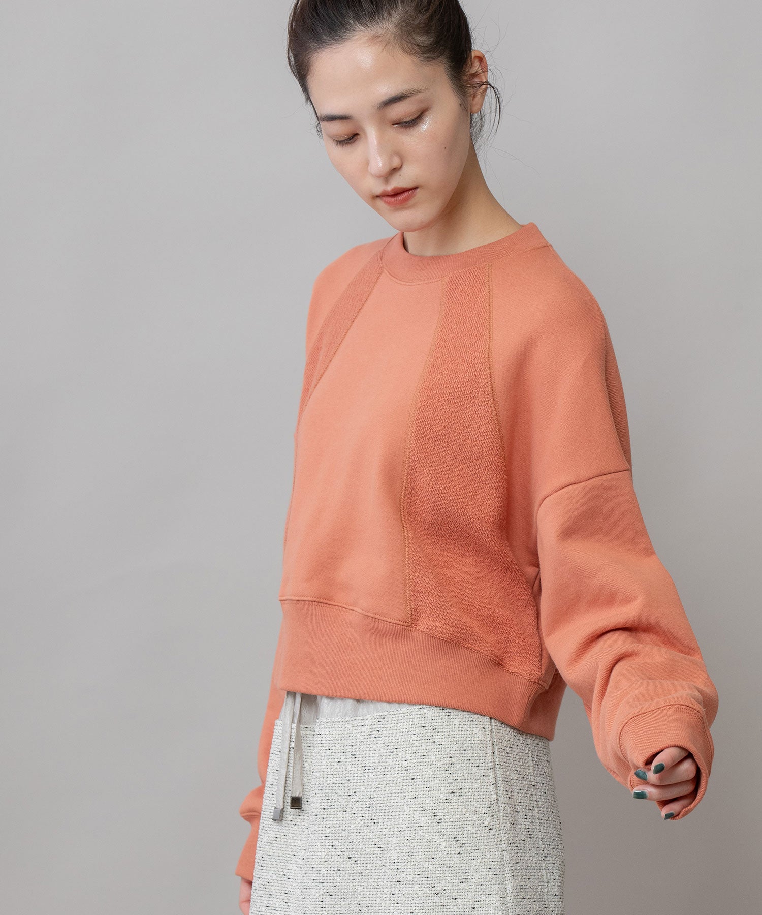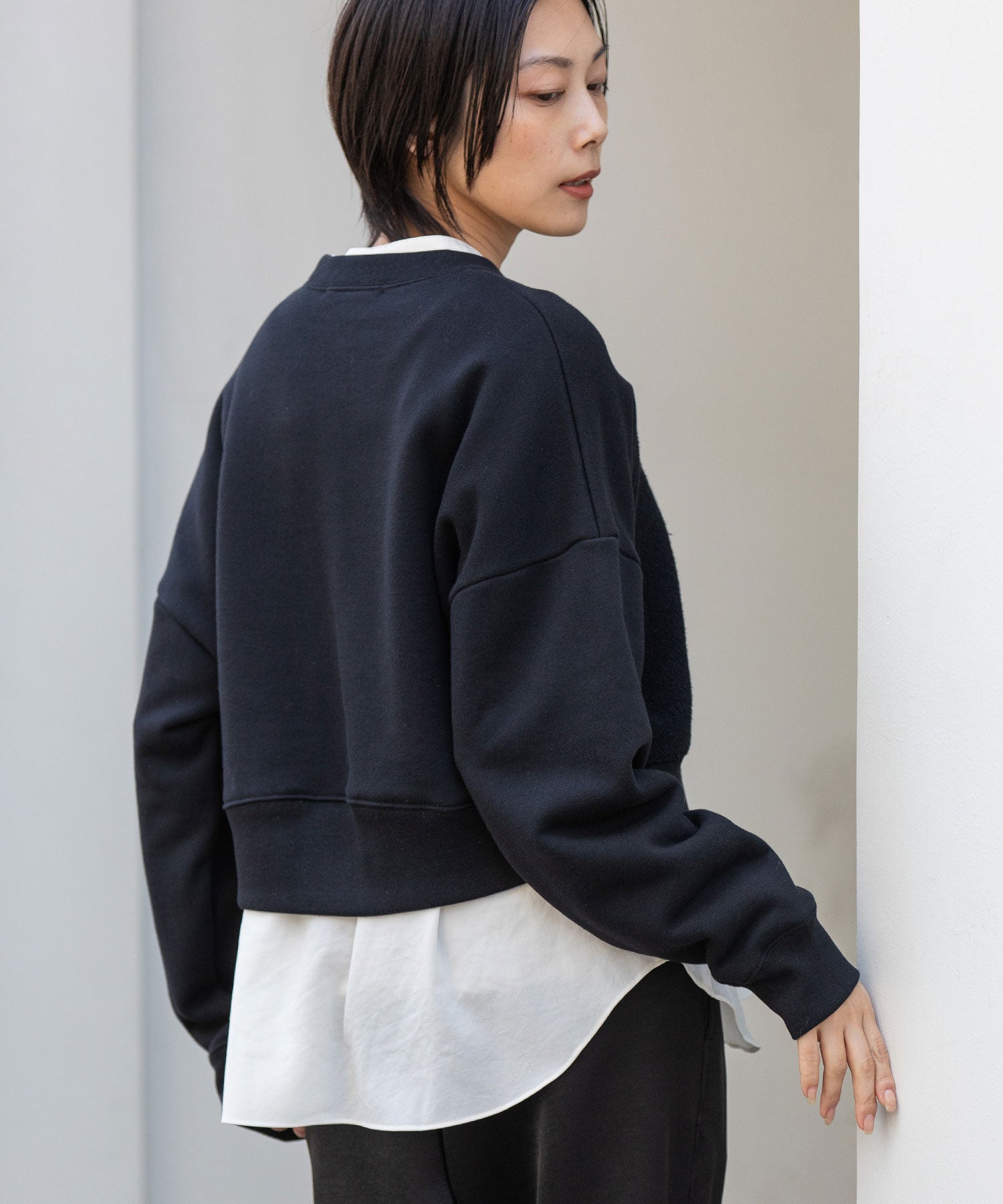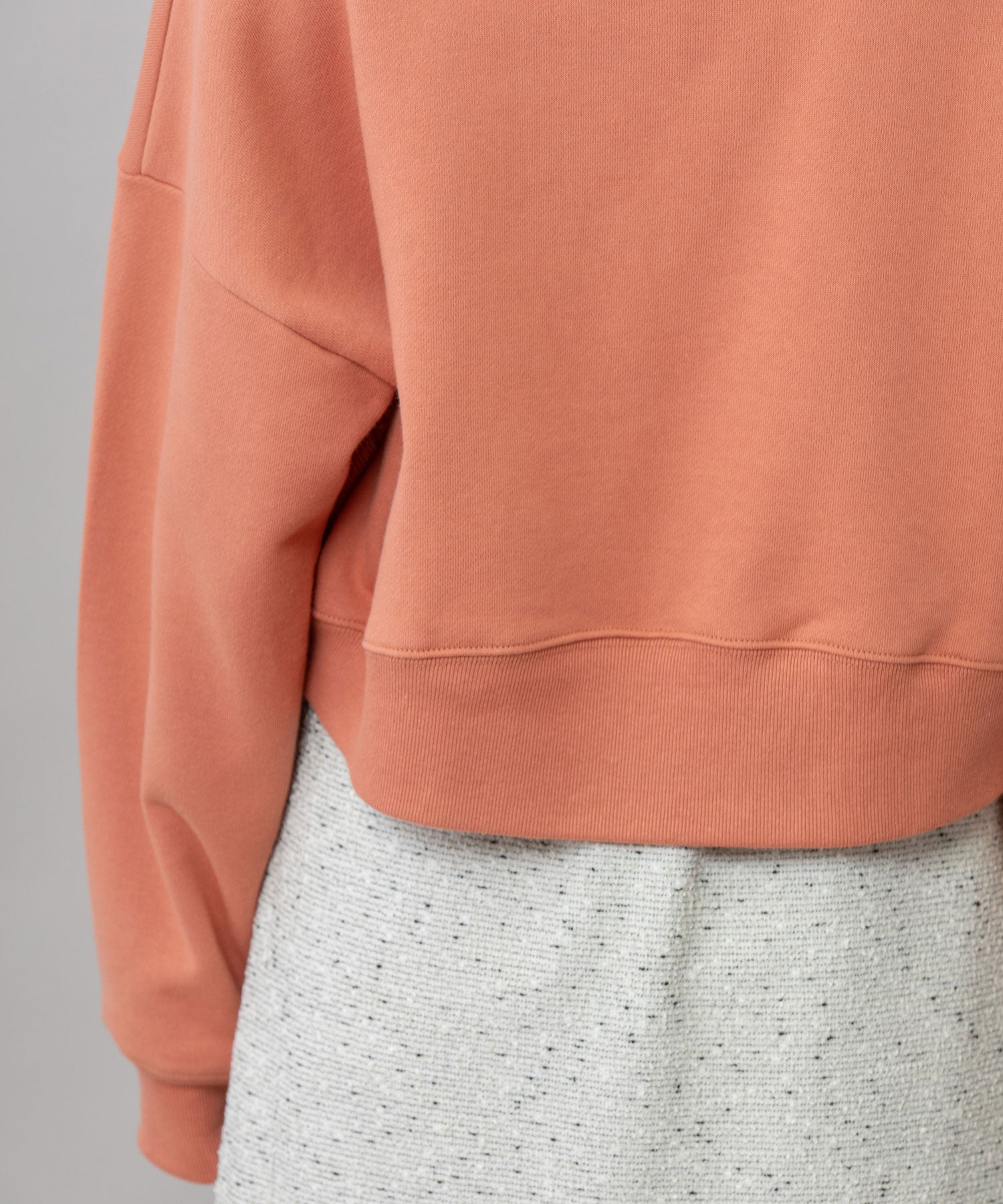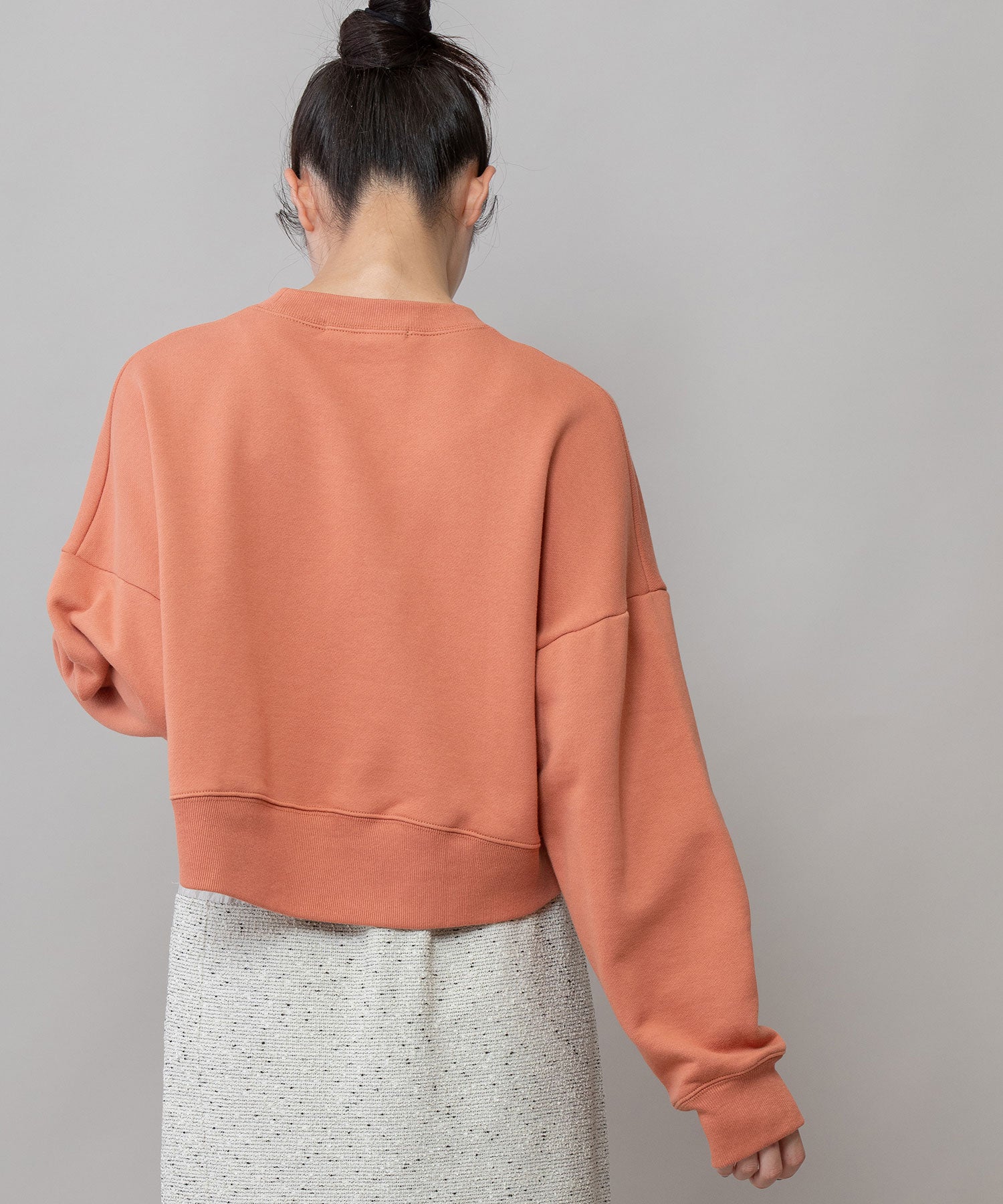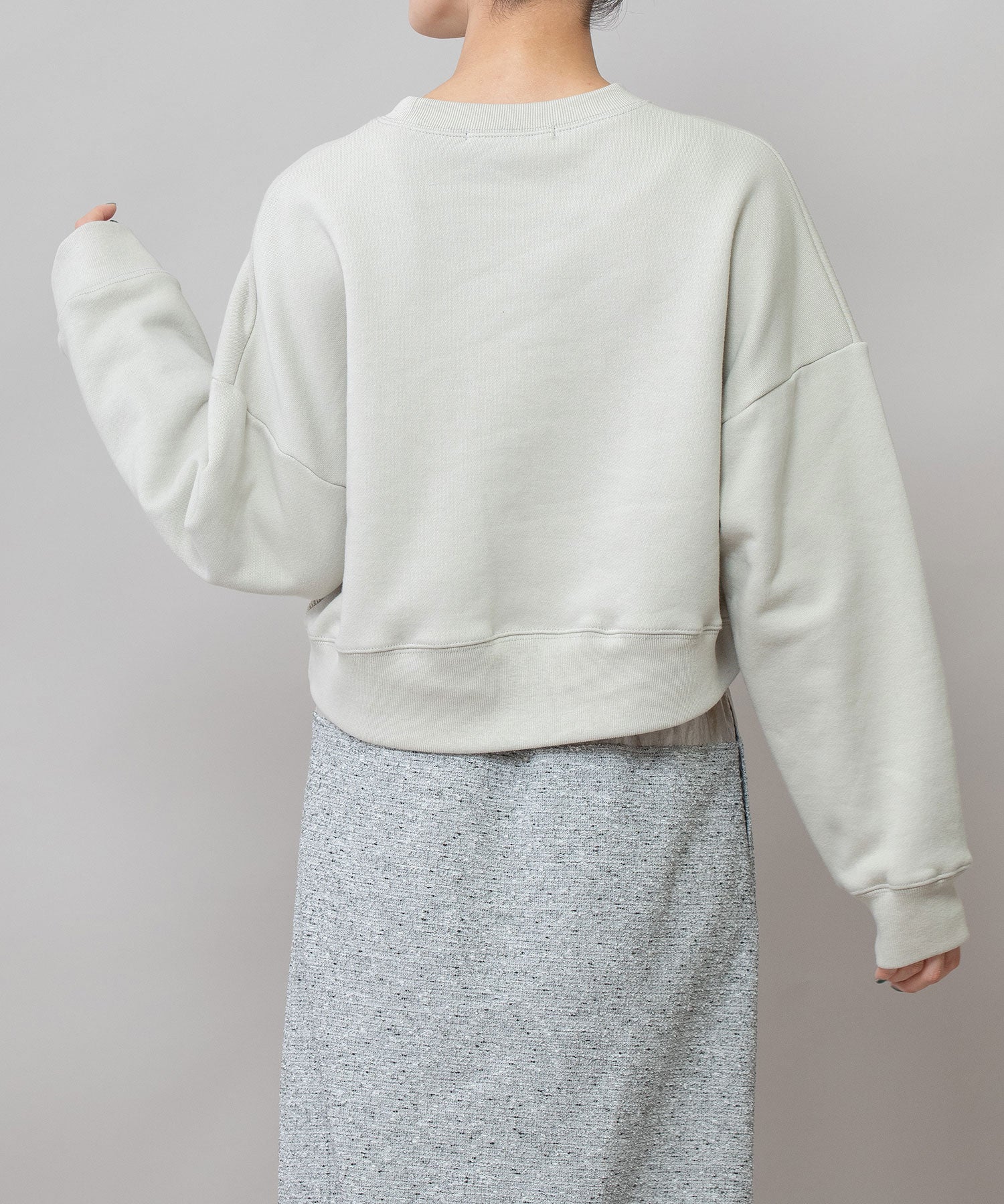 ラフに着られるコットン裏毛を使用し、ゆるっとした長めの袖にクロップド丈のバランスが新鮮なショートスウェットトップス。