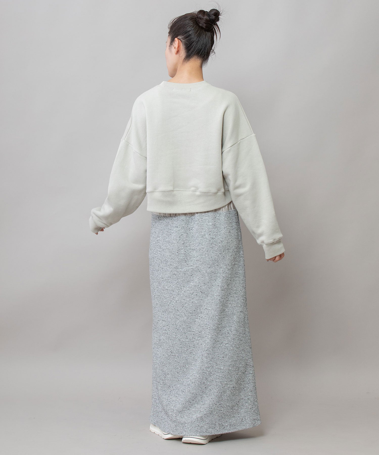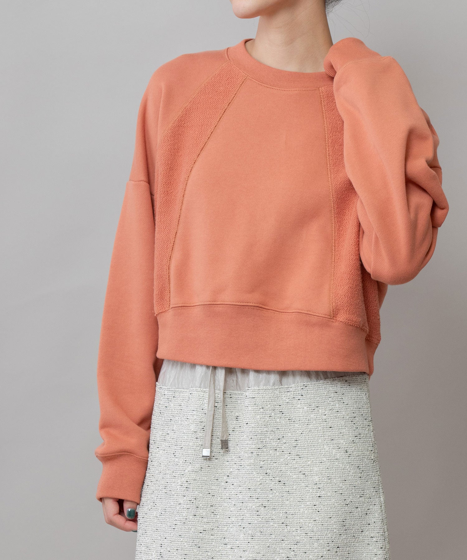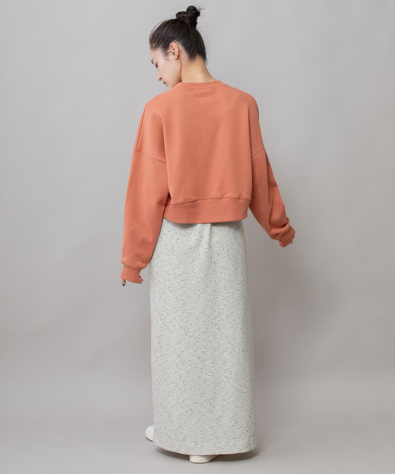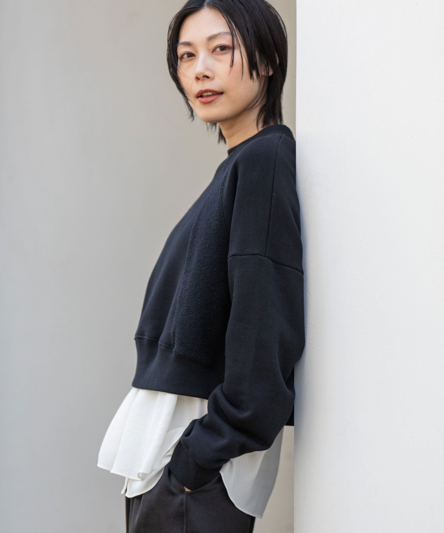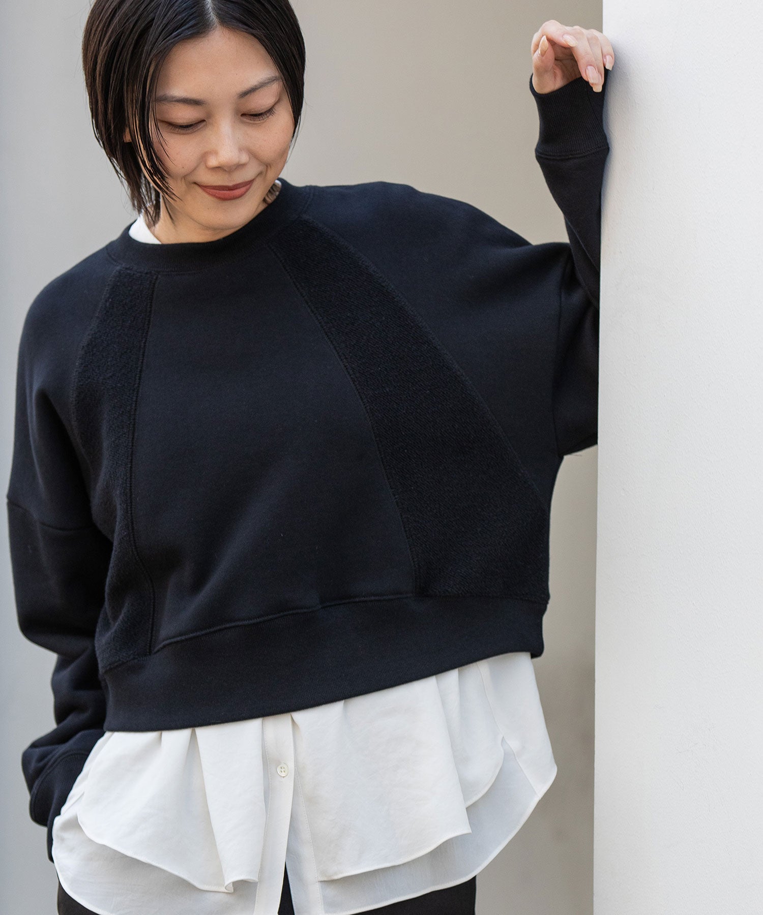 ラフに着られるコットン裏毛を使用し、ゆるっとした長めの袖にクロップド丈のバランスが新鮮なショートスウェットトップス。