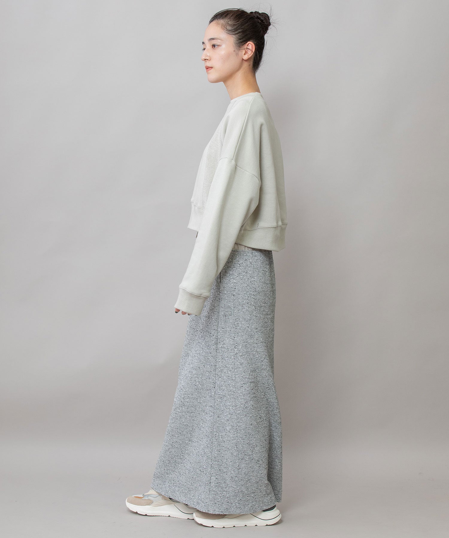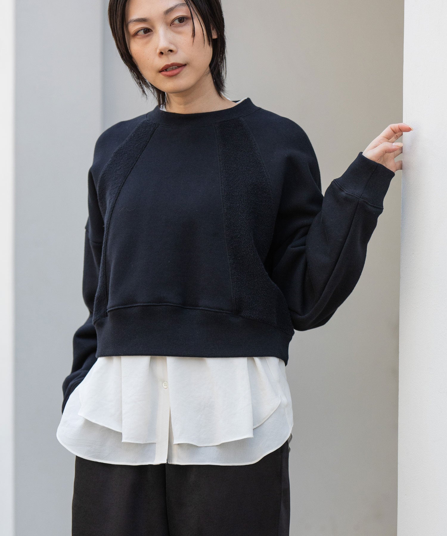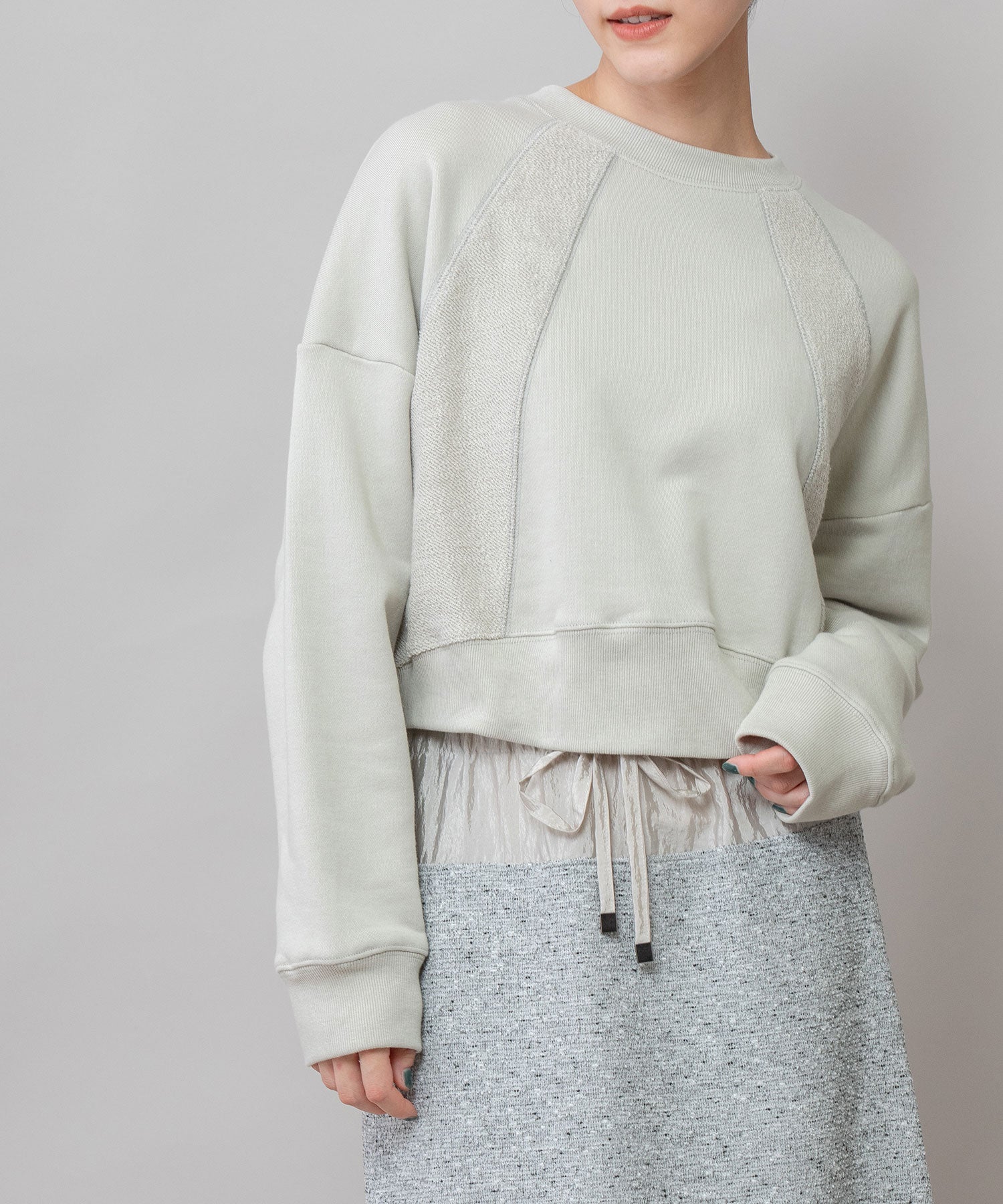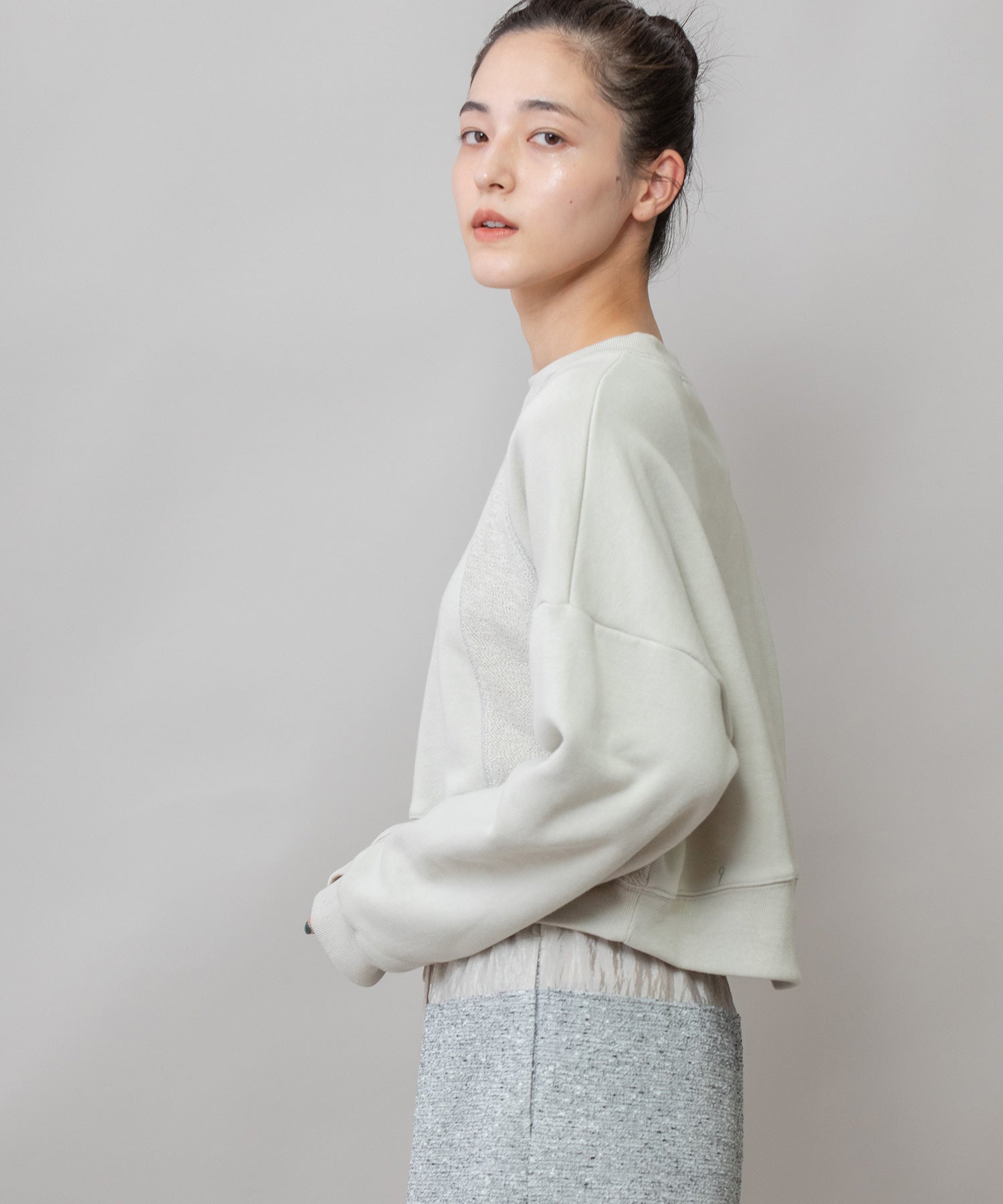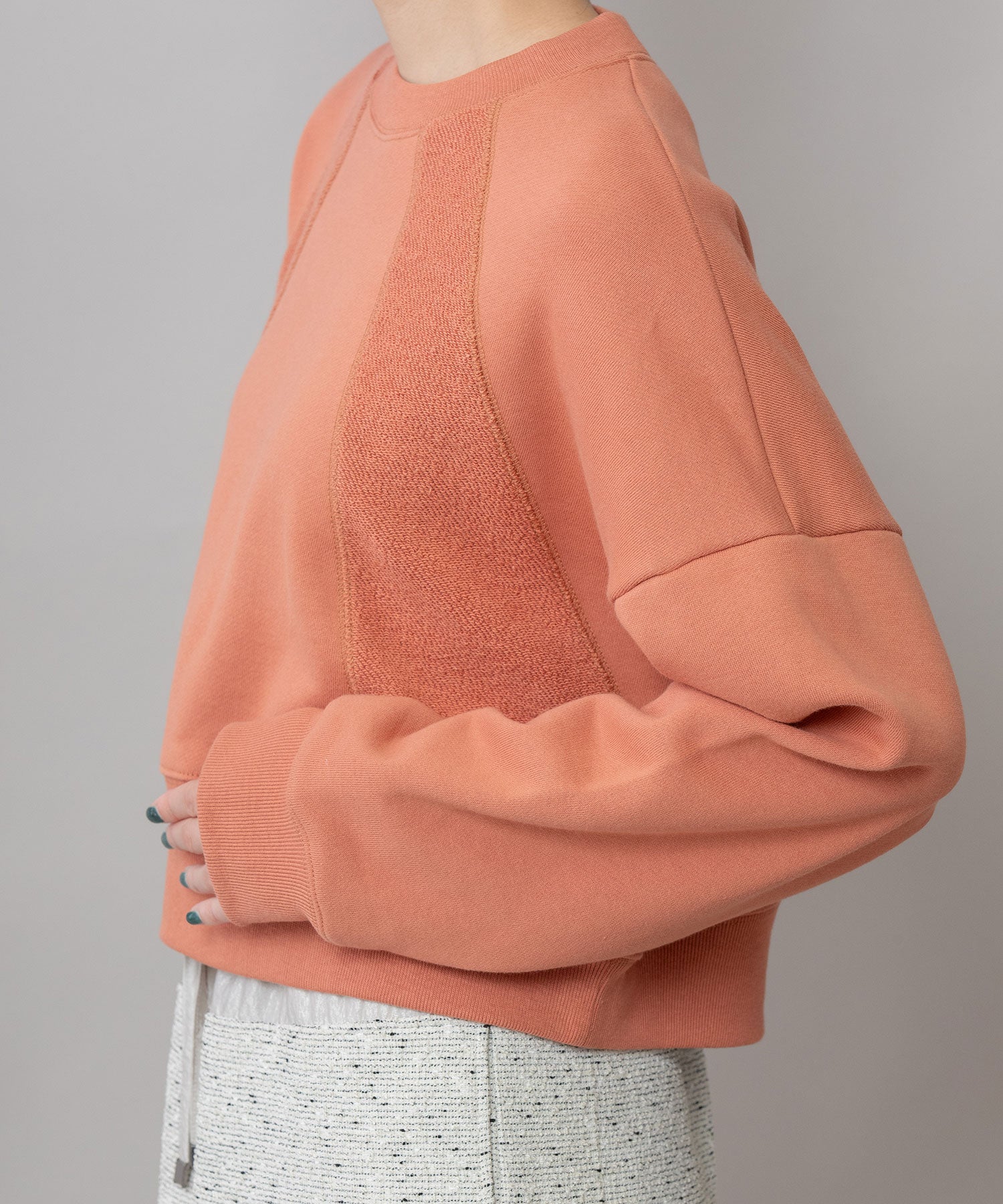 ラフに着られるコットン裏毛を使用し、ゆるっとした長めの袖にクロップド丈のバランスが新鮮なショートスウェットトップス。