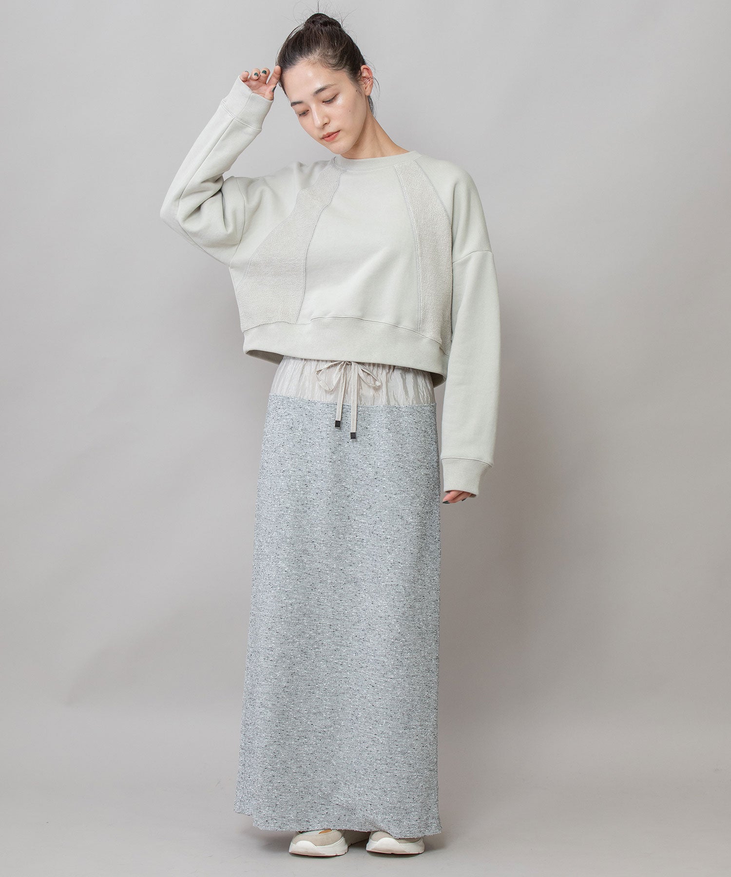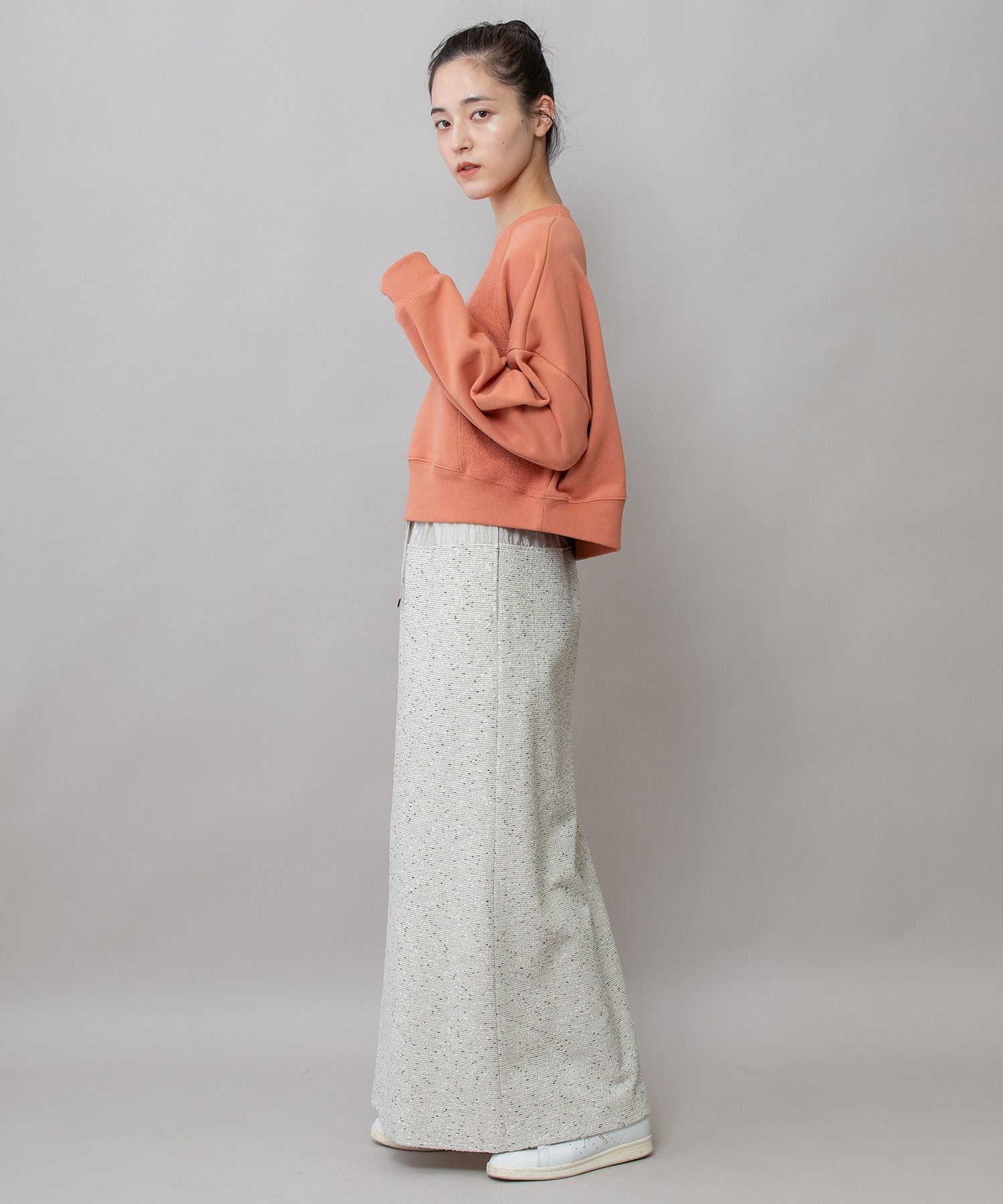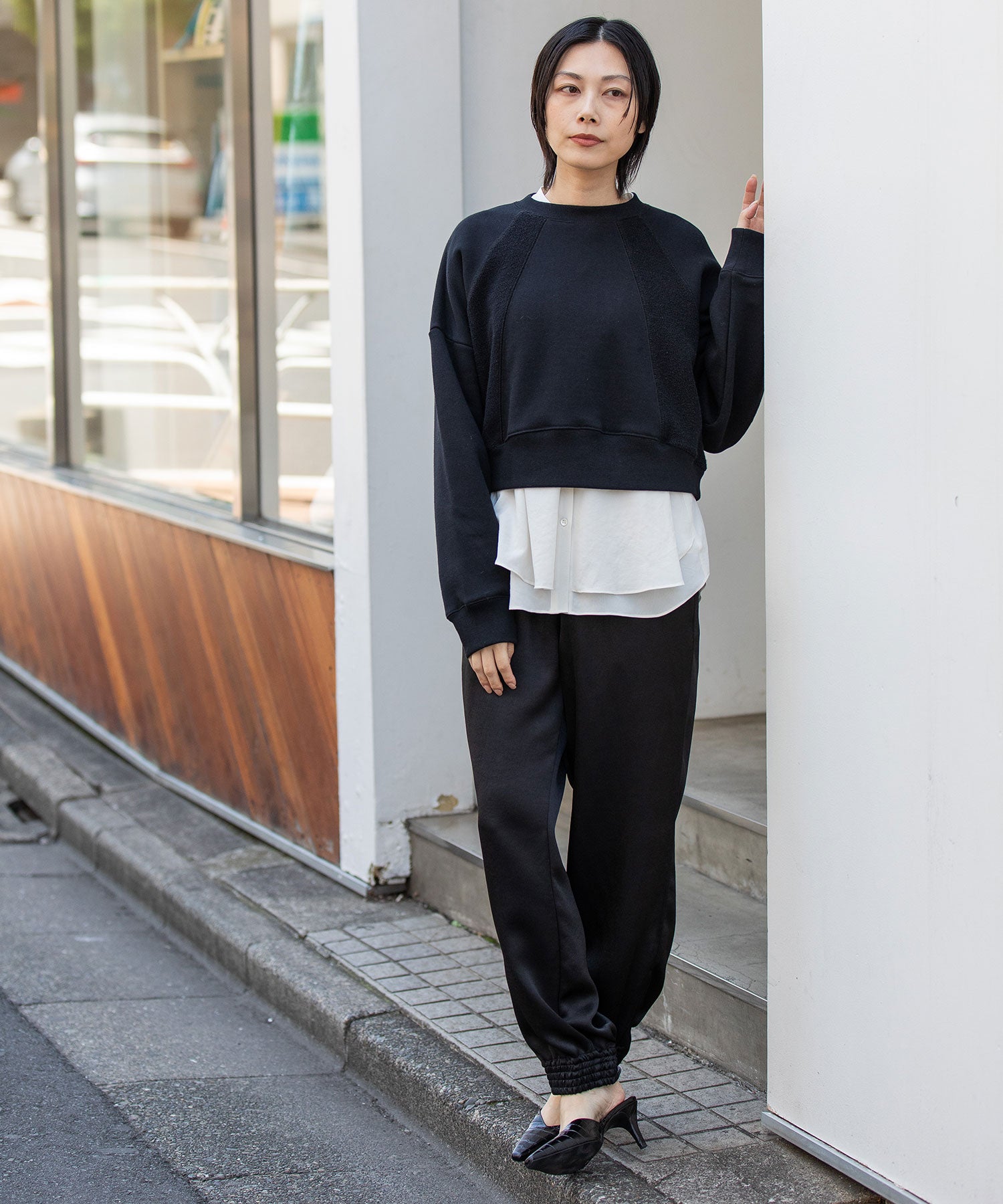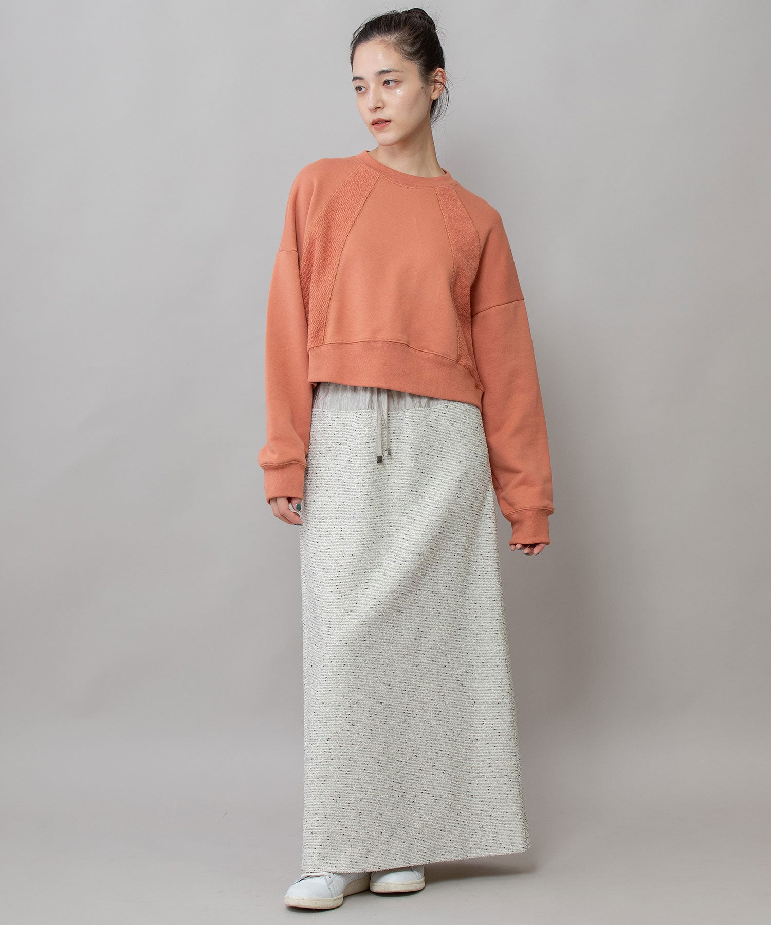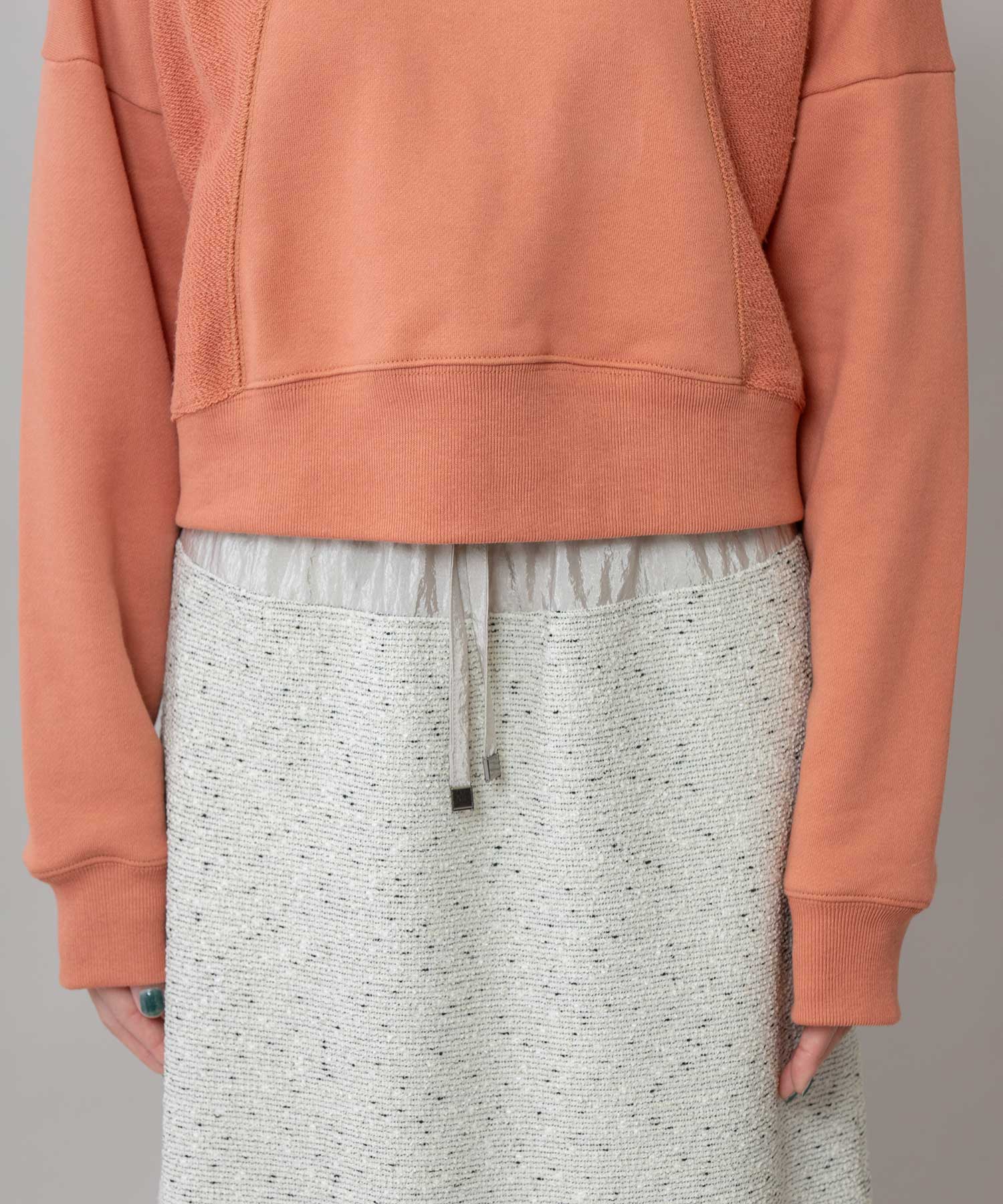 ラフに着られるコットン裏毛を使用し、ゆるっとした長めの袖にクロップド丈のバランスが新鮮なショートスウェットトップス。