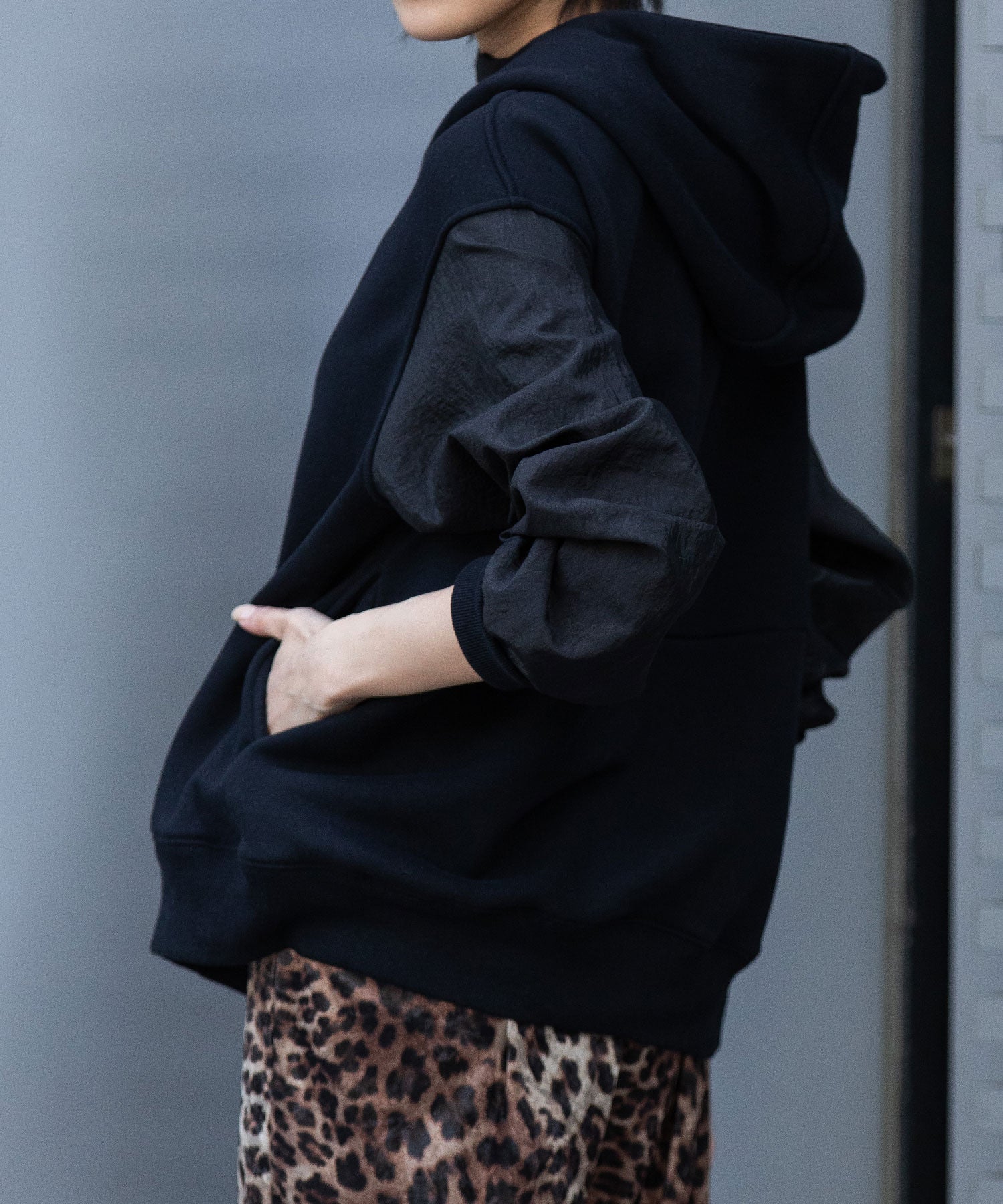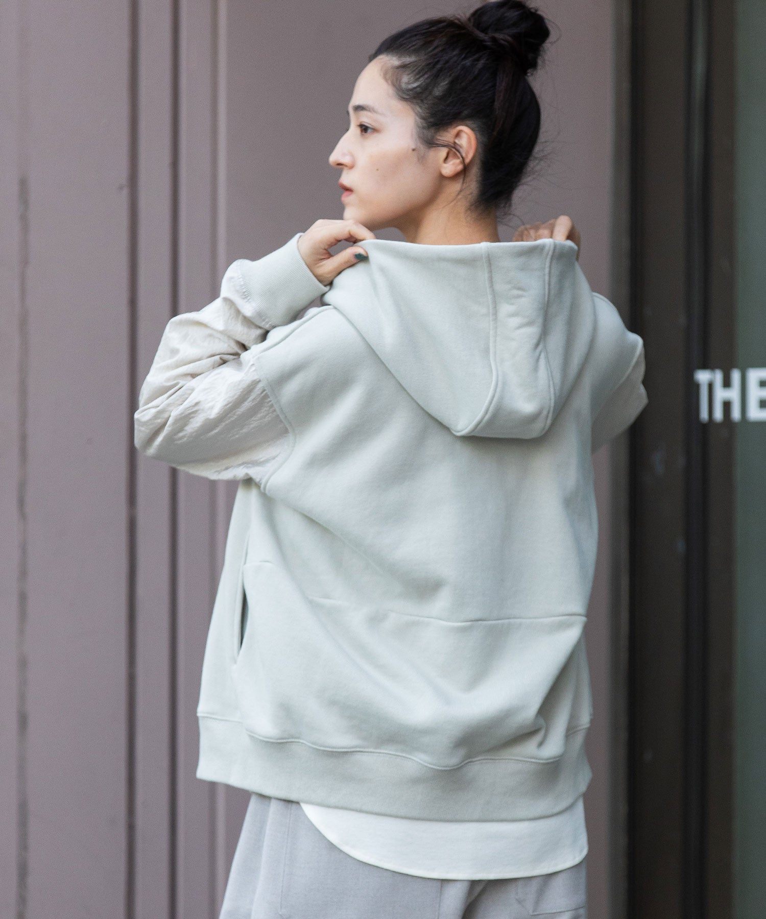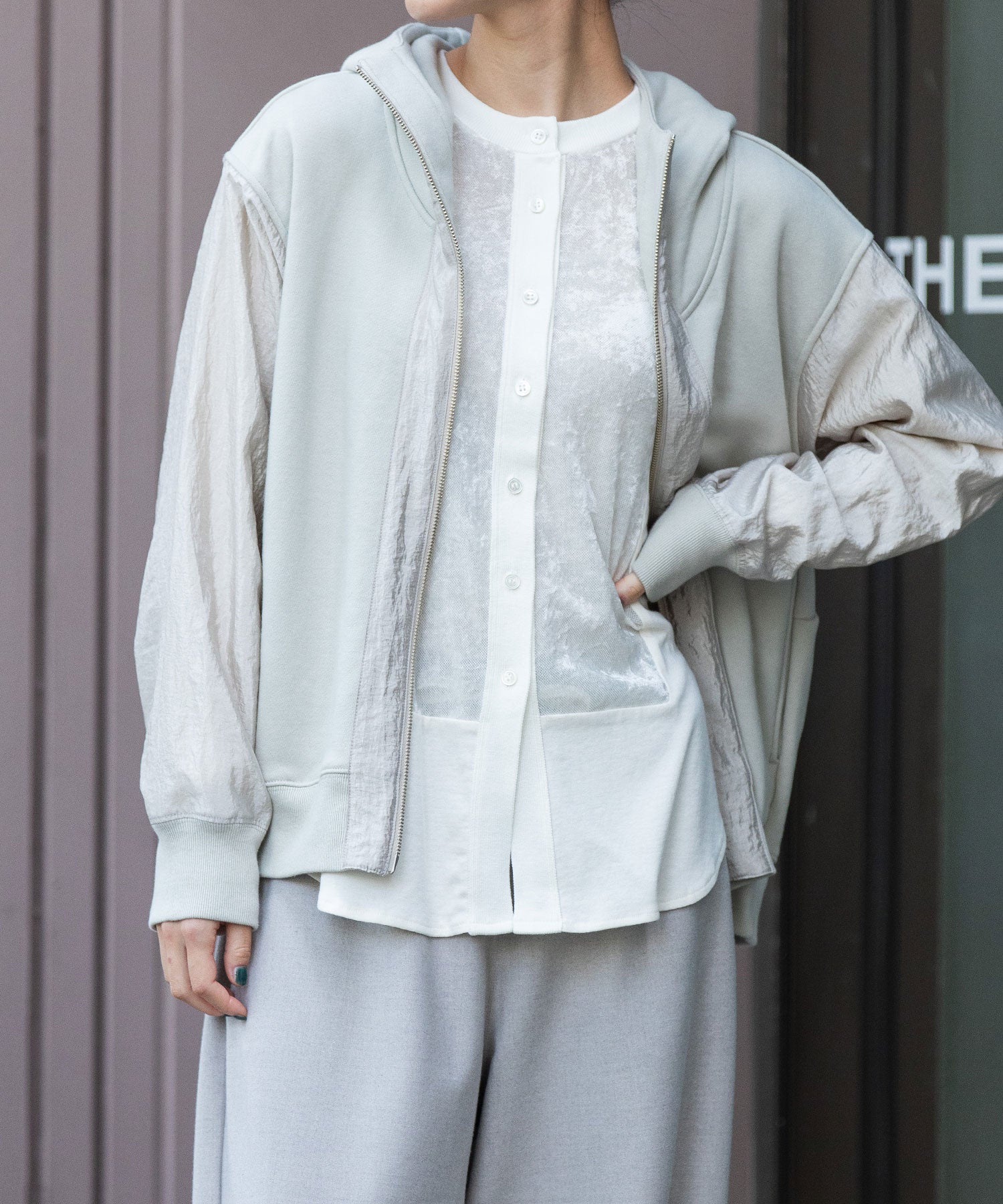 袖が薄手のナイロンなので、レイヤードもし易く、羽織りとしても万能ですが、アウターからフードを覗かせたスタイリングもおすすめです。