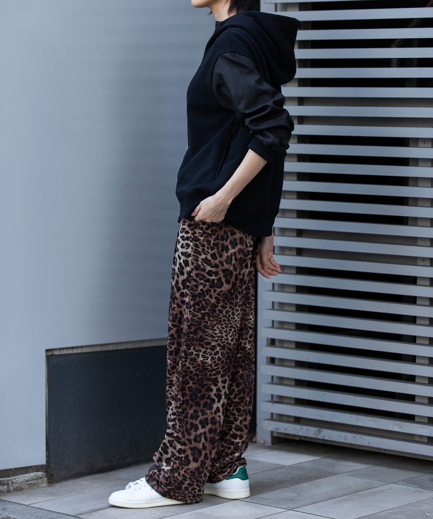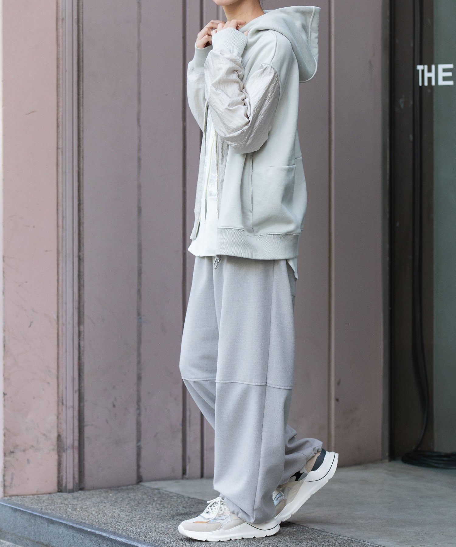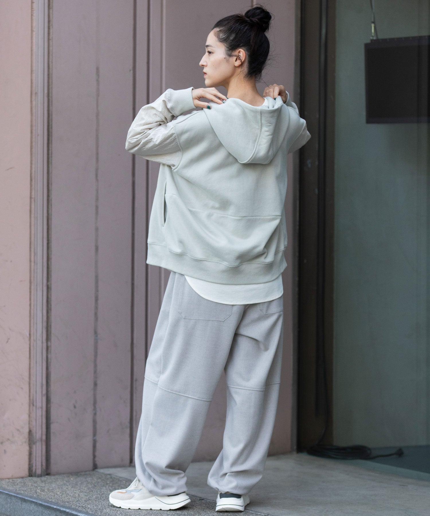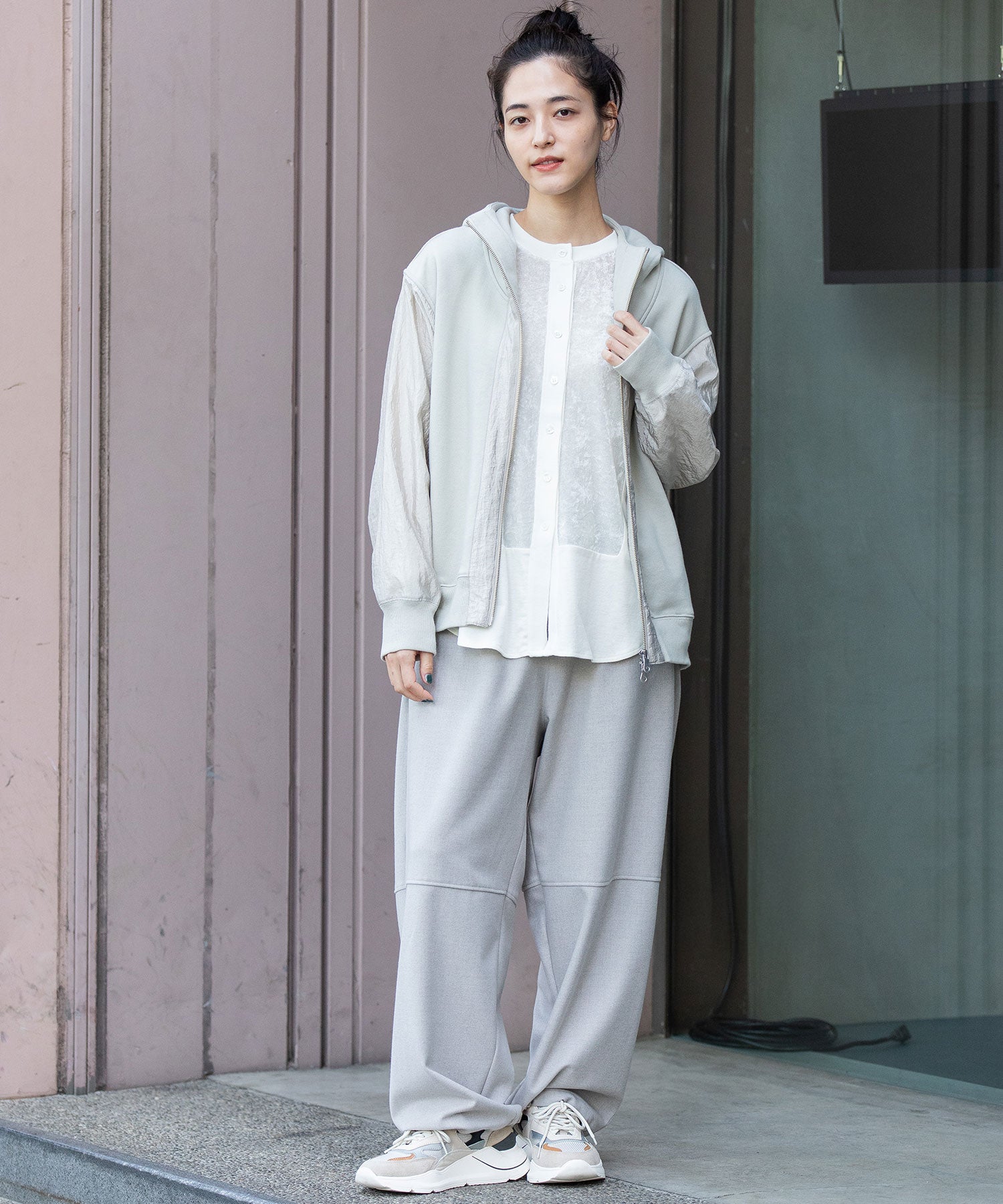 袖が薄手のナイロンなので、レイヤードもし易く、羽織りとしても万能ですが、アウターからフードを覗かせたスタイリングもおすすめです。