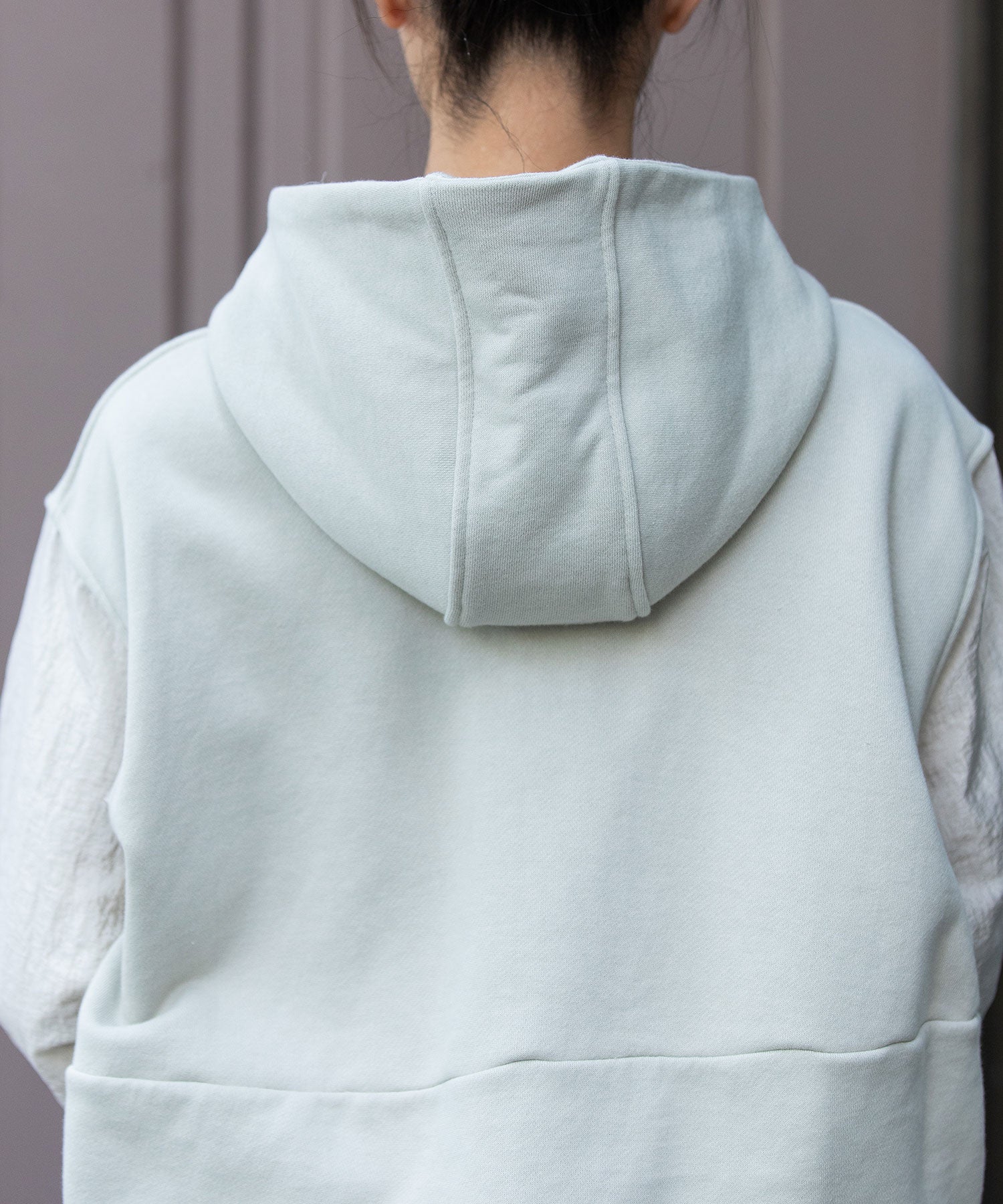 フードの衿高と後身頃ボリュームを持たせた女性らしい一枚。
