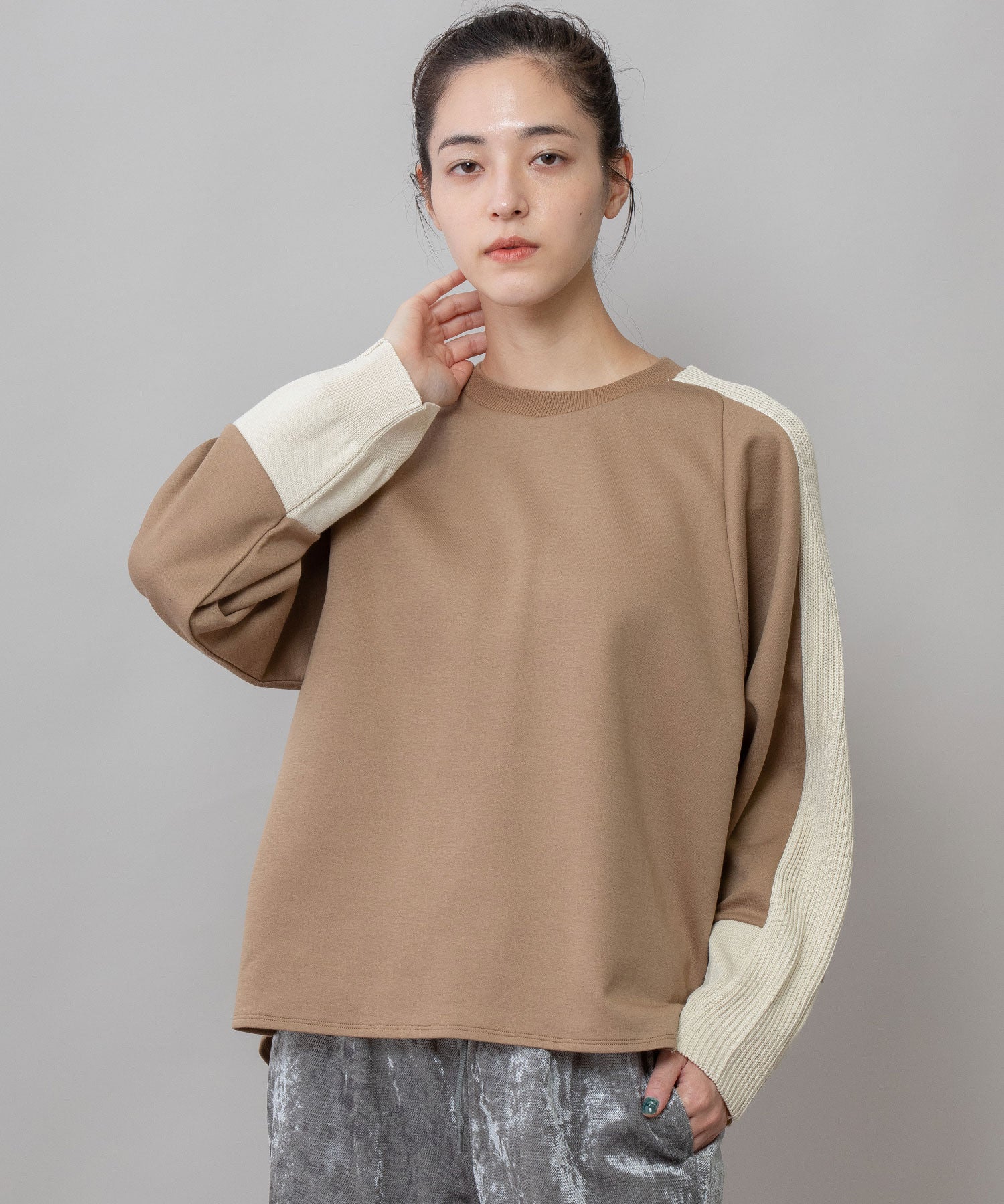 ■キャメル:穏やかで温かみのあるキャメルに、クリーンなホワイトの袖が爽やかさを添える配色のカラー