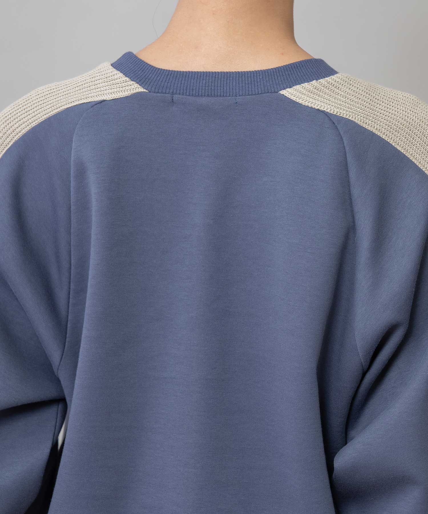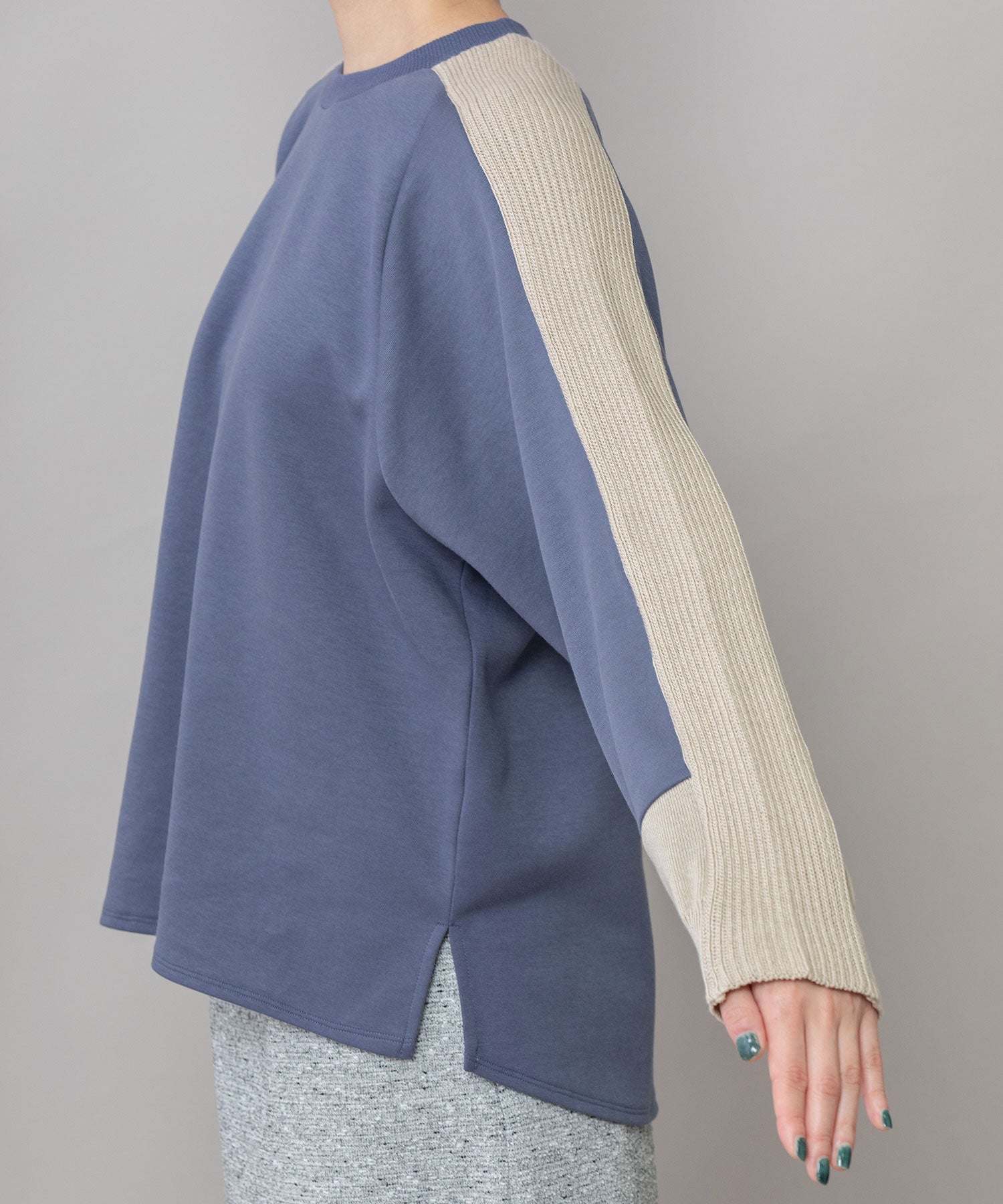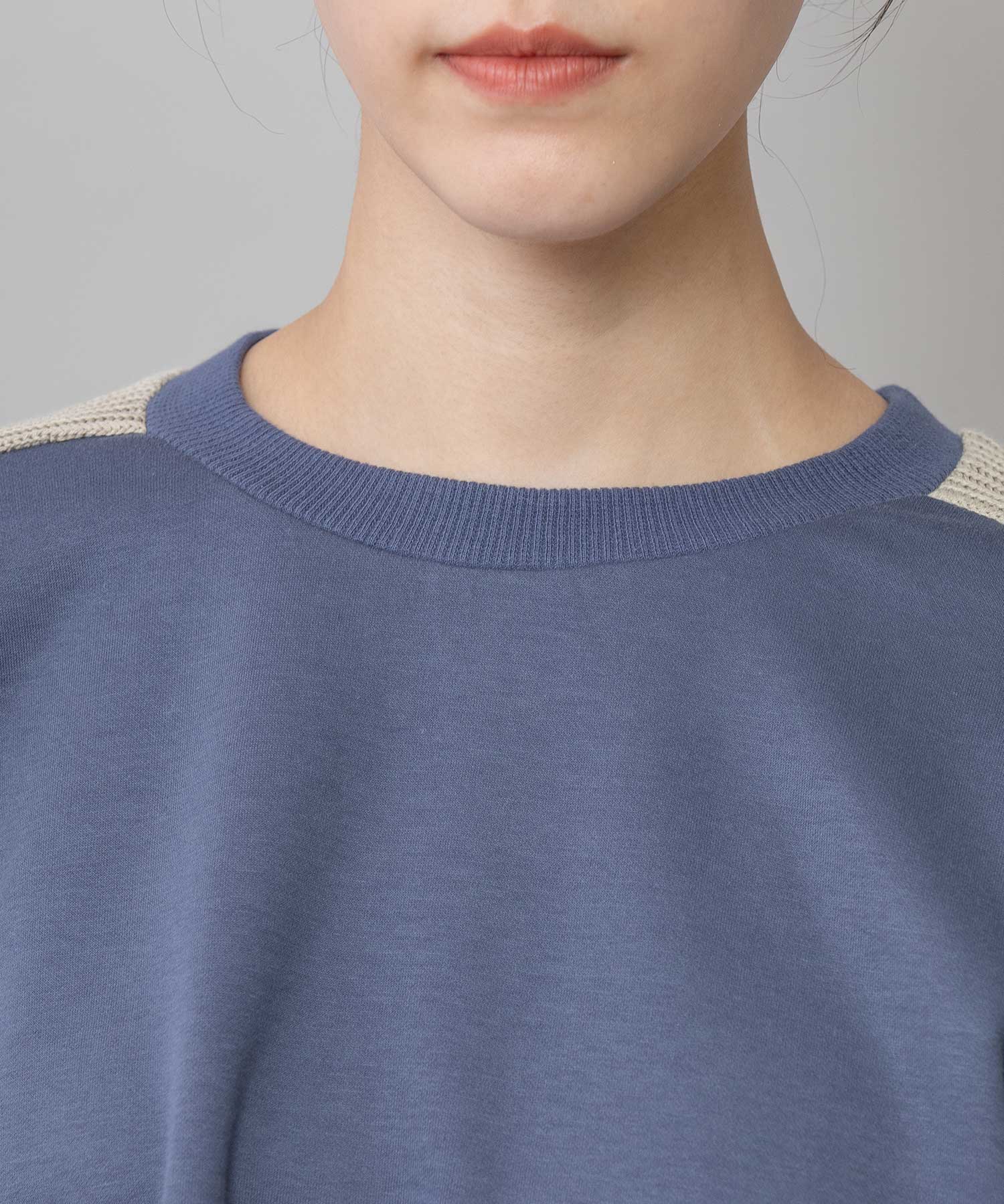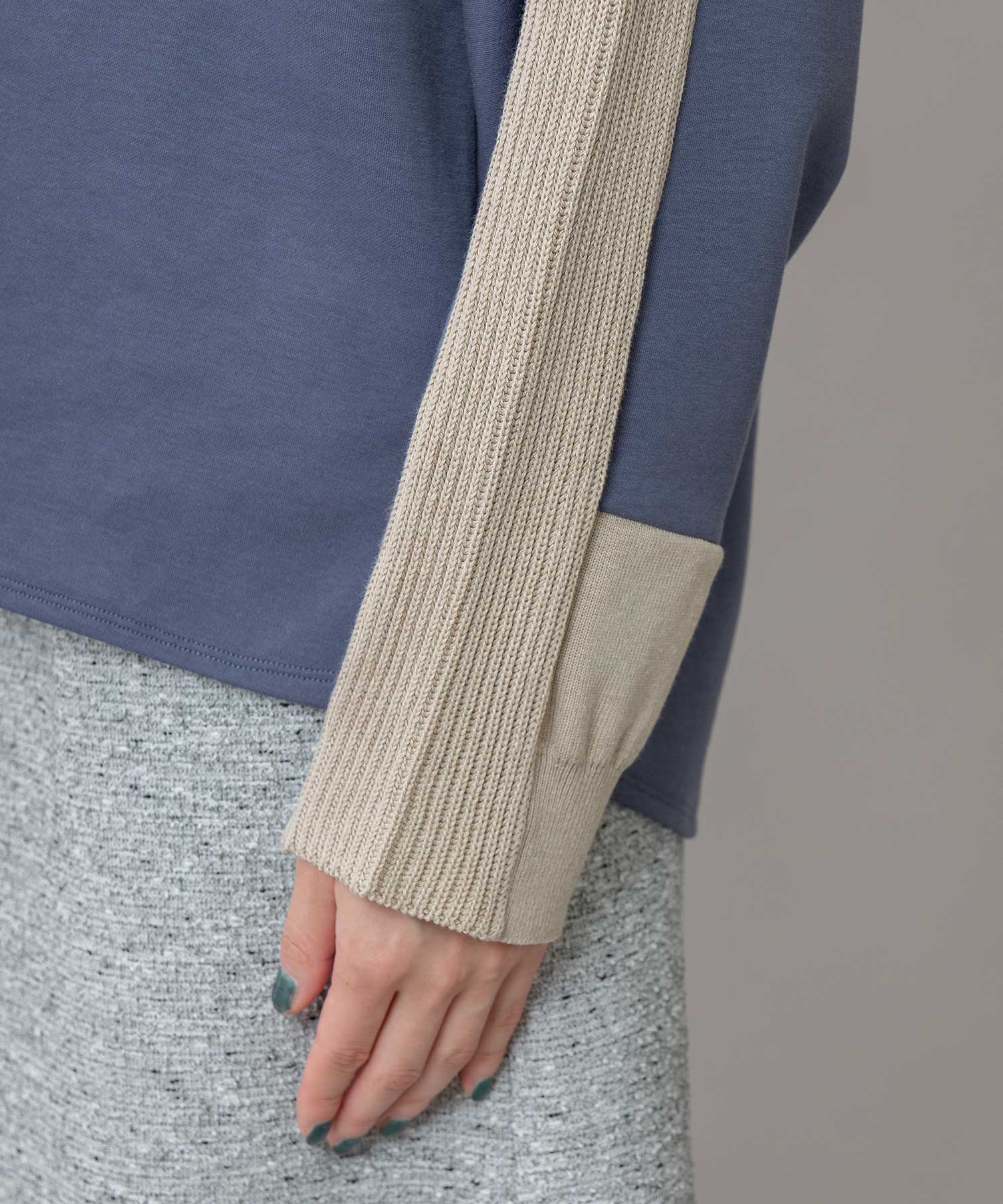 ゆとりのあるサドルスリーブデザインをベースに、袖山にミドルゲージでテープ状に編み立てたニットと、袖口にはリブ編みとフラット見えする編地を続きで編み、ぱつんとカットしたような切り替えを入れてMunichらしいオリジナリティーを加えたトップスです。
