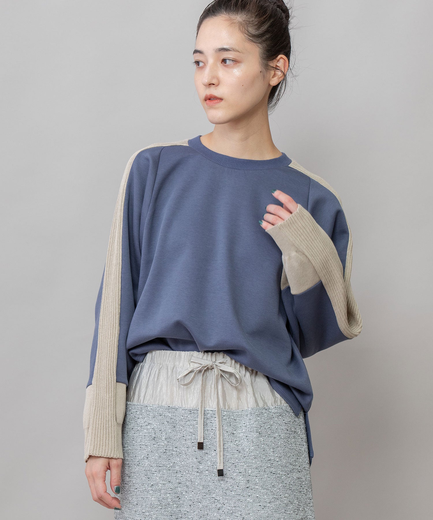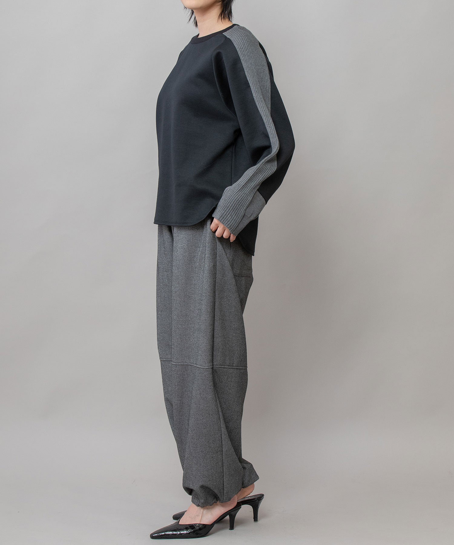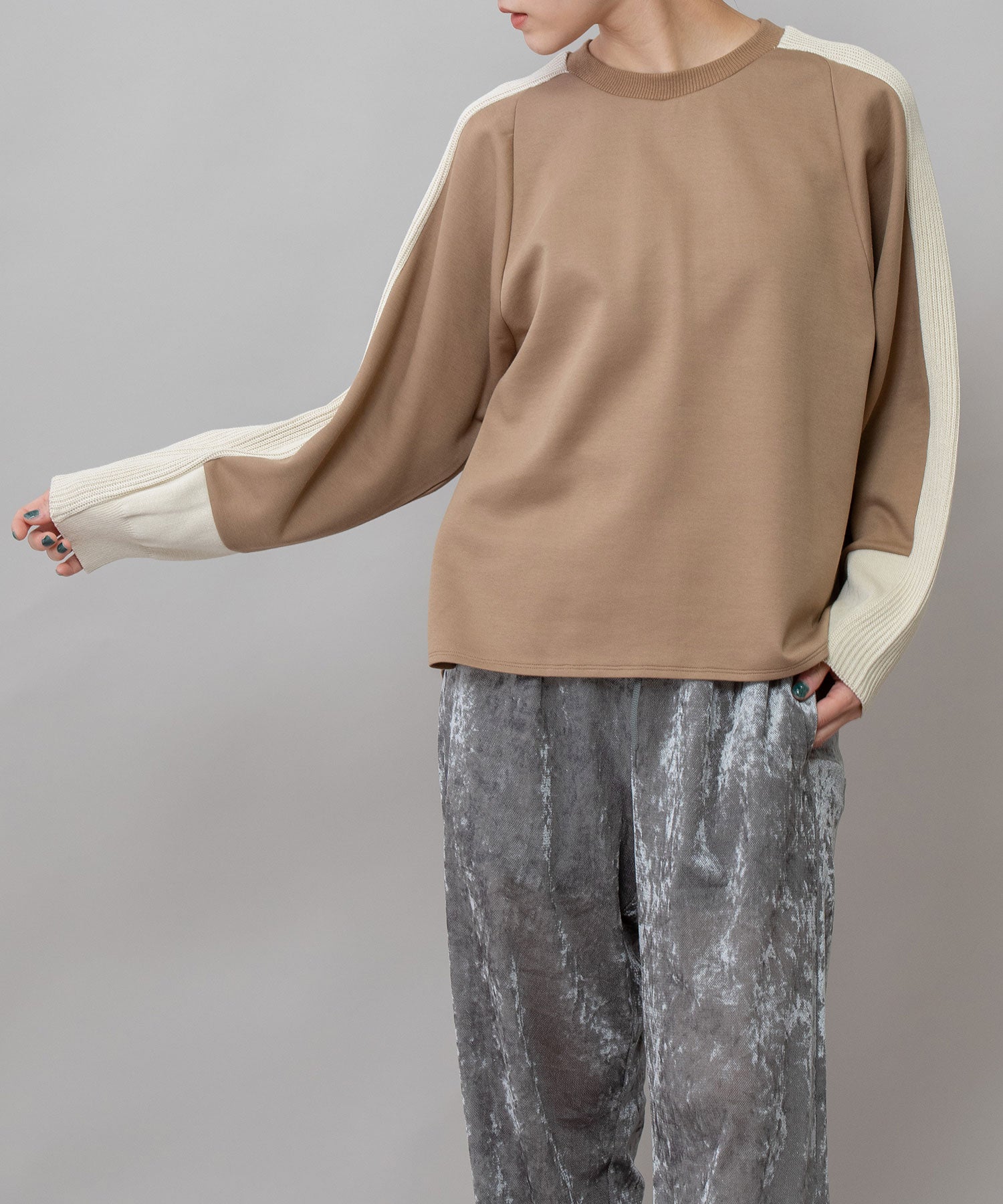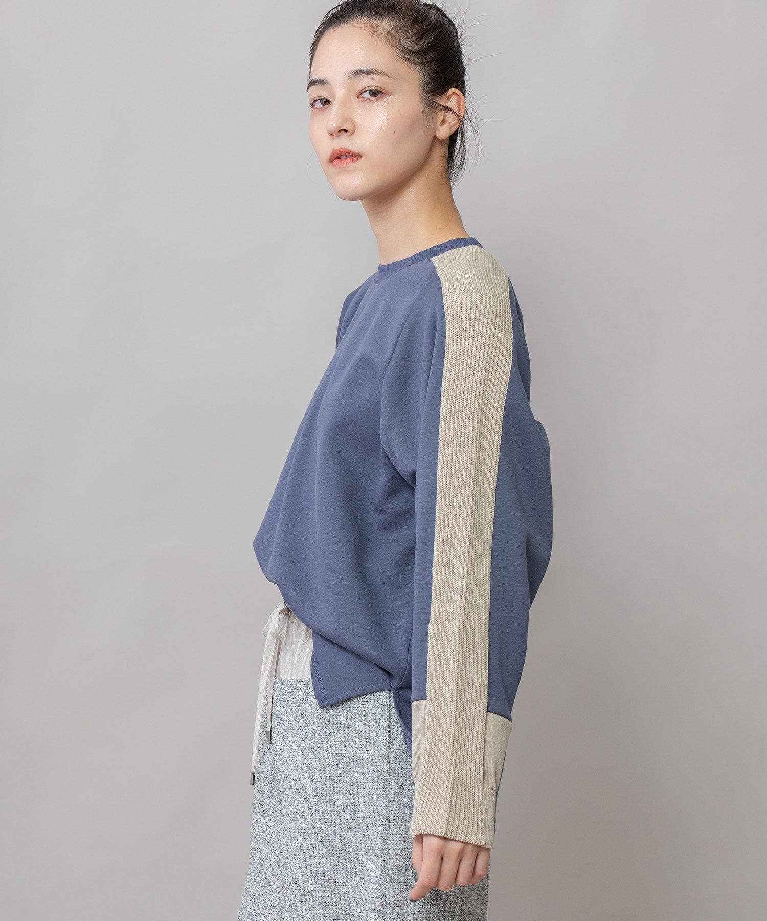 ゆとりのあるサドルスリーブデザインをベースに、袖山にミドルゲージでテープ状に編み立てたニットと、袖口にはリブ編みとフラット見えする編地を続きで編み、ぱつんとカットしたような切り替えを入れてMunichらしいオリジナリティーを加えたトップスです。
