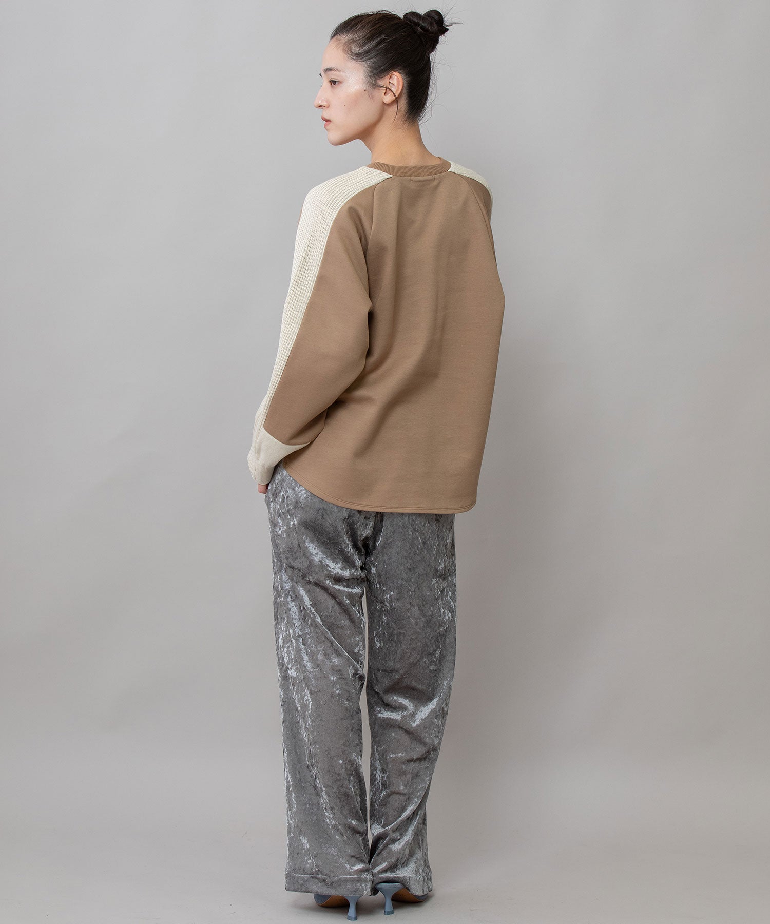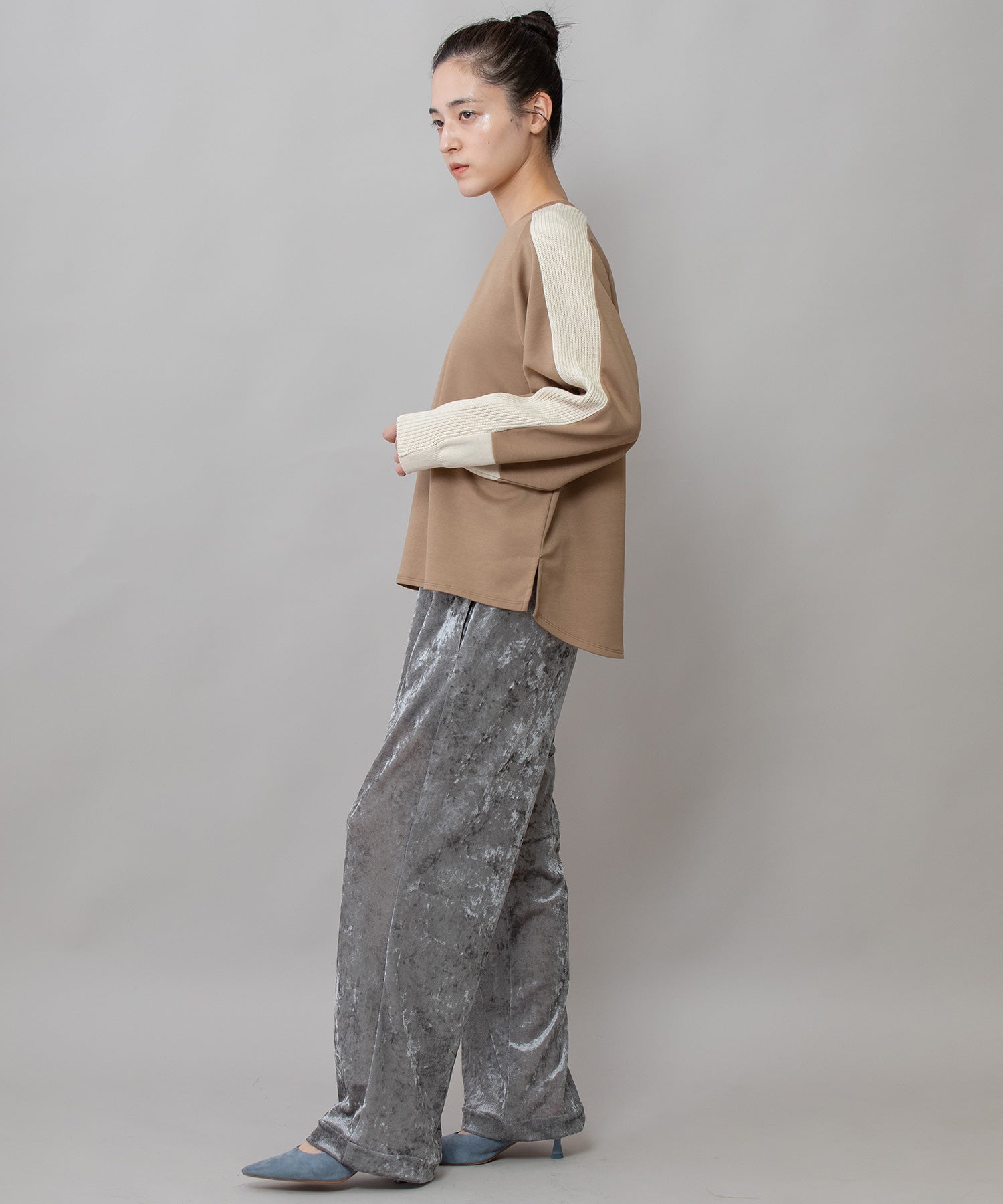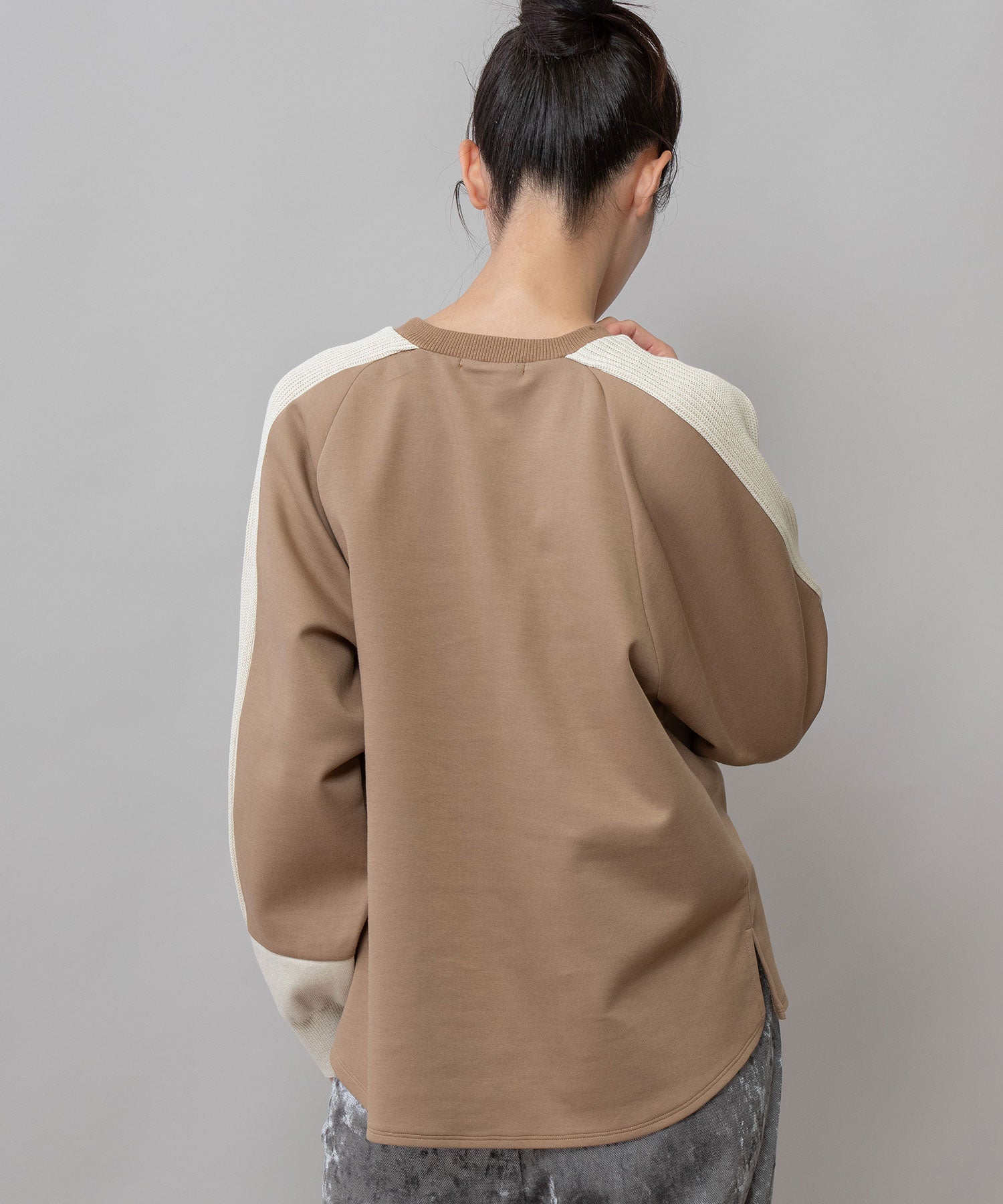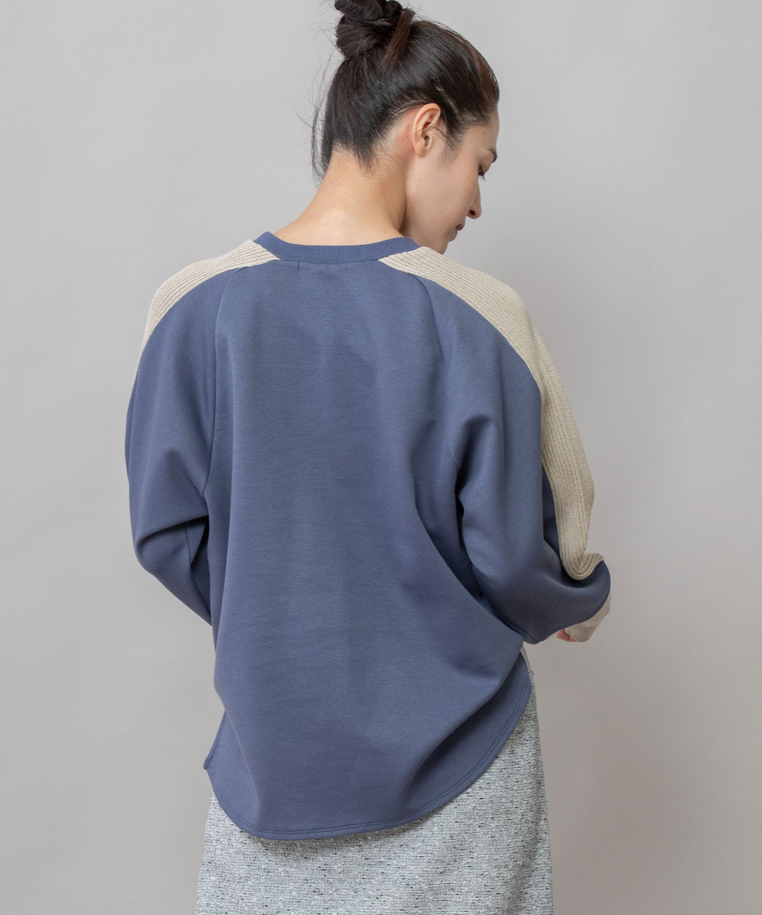 ゆとりのあるサドルスリーブデザインをベースに、袖山にミドルゲージでテープ状に編み立てたニットと、袖口にはリブ編みとフラット見えする編地を続きで編み、ぱつんとカットしたような切り替えを入れてMunichらしいオリジナリティーを加えたトップスです。
