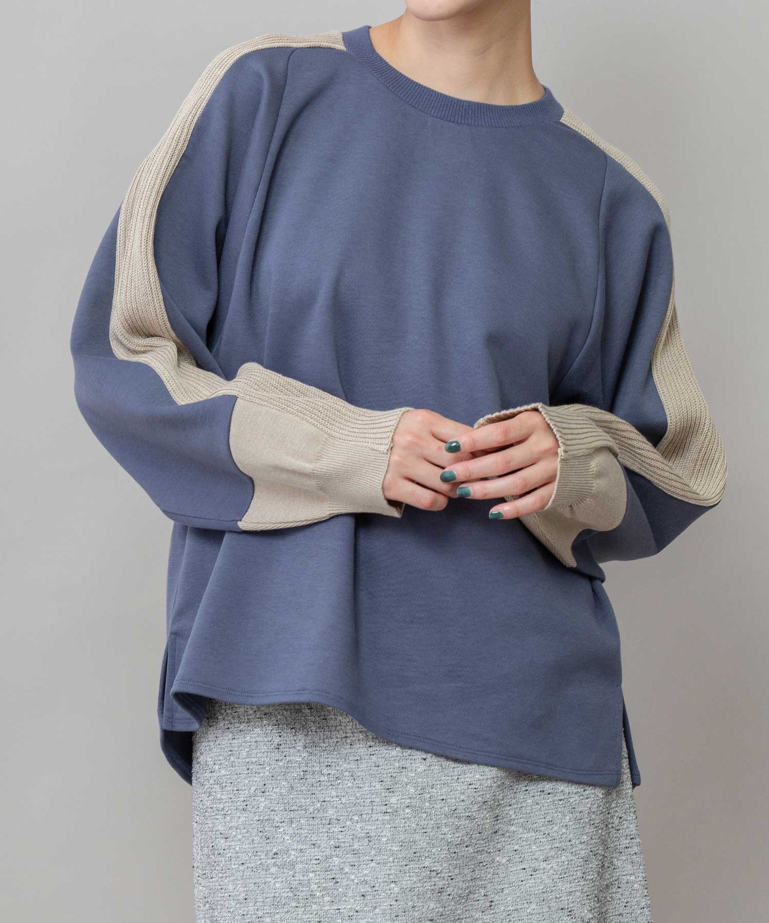 ■ブルー:爽やかさと落ち着きを兼ね備えたブルーに、まろやかなベージュの袖が絶妙なコントラストを演出するカラー